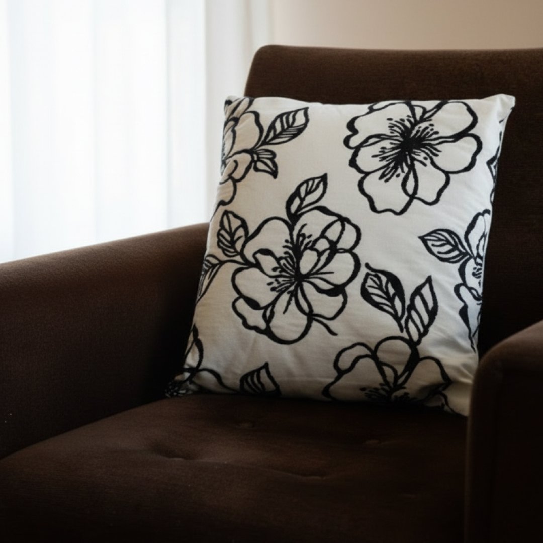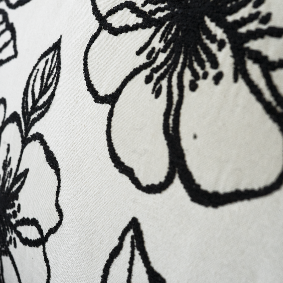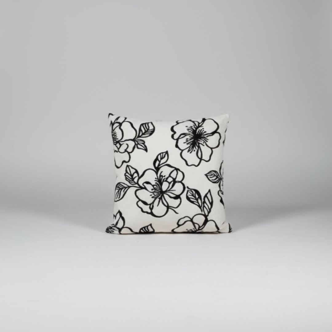 Almofada decorativa de formato quadrado com enchimento incluído. O revestimento têxtil apresenta um padrão floral contrastante em tons de preto sobre um fundo creme/branco. Por ser um artigo proveniente de hotelaria, pode apresentar algum pós de uso decorrente do armazenamento, mas a capa permite uma limpeza simples.