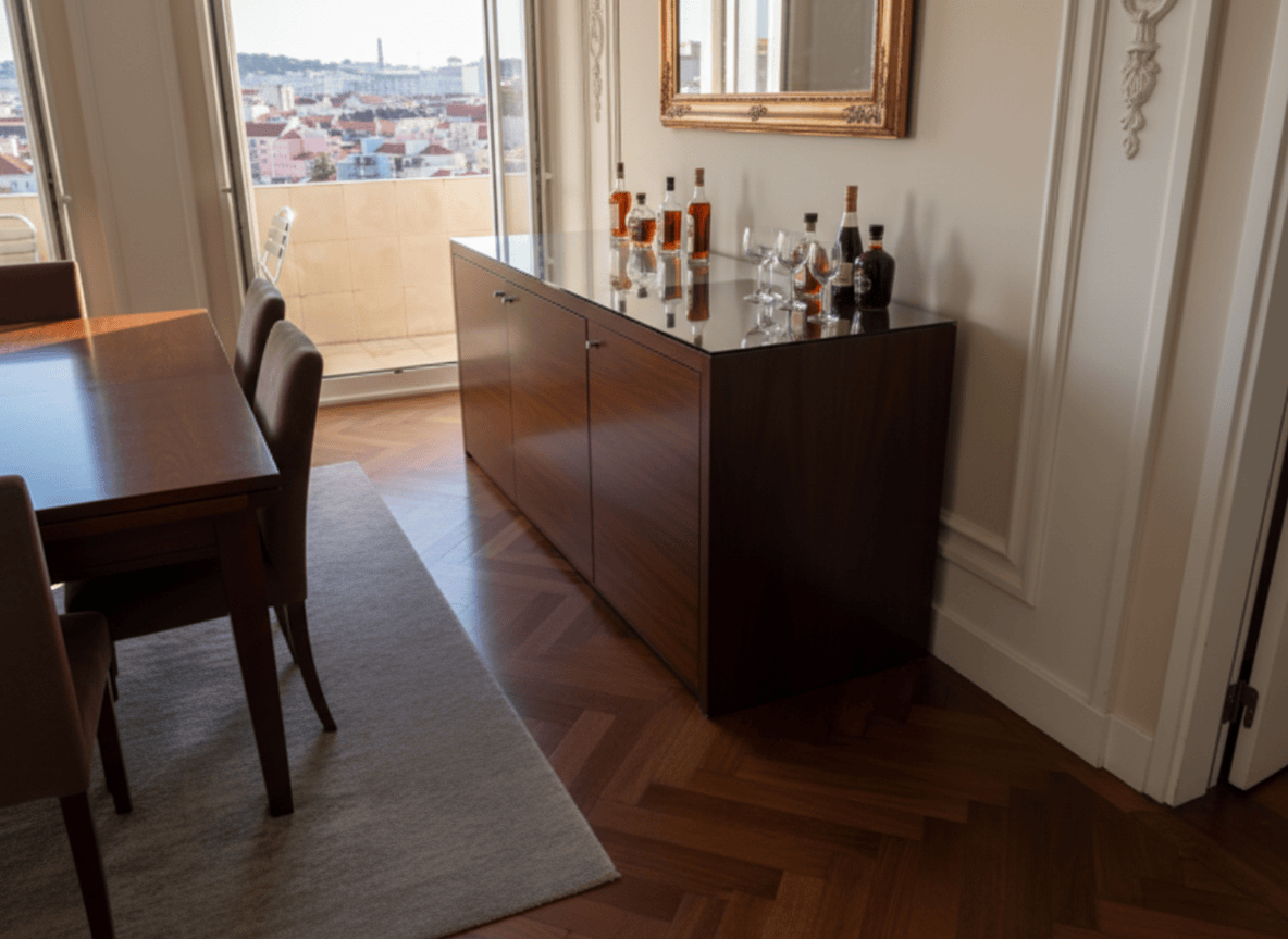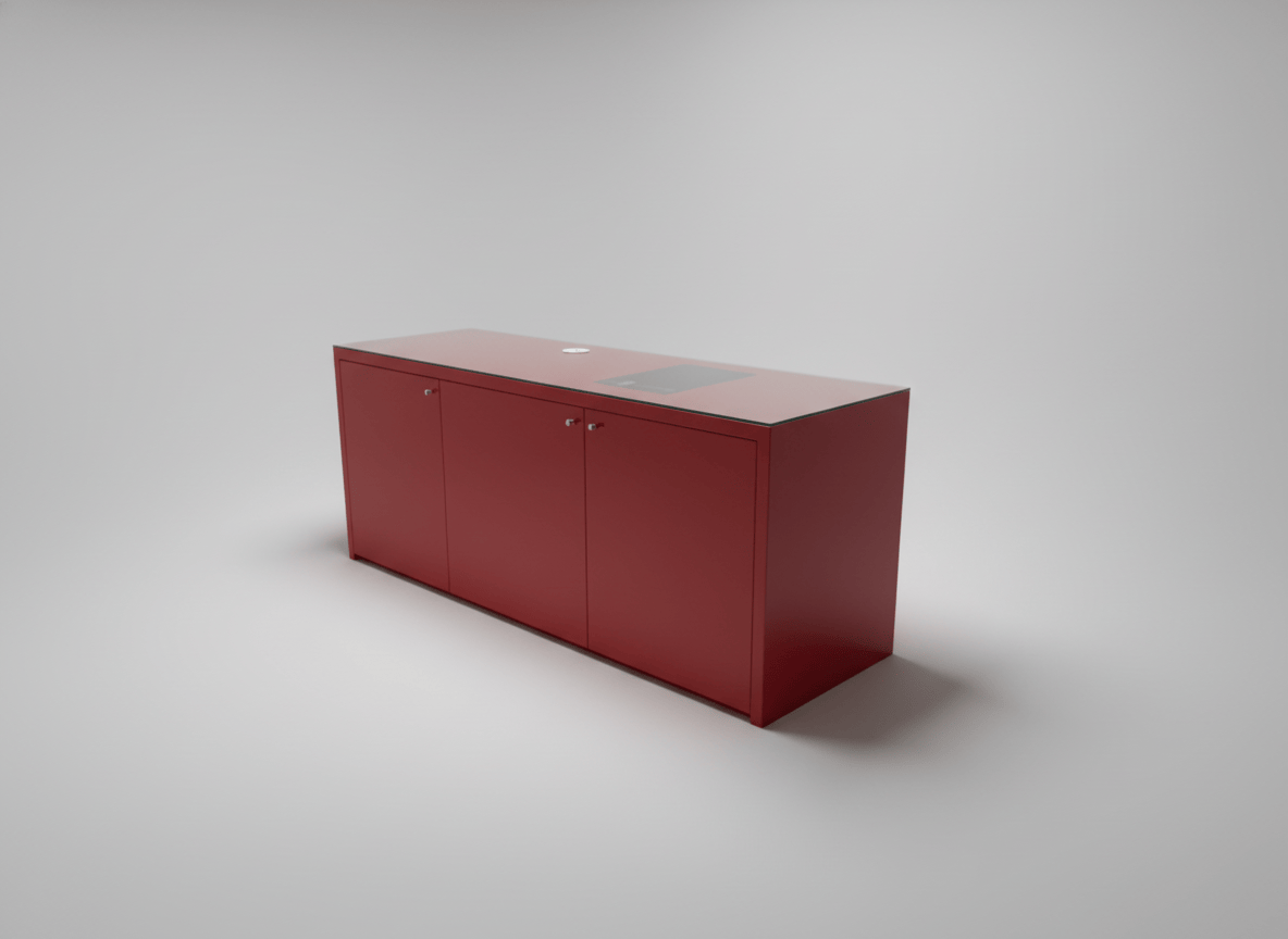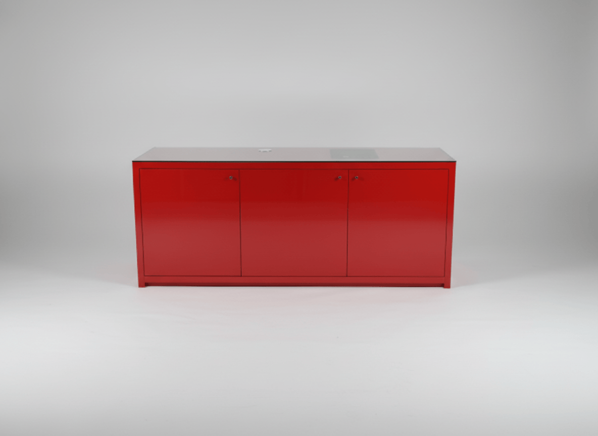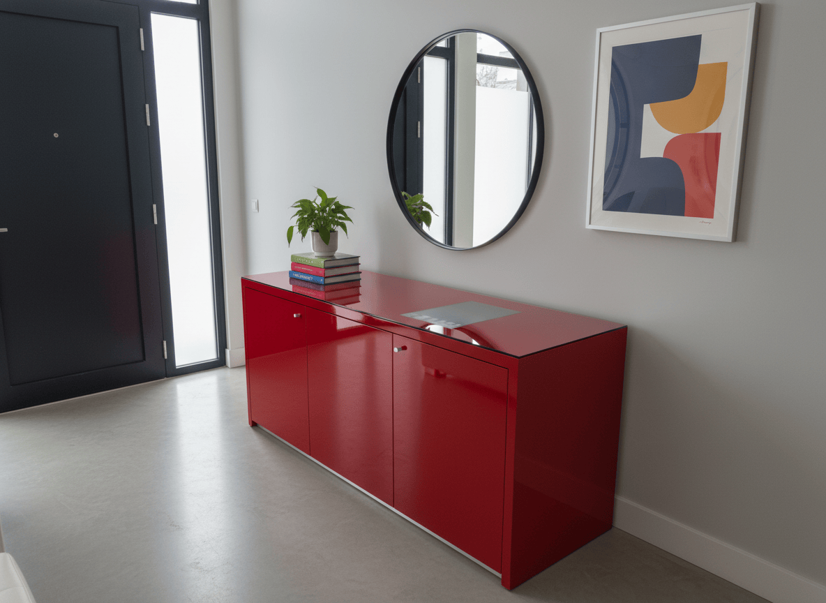 Aparador/Móvel de sala moderno com tampo de vidro temperado, ideal para arrumação em qualquer espaço. O corpo está disponível em acabamento lacado de alto brilho (branco ou vermelho) ou em folheado de madeira escura (wengué). As variantes observadas incluem modelos com duas ou três portas, equipadas com puxadores metálicos discretos. As superfícies apresentam um brilho elegante, com o tampo de vidro a conferir um toque de sofisticação. Em excelente estado de conservação, este artigo em segunda mão pode apresentar sinais mínimos de uso, como pequenos riscos superficiais no tampo de vidro ou na superfície lacada/folheada, visíveis apenas sob inspeção atenta, sem danos estruturais visíveis.