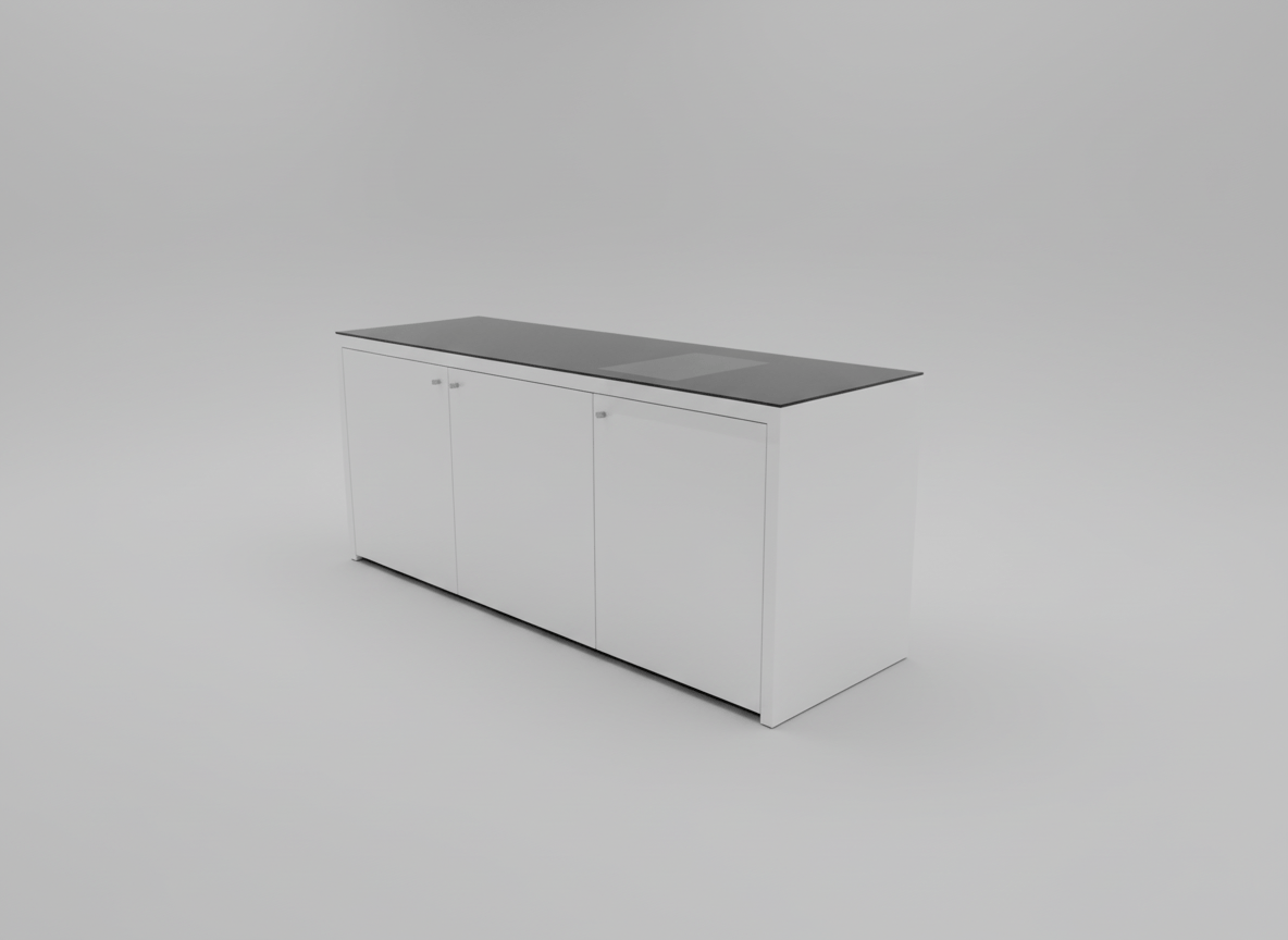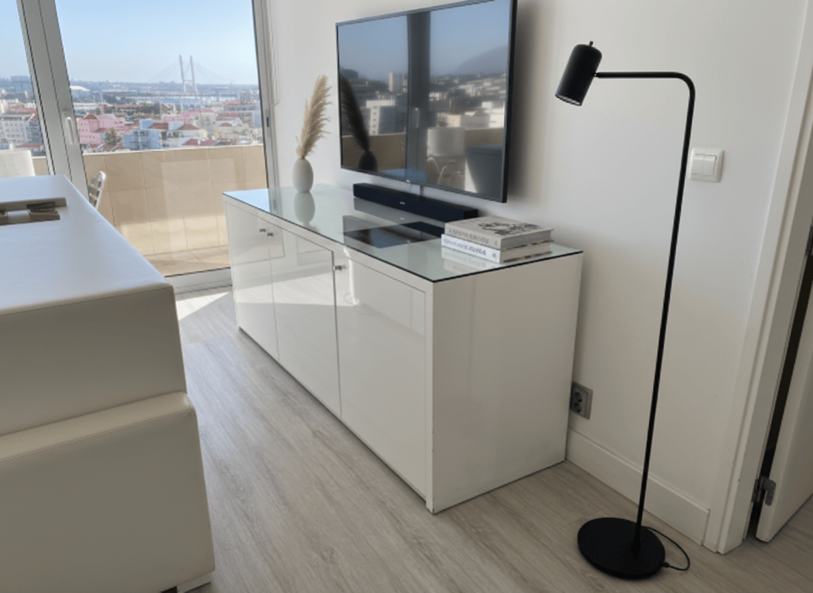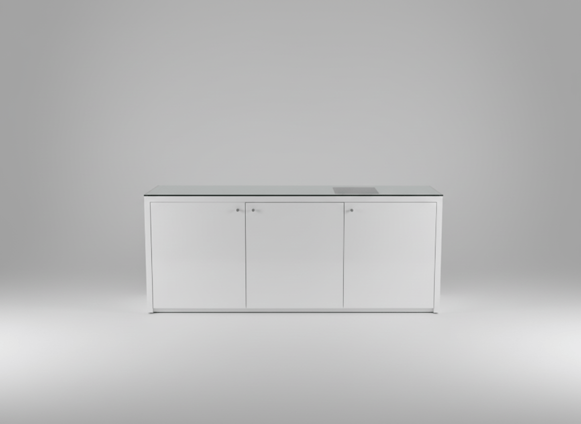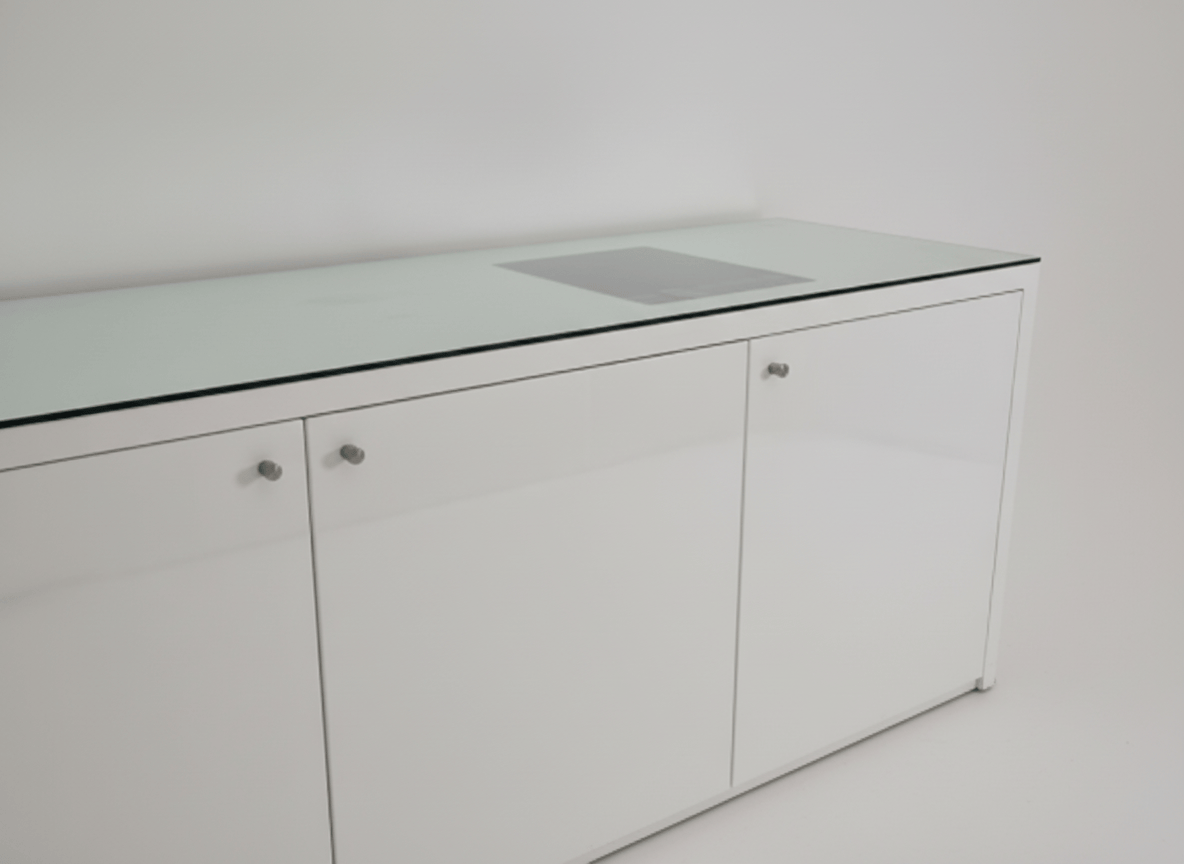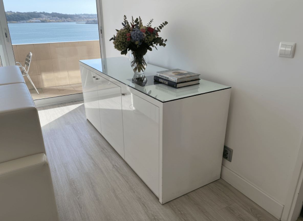 Aparador/Móvel de sala moderno com tampo de vidro temperado, ideal para arrumação em qualquer espaço. O corpo está disponível em acabamento lacado de alto brilho (branco ou vermelho) ou em folheado de madeira escura (wengué). As variantes observadas incluem modelos com duas ou três portas, equipadas com puxadores metálicos discretos. As superfícies apresentam um brilho elegante, com o tampo de vidro a conferir um toque de sofisticação. Em excelente estado de conservação, este artigo em segunda mão pode apresentar sinais mínimos de uso, como pequenos riscos superficiais no tampo de vidro ou na superfície lacada/folheada, visíveis apenas sob inspeção atenta, sem danos estruturais visíveis.