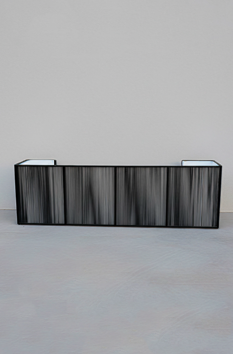 Candeeiro de parede de tipologia aplique, caracterizado por um design contemporâneo de linhas retas e perfil subtil. A peça apresenta uma estrutura metálica de suporte em tom cinza prateado, equipada com dois casquilhos para lâmpadas, proporcionando uma iluminação indireta e envolvente. O painel frontal decorativo exibe um padrão linear vertical em tons de cinza e preto, conferindo uma estética moderna e sofisticada que filtra a luz de forma suave.