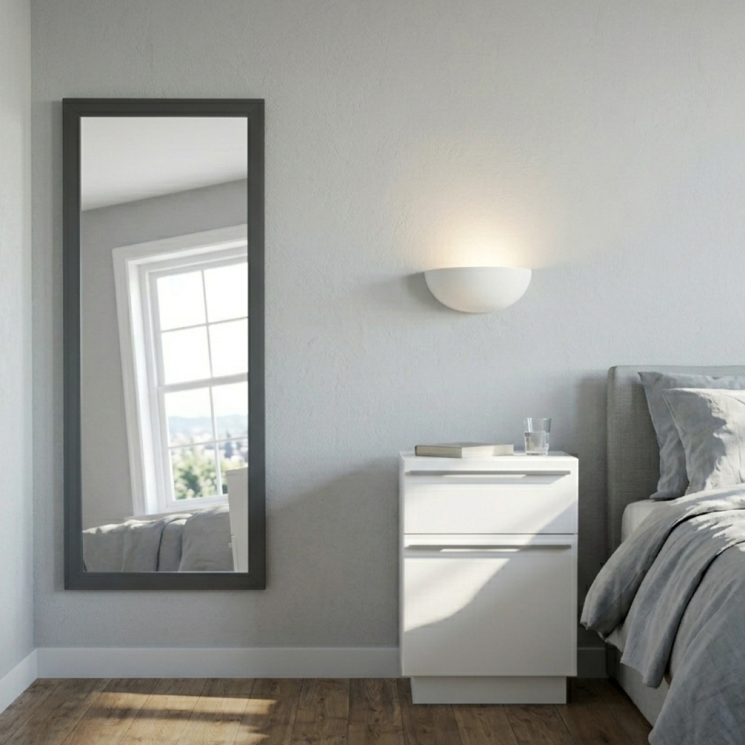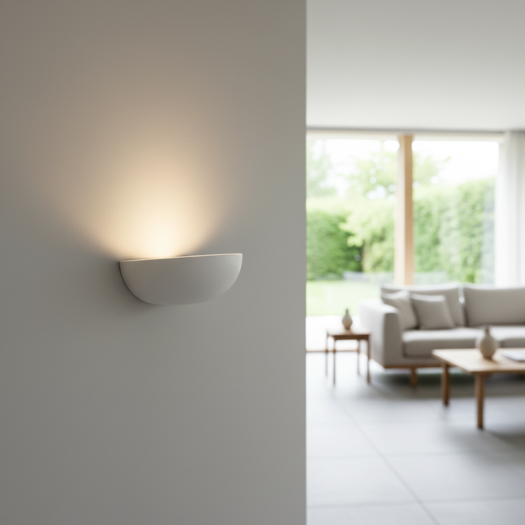 Aplique de parede em formato de meia-lua, produzido em cerâmica com acabamento mate. A peça foi desenhada para projetar luz indireta, sendo adequada para iluminação de realce em corredores ou zonas de descanso. Apresenta fabrico nacional e sistema de fixação simples. Por ser um artigo proveniente de hotelaria, pode apresentar algum pós de uso decorrente do armazenamento, mas o material permite que se limpe facilmente com um pano húmido.