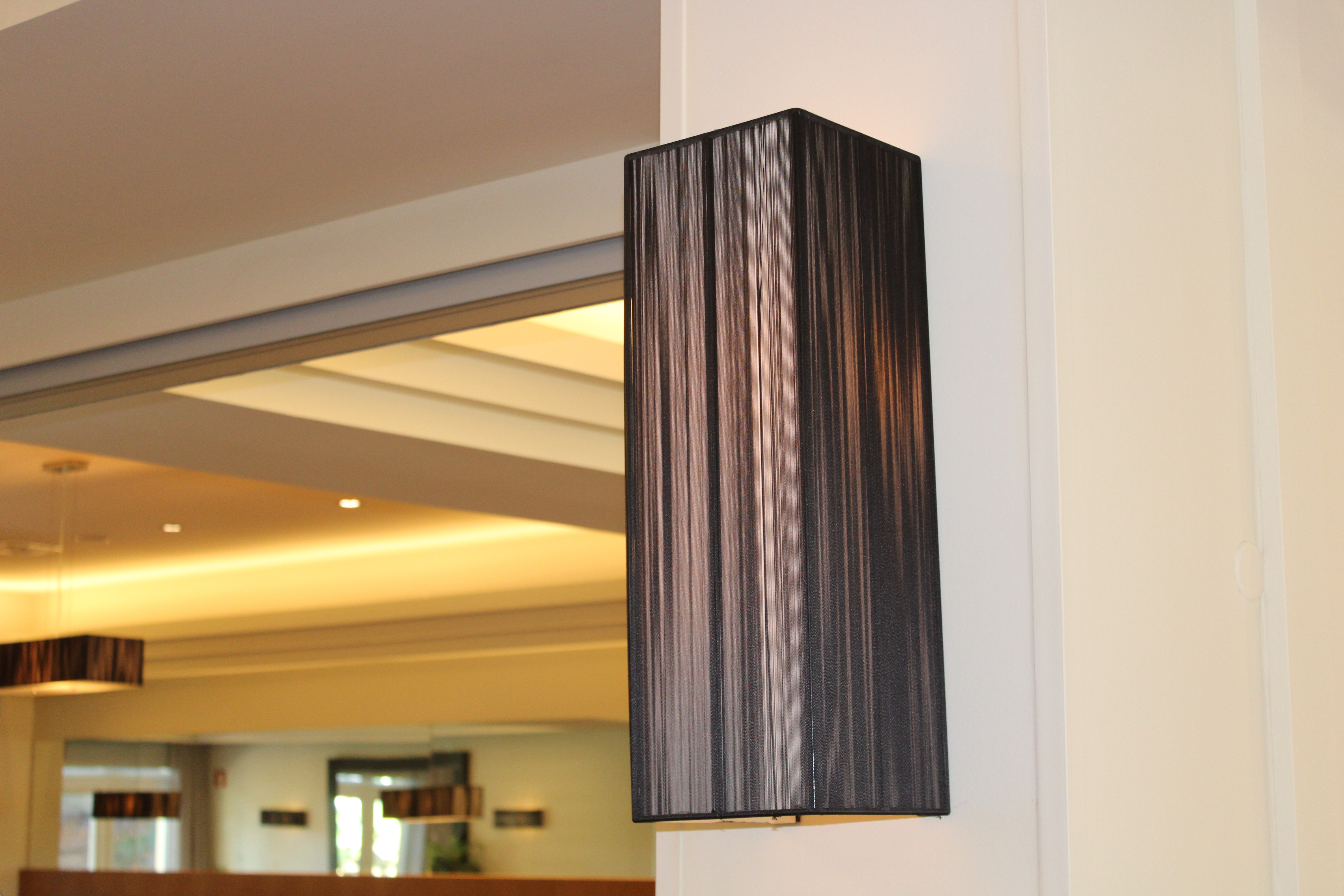 Aplique de parede moderno com estrutura retangular e acabamento em tecido preto com padrão estriado vertical. O design simples e contemporâneo permite integrar facilmente a peça em espaços de hotelaria, salas de estar, corredores ou áreas de receção.