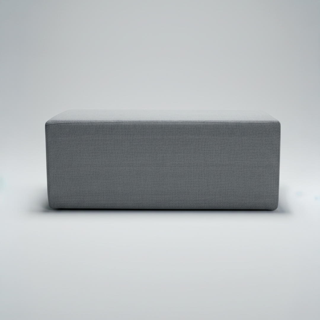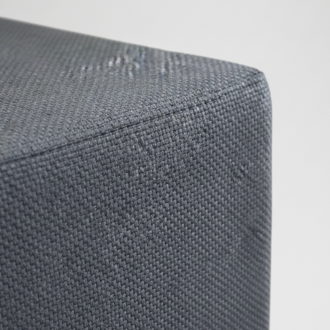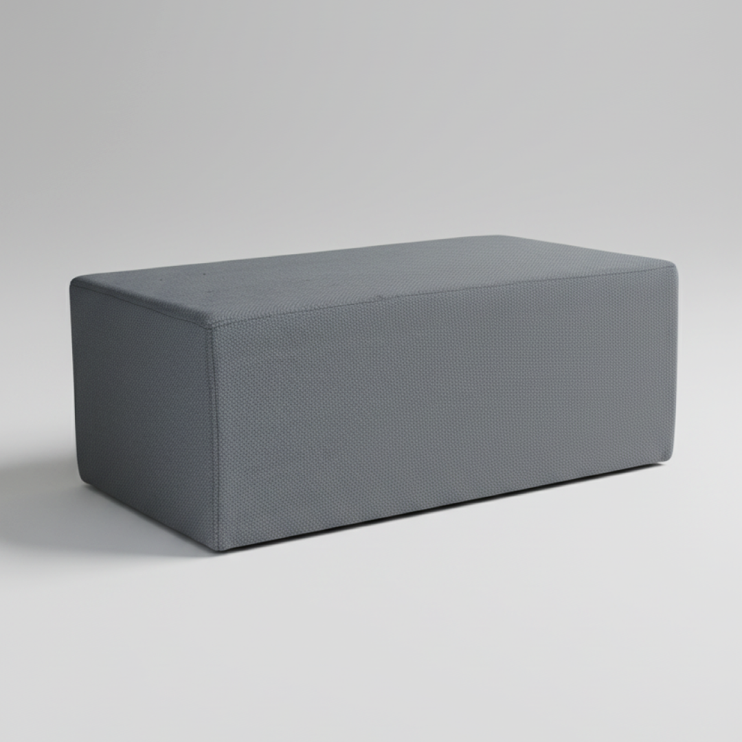 Apoio de pés de estrutura rígida com formato cúbico, totalmente revestido a tecido de cor azul. A peça apresenta um enchimento denso que garante uma superfície firme e estável, adequada para uso intensivo em zonas de descanso. Por ser um artigo proveniente de hotelaria, pode apresentar algum pós de uso decorrente do armazenamento, mas o material permite que se limpe facilmente com os produtos de limpeza têxtil adequados