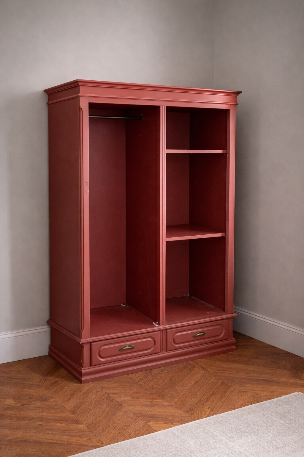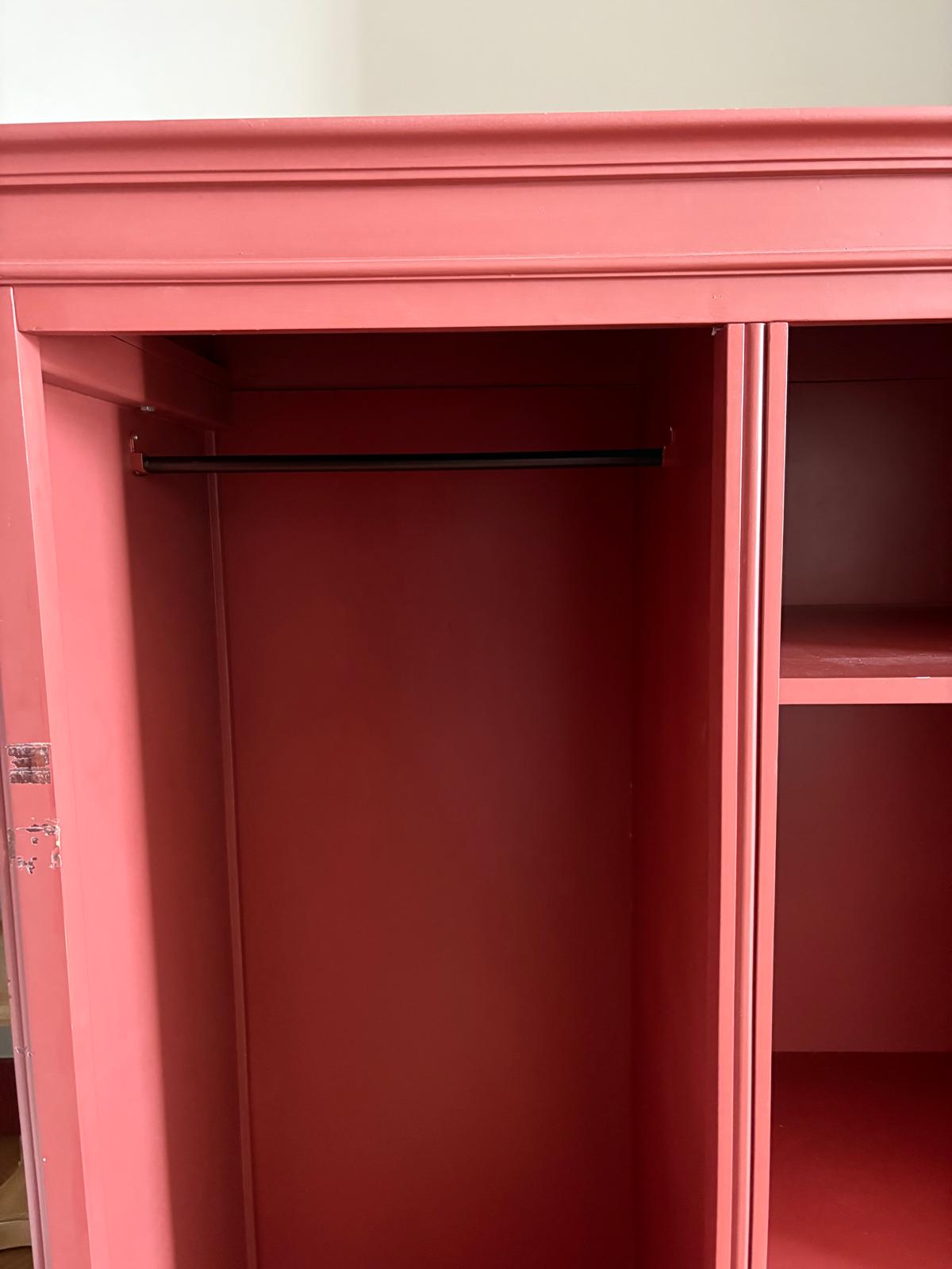 Armário aberto em madeira pintado em tom vermelho, com dois módulos interiores: um espaço para pendurar roupa e outro com prateleiras