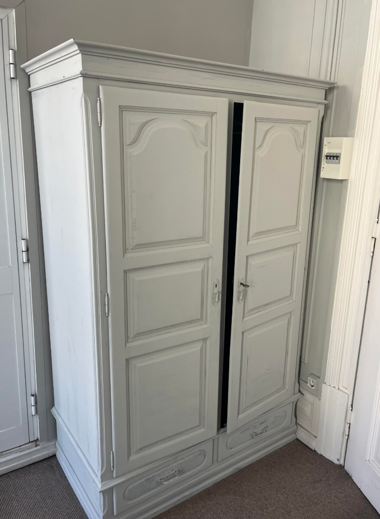 Armário de estilo clássico, em madeira, pintado em branco.