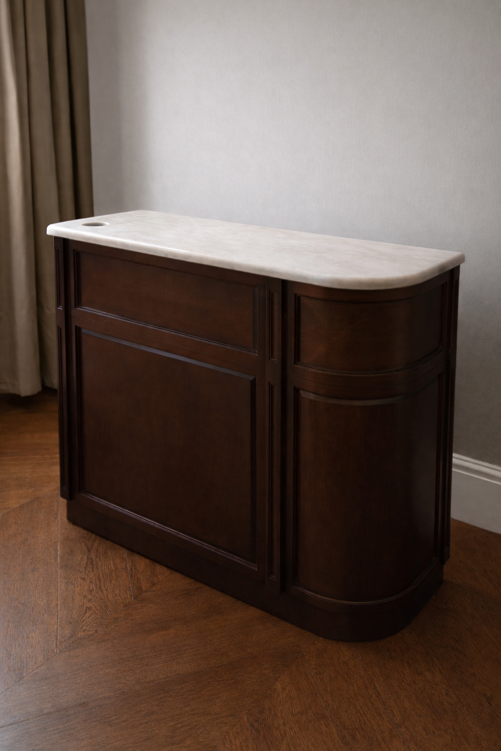 Tampo em mármore claro, liso, com cantos arredondados e acabamento polido.