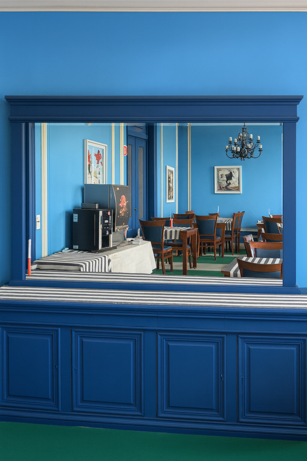 Balcão de apoio em madeira, pintado num elegante tom azul, com molduras decorativas e tampo revestido em tecido às riscas. Ideal para utilização em receções, bares de hotel, zonas lounge ou espaços comerciais. Espelho incluido