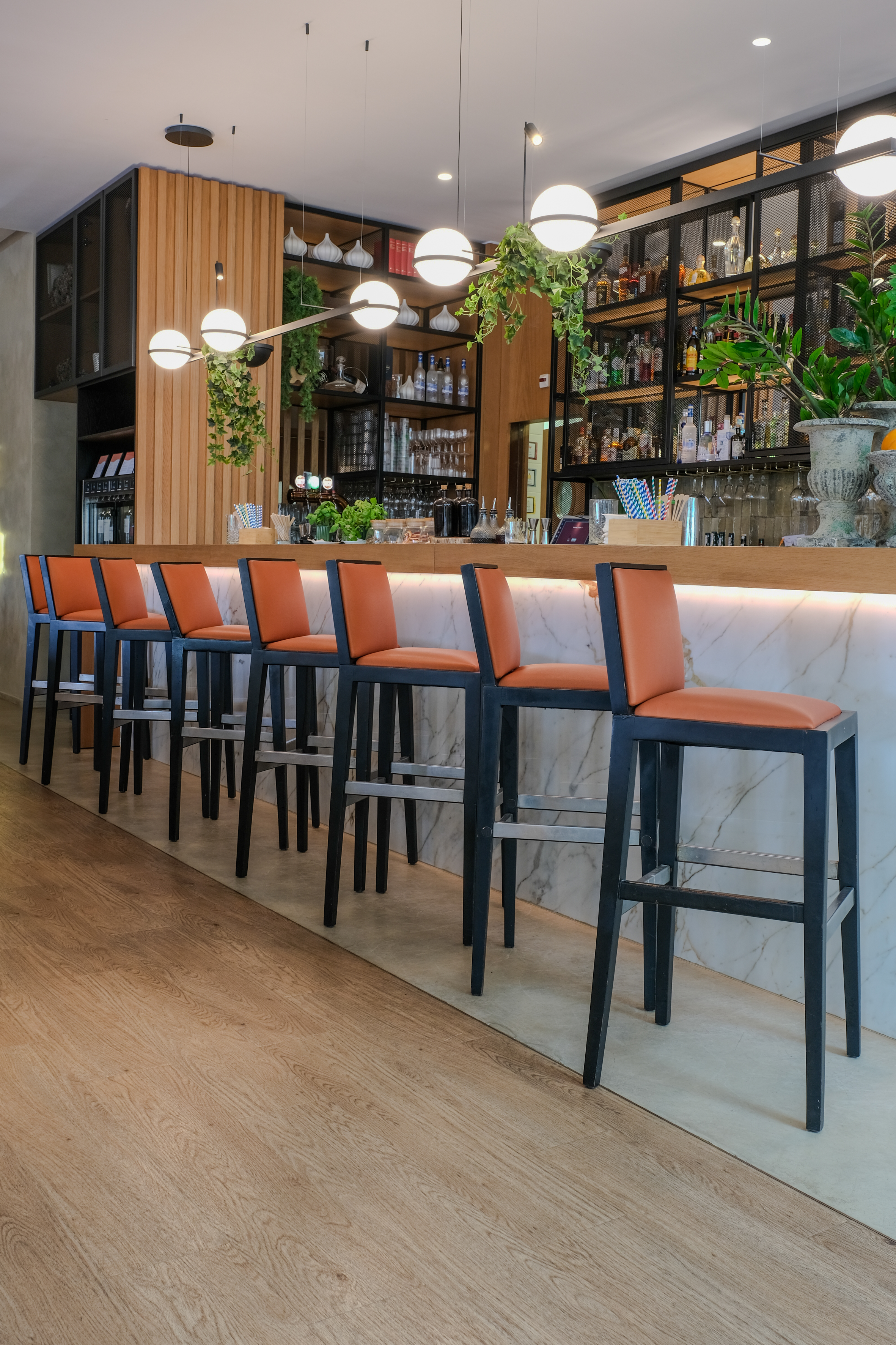 Banco alto elegante e confortável ideal para balcões, ilhas de cozinha, bares ou restaurantes.