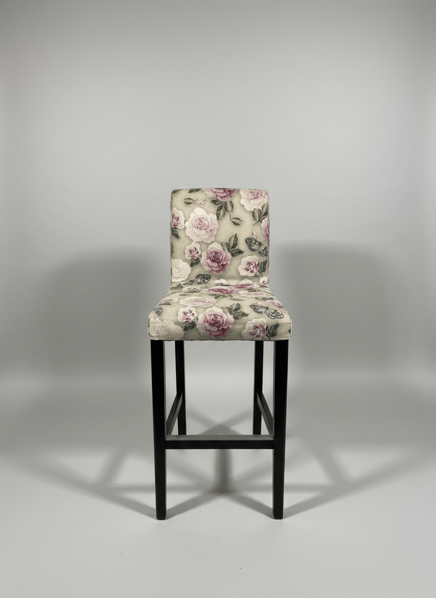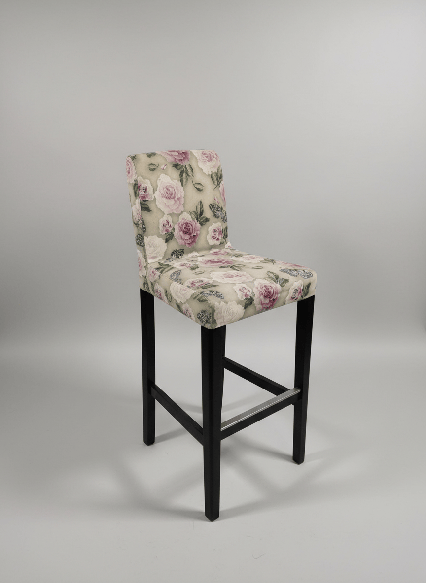 Banco alto com encosto, estofado em tecido floral de inspiração romântica. A estrutura em madeira confere estabilidade e robustez, enquanto o assento acolchoado garante conforto. Ideal para balcões, ilhas de cozinha ou zonas de apoio, acrescentando um toque decorativo e elegante ao espaço.
