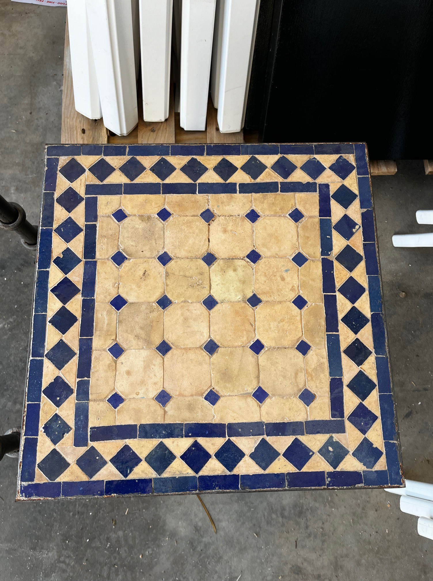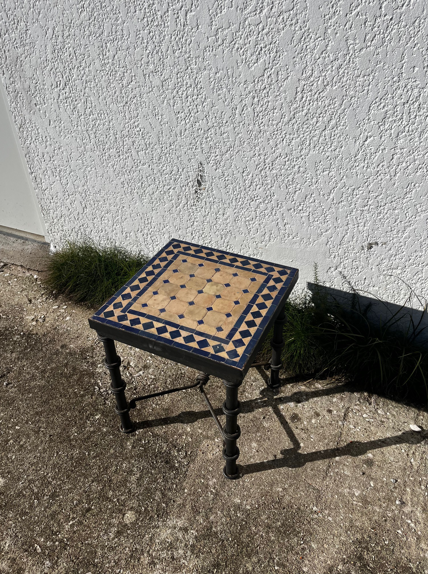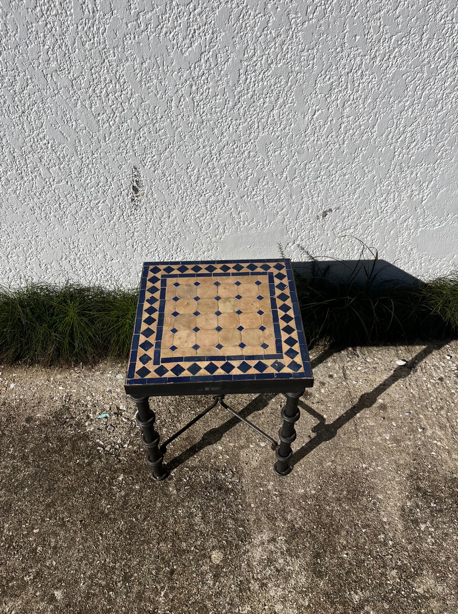 Este banco combina um design elegante com uma funcionalidade prática. Feita em metal, a estrutura proporciona estabilidade, enquanto o tampo decorado com padrões geométricos em tons de bege e azul adiciona um toque artístico ao ambiente. Ideal para ser utilizada ao lado de sofás ou cadeiras, pode servir como suporte para bebidas, livros ou objetos decorativos. É uma peça versátil que se adapta bem a diferentes estilos de decoração, seja em interiores ou espaços exteriores.