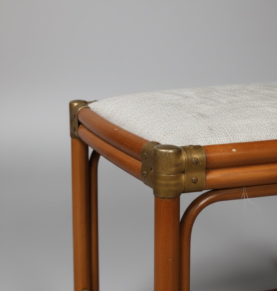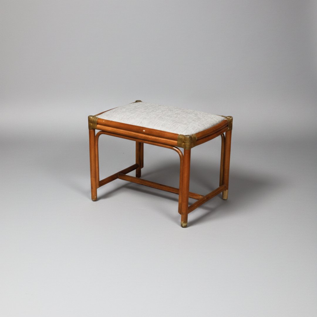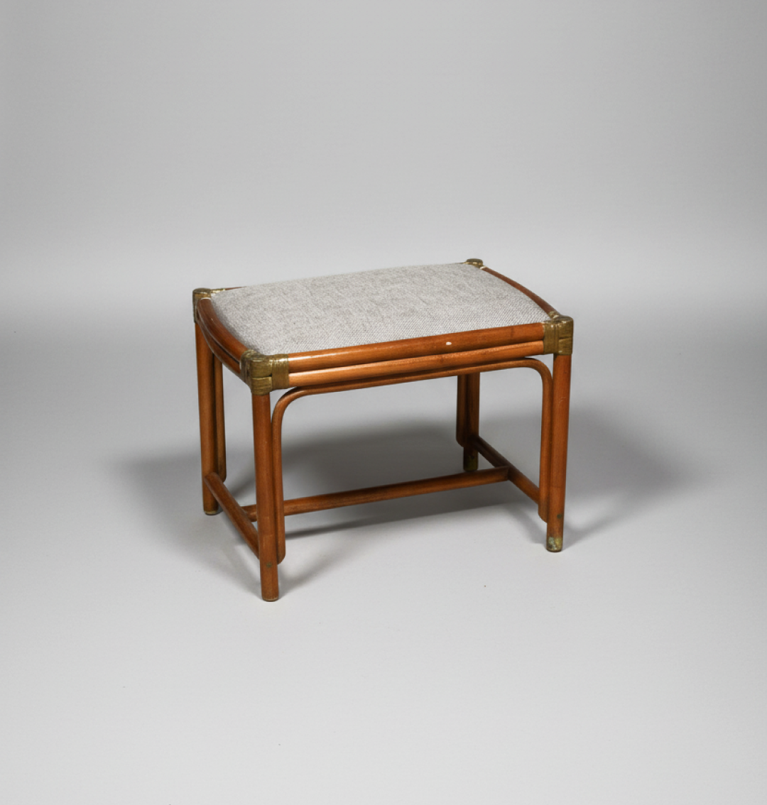 Este banco de apoio combina a resistência e o encanto do bambu com o conforto de um assento estofado. A estrutura em bambu de tom mel apresenta uniões reforçadas e um design de pernas curvas, conferindo-lhe uma estética leve e artesanal. O assento é revestido com um tecido de trama cinza claro, criando um contraste equilibrado que se adapta tanto a ambientes interiores como a espaços de lazer cobertos.