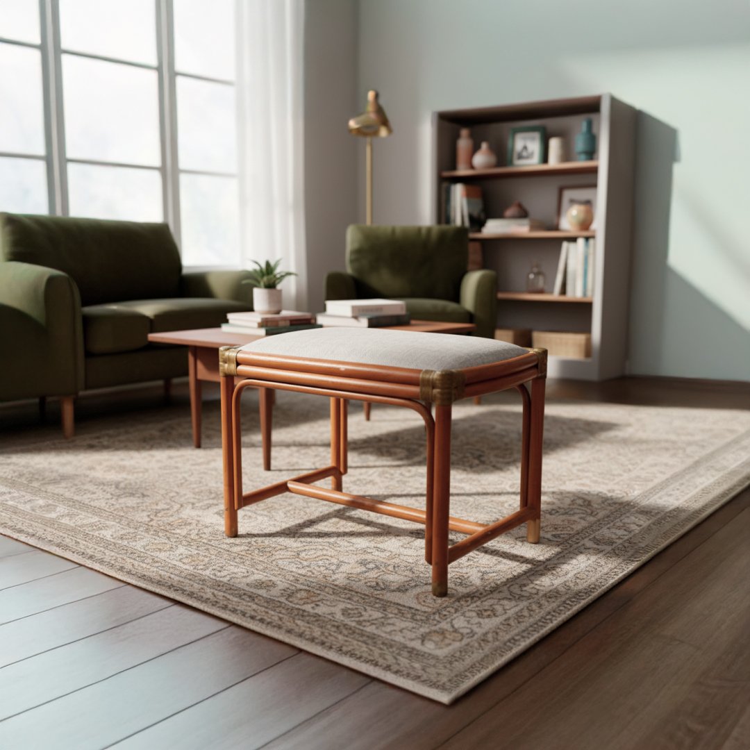 A estrutura de bambu está bem conservada e estável. O estofamento encontra-se limpo e sem rasgos. Como é habitual em artigos de armazém, pode apresentar pequenas marcas de uso nas extremidades das pernas ou pó acumulado nas uniões do bambu, que uma limpeza simples com uma escova macia resolve.
