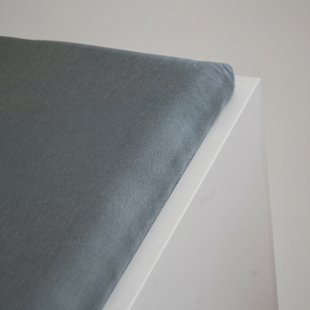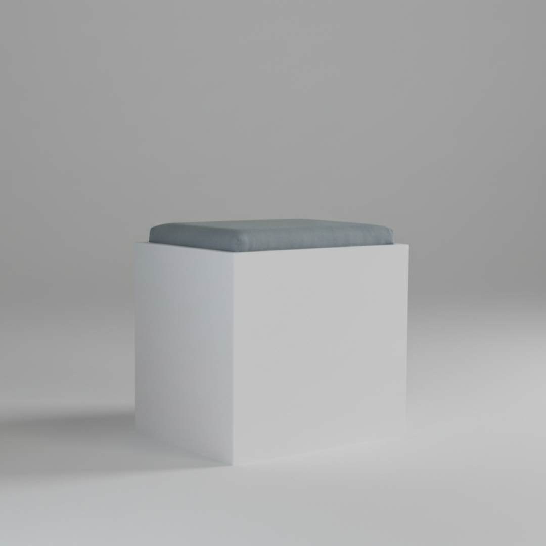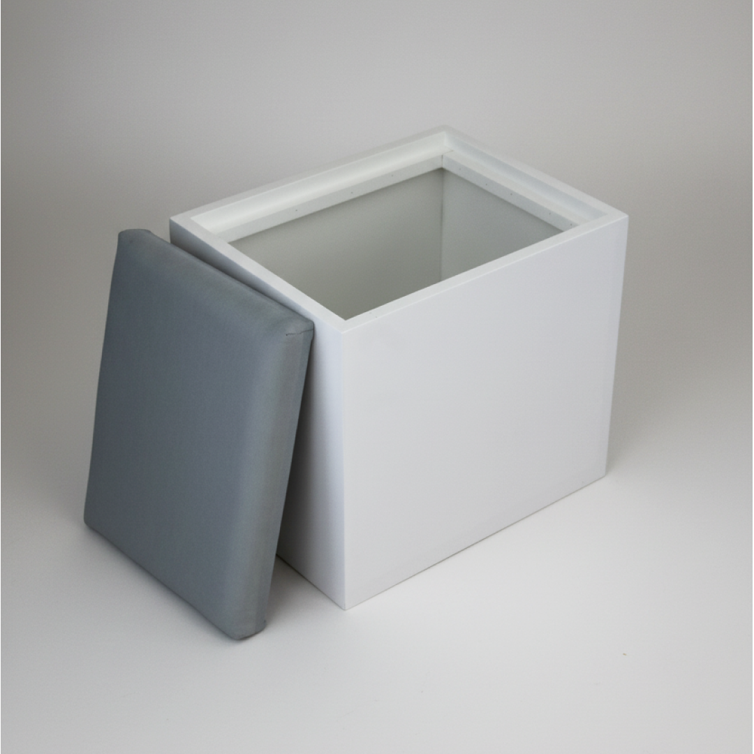 Banco de apoio com geometria cúbica e estrutura sólida em acabamento branco. Possui assento amovível estofado em tecido cinza, que permite aceder a um compartimento interior para arrumação. É uma peça funcional desenhada para otimização de espaço e organização. Por ser um artigo proveniente de hotelaria, pode apresentar algum pós de uso decorrente do armazenamento, mas a sua superfície permite que se limpe facilmente com um pano húmido.