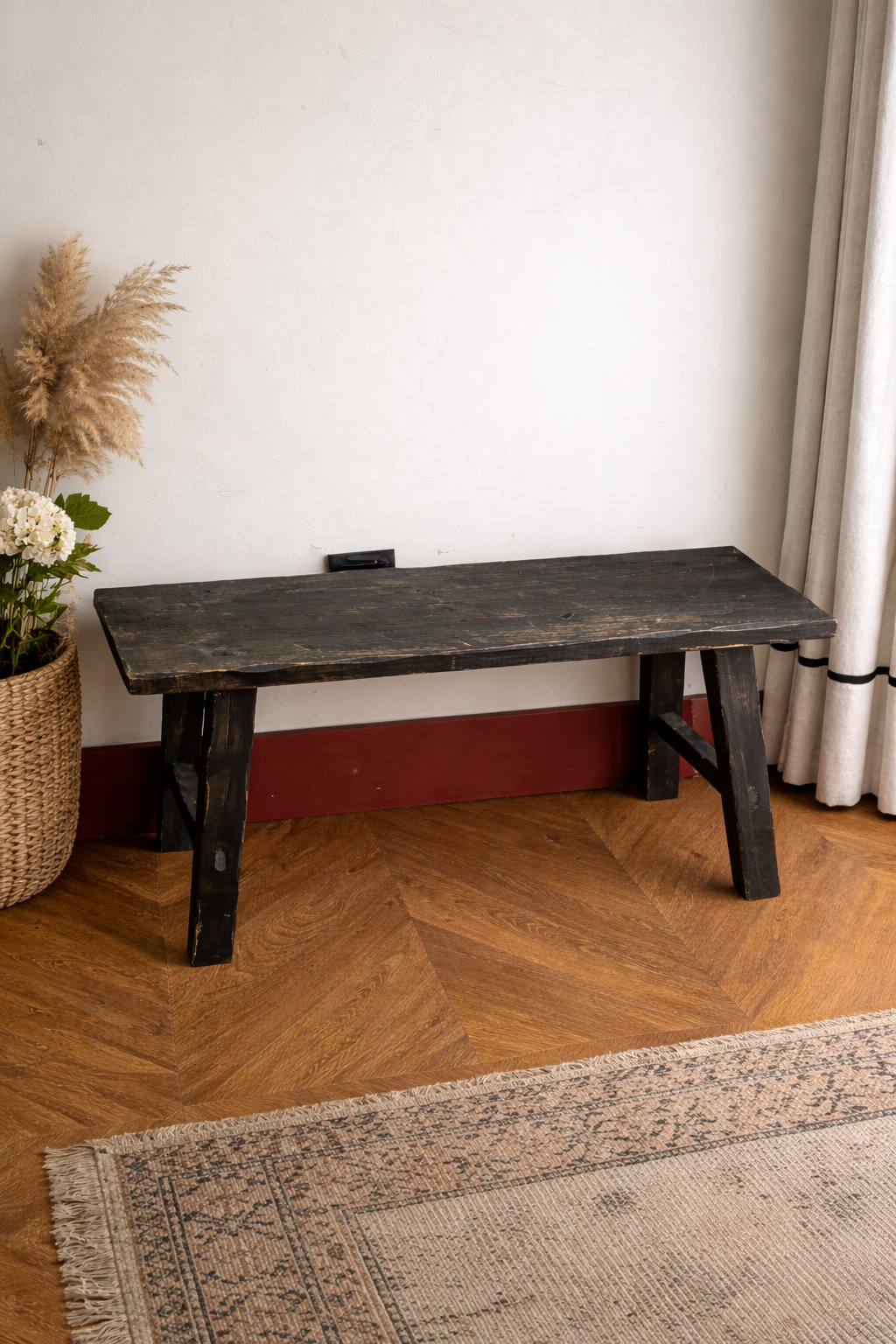 Banco comprido em madeira maciça com acabamento preto envelhecido. Apresenta marcas visíveis de uso, riscos e desgaste natural na superfície, ideal para decoração rústica/vintage ou para entrada/sala.