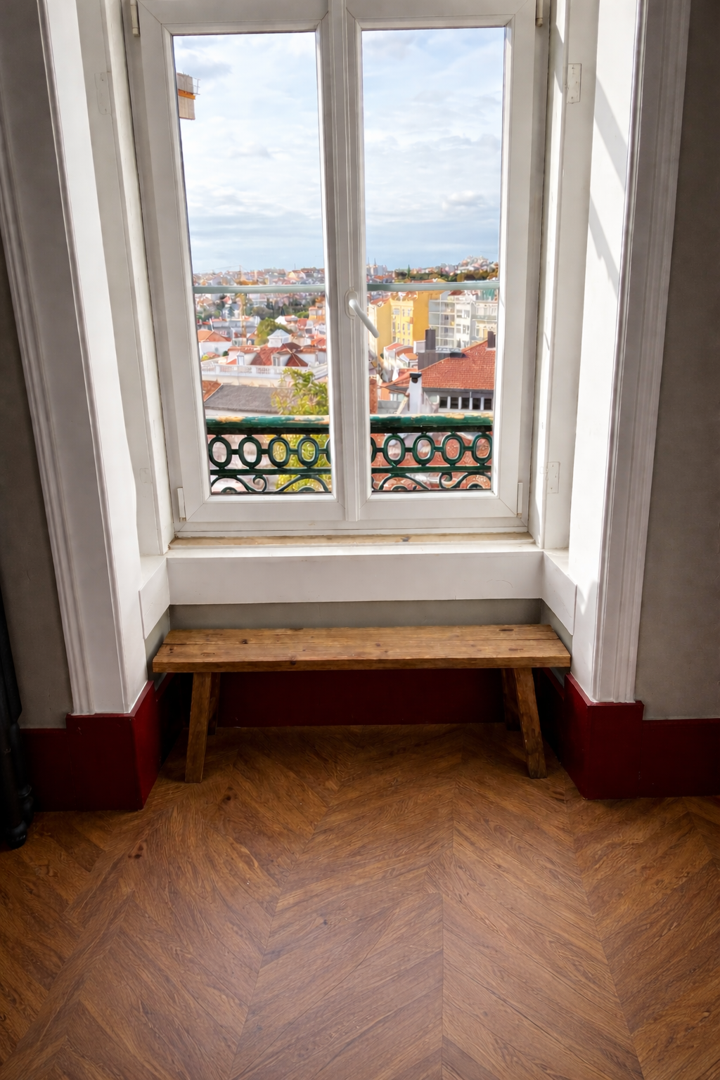 Banco em madeira maciça, com acabamento natural e marcas visíveis de uso.