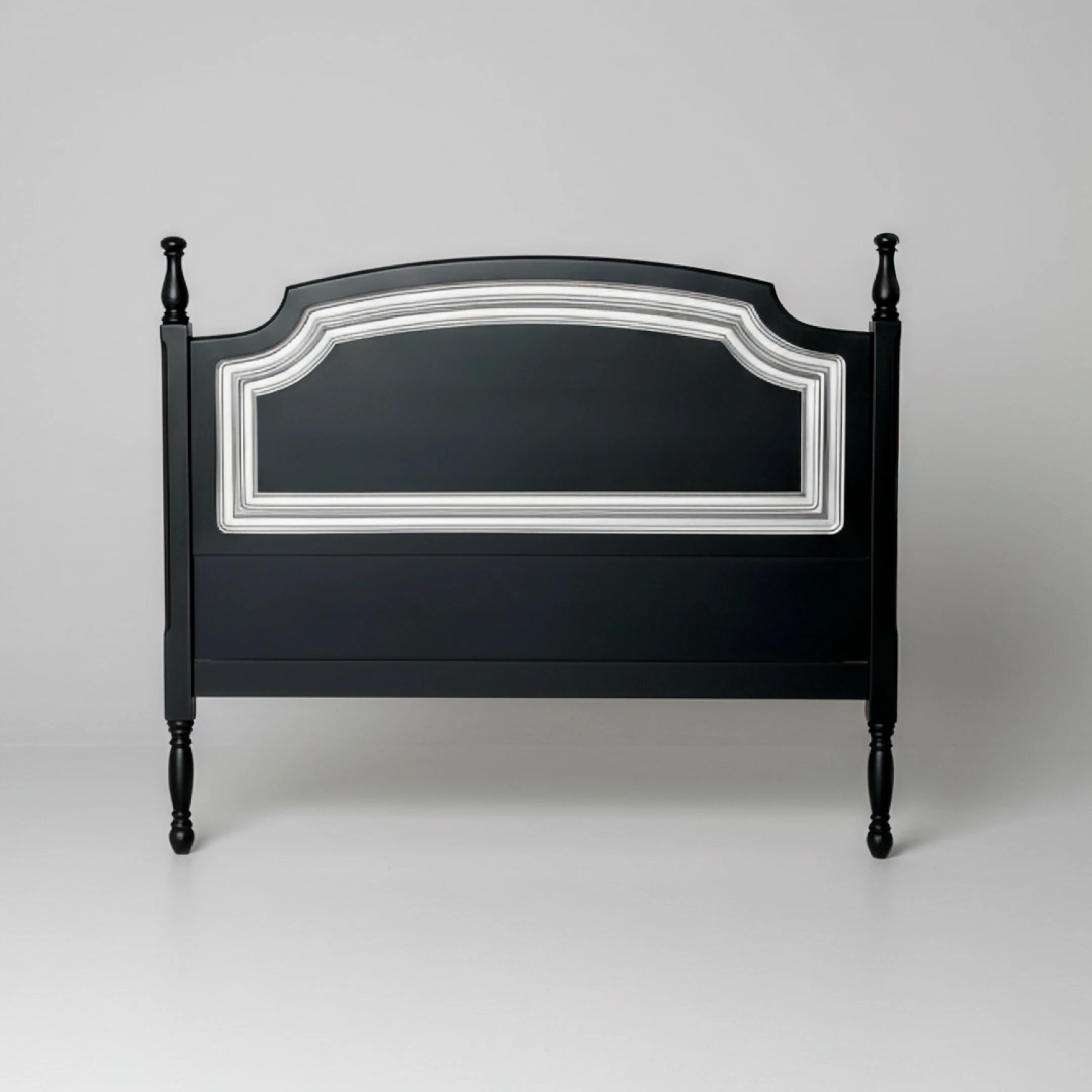 Cabeceira de casal em madeira, com acabamento preto e detalhe decorativo em tom claro.