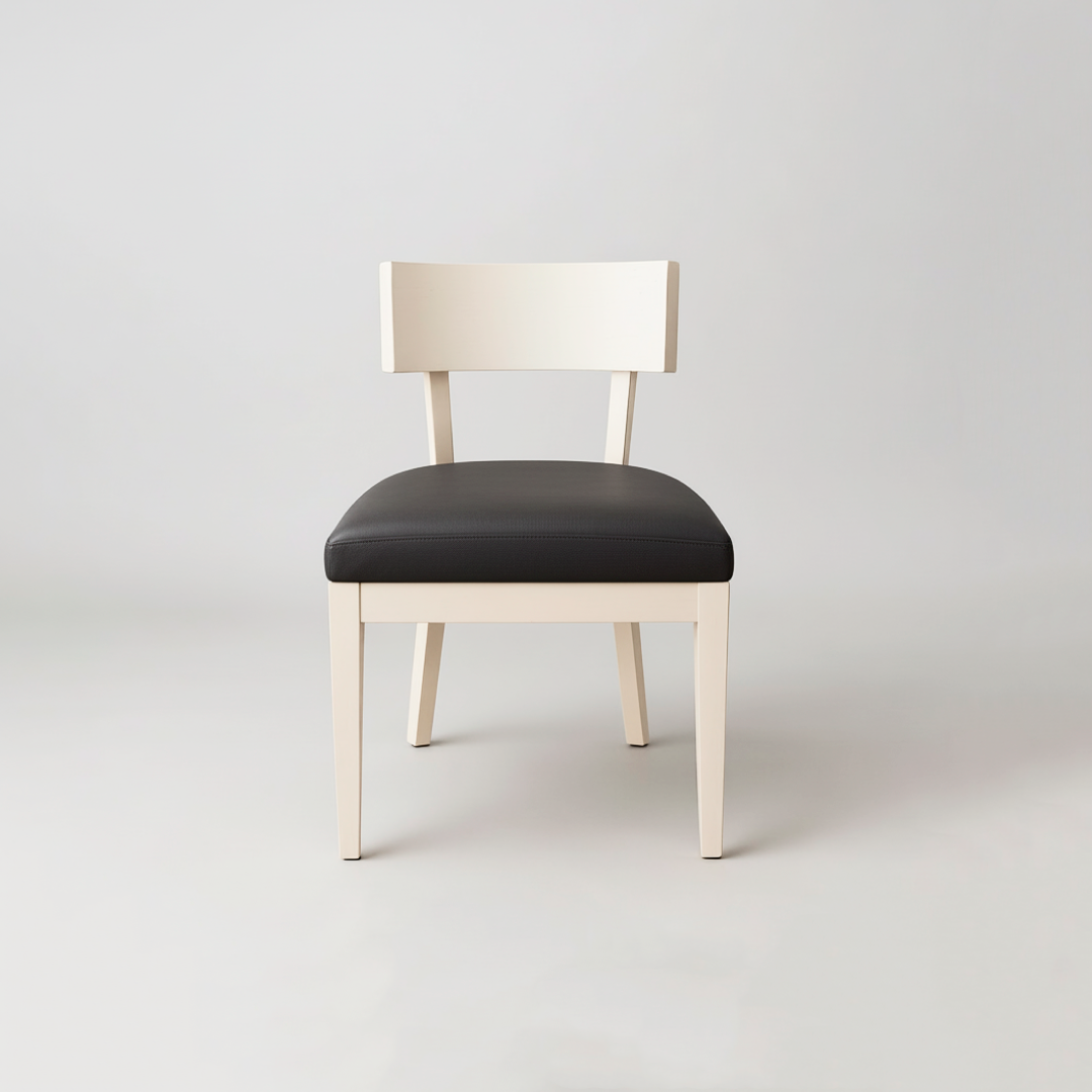 Cadeira de design moderno e minimalista, com estrutura robusta em madeira pintada de branco. O modelo destaca-se pelo encosto curvo ergonómico e pelo assento estofado em material preto de fácil manutenção. Apesar de apresentar leves marcas de uso decorrentes da sua utilização prévia em hotelaria, encontra-se estruturalmente íntegra, oferecendo uma solução de assento prática e resistente.