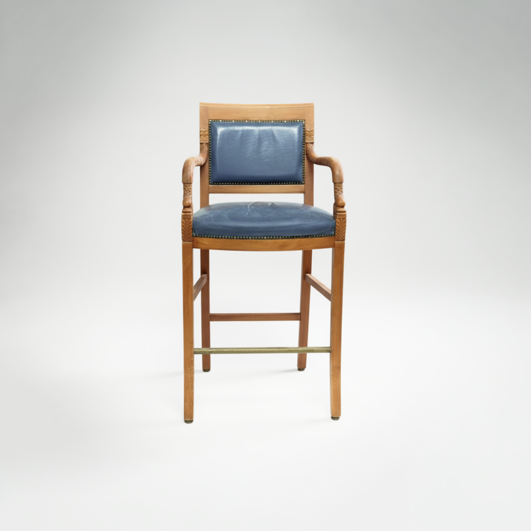 Este conjunto de cadeiras foi desenhado para proporcionar durabilidade e conforto em ambientes de uso intensivo. O assento e o encosto são estofados em couro sintético azul-escuro de fácil manutenção, complementados por uma estrutura de madeira sólida com braços de apoio trabalhados. O detalhe das tachas decorativas e o apoio de pés metálico reforçam a qualidade construtiva e o estilo intemporal destas peças.