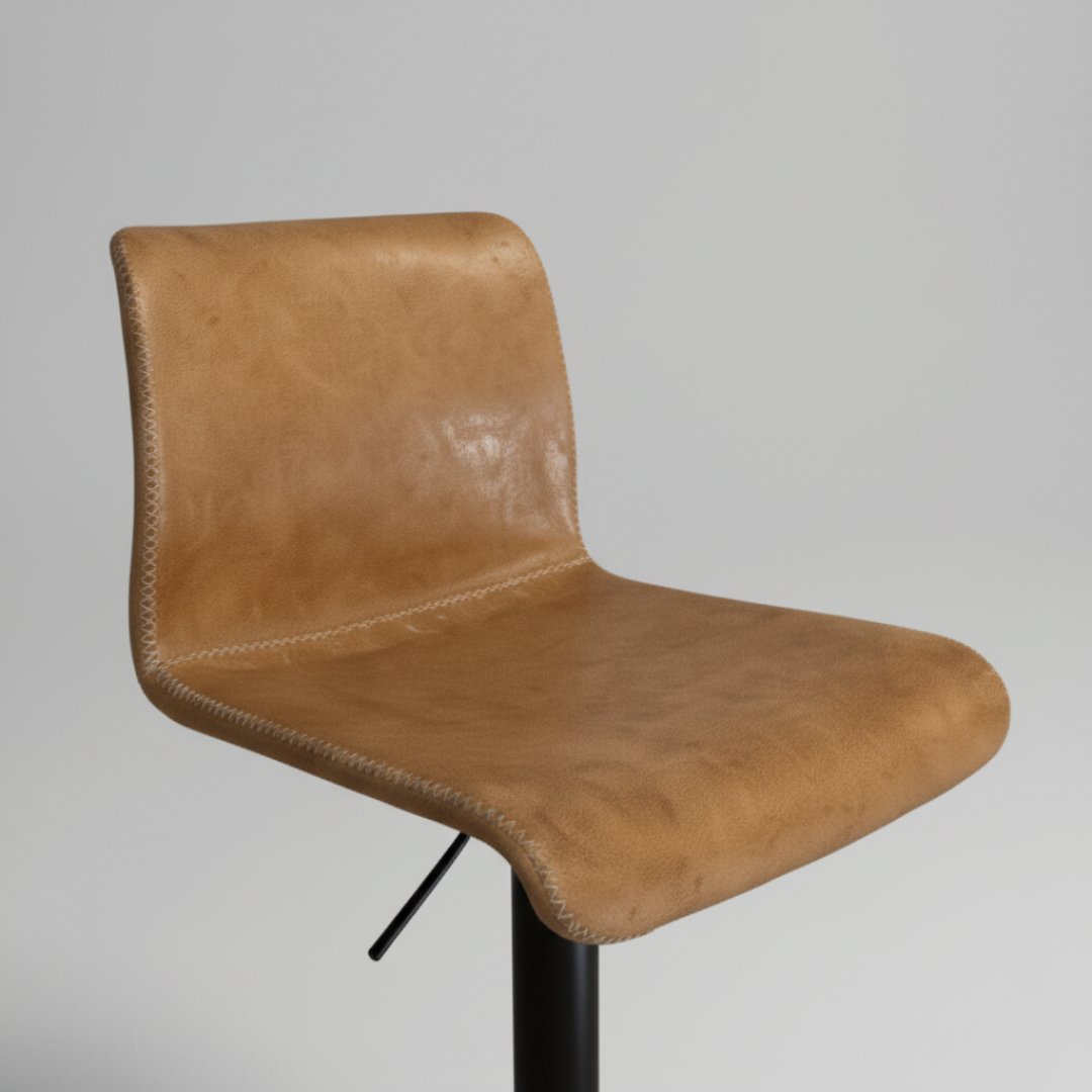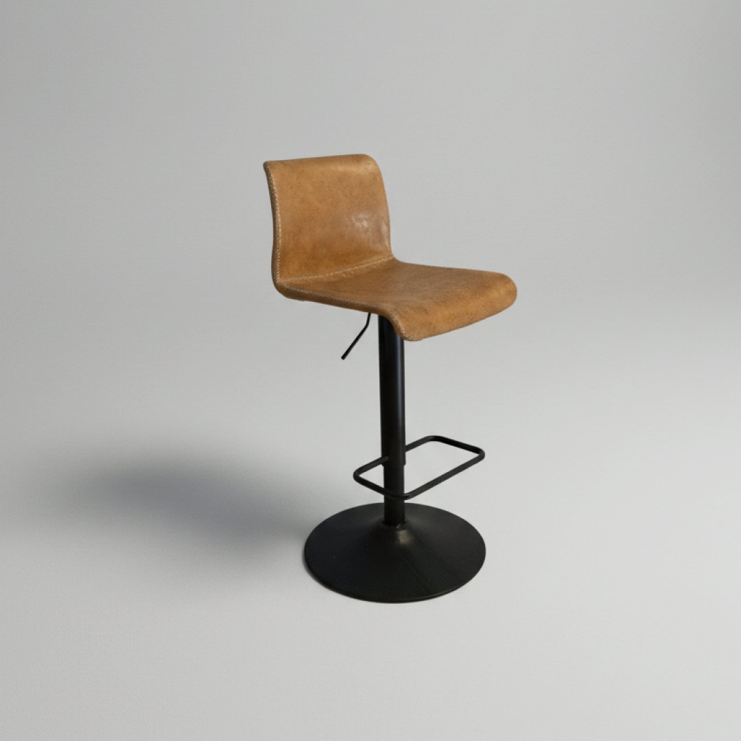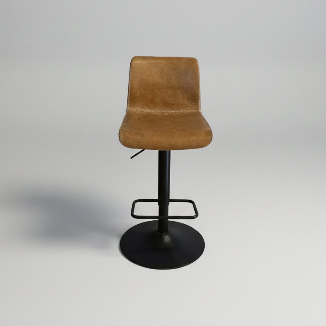 Este banco de bar apresenta um assento ergonómico em pele sintética de cor camel com acabamento em costura pespontada. A estrutura é composta por uma base metálica em preto mate com sistema de elevação, permitindo o ajuste de altura. O design inclui um pousa-pés circular integrado para maior conforto e estabilidade.
