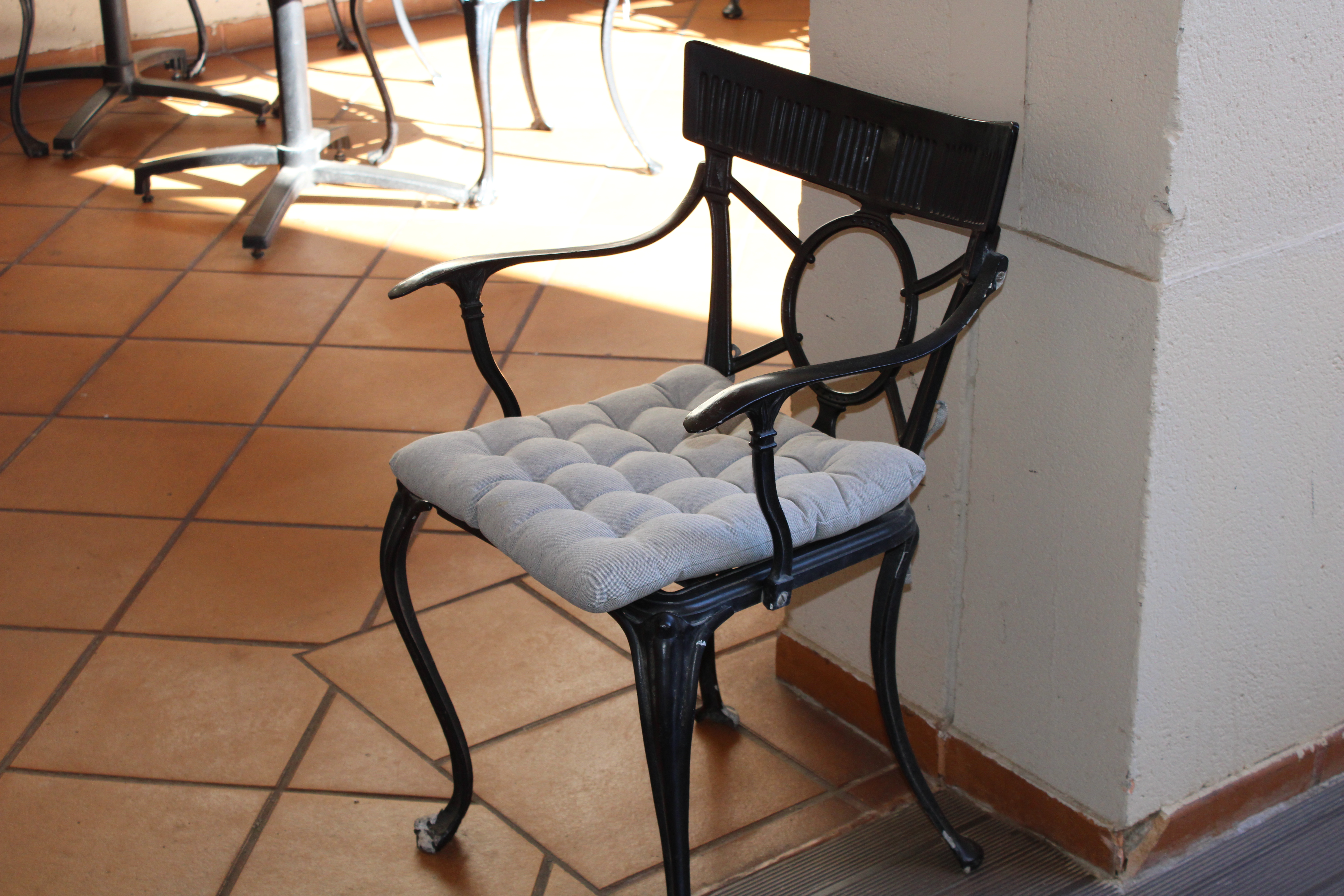 Assento vazado para maior durabilidade no exterior. Inclui almofada acolchoada cinza para maior conforto .