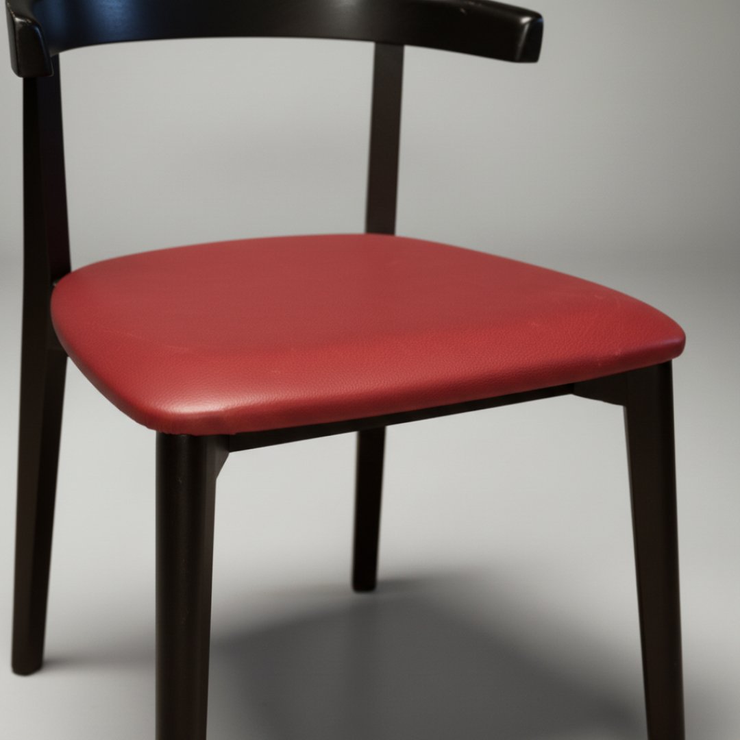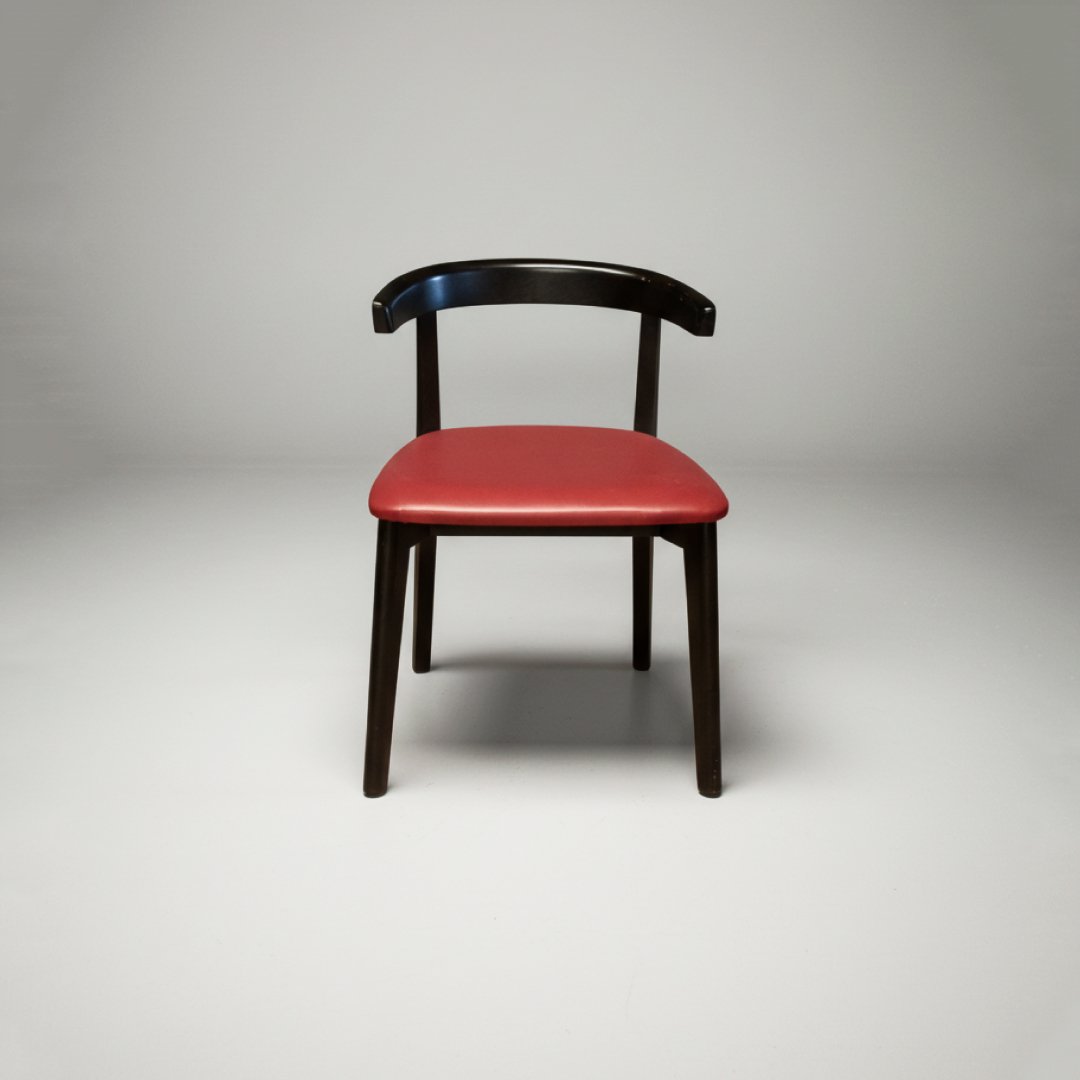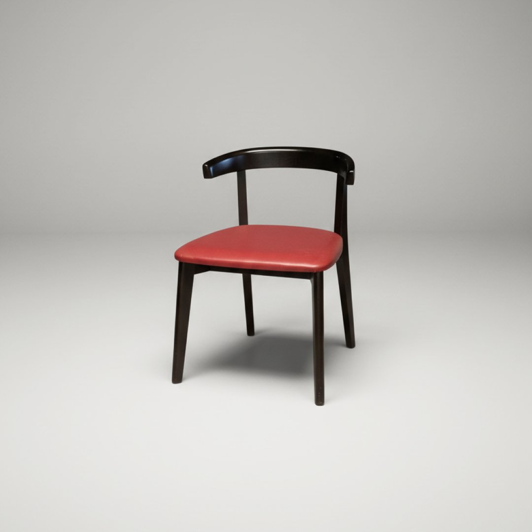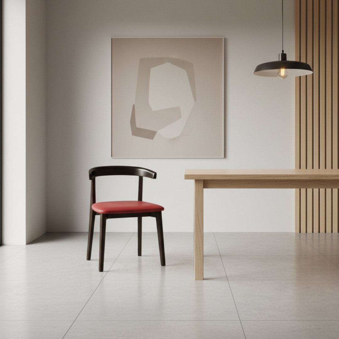 Esta cadeira de jantar apresenta um design moderno com linhas curvas e minimalistas. A estrutura é fabricada em madeira maciça com acabamento escuro, apresentando um encosto semicircular contínuo que oferece um suporte ergonómico e elegante. O assento é estofado em pele de tom bordeaux, conferindo um ponto de cor sofisticado a qualquer ambiente de refeição ou escritório.