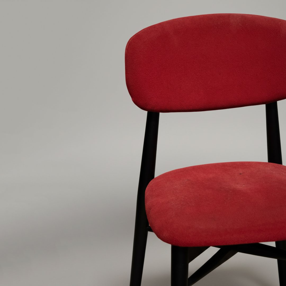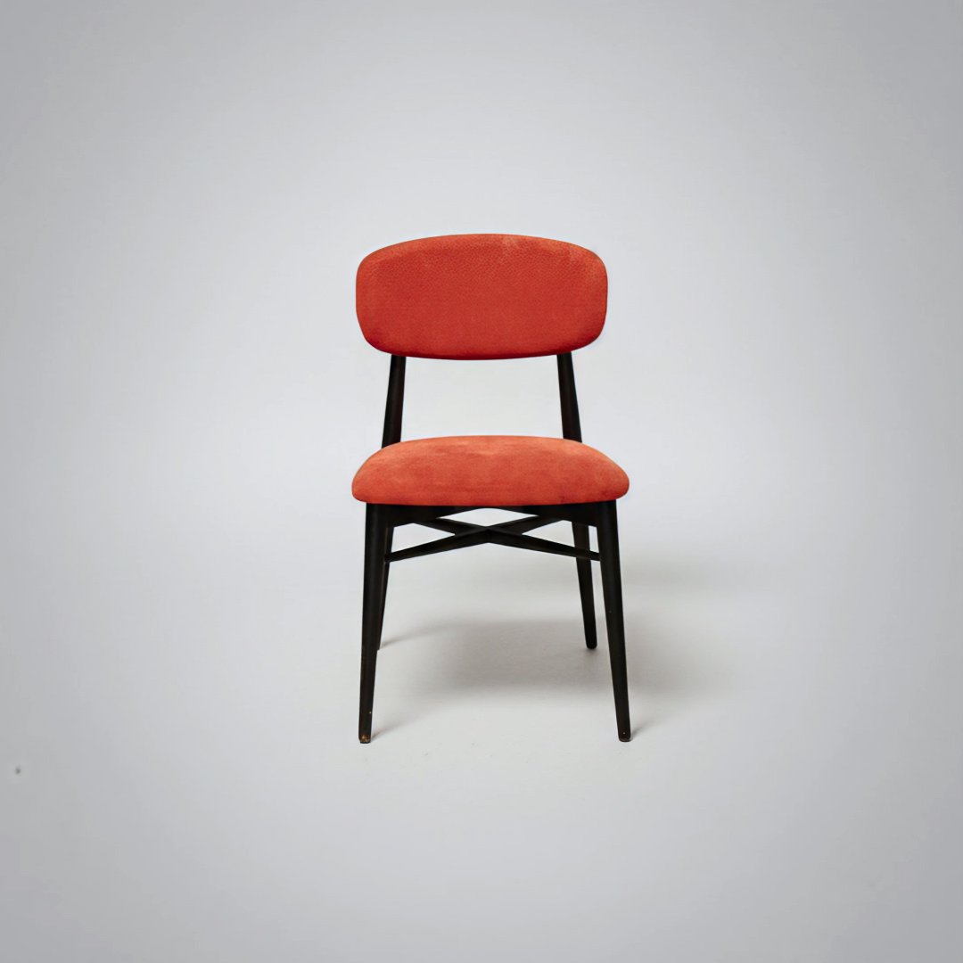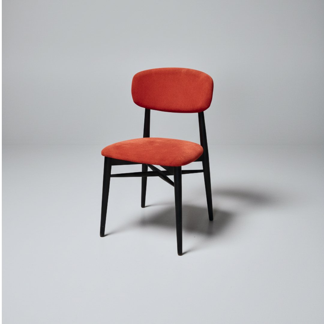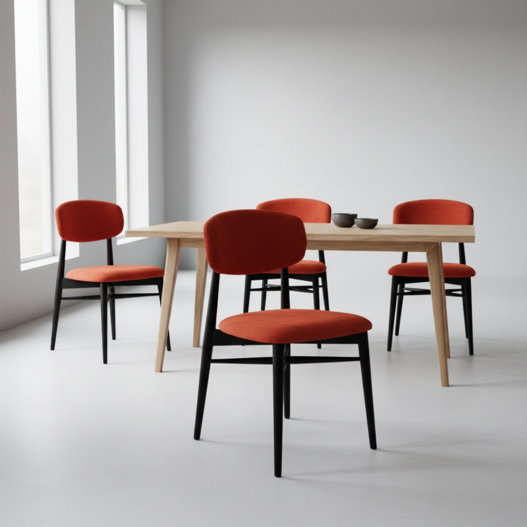 Esta cadeira de jantar apresenta um design de inspiração Mid-Century Modern, com um encosto arredondado e um assento ergonómico estofado. A estrutura em madeira com acabamento preto mate destaca-se pelo detalhe de reforço em "X" sob o assento, conferindo-lhe uma estética retro e uma construção muito estável. O estofo em tecido de cor vermelha oferece um contraste vibrante e sofisticado para salas de jantar ou espaços criativos.