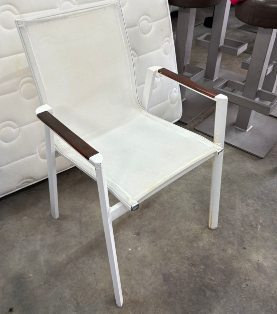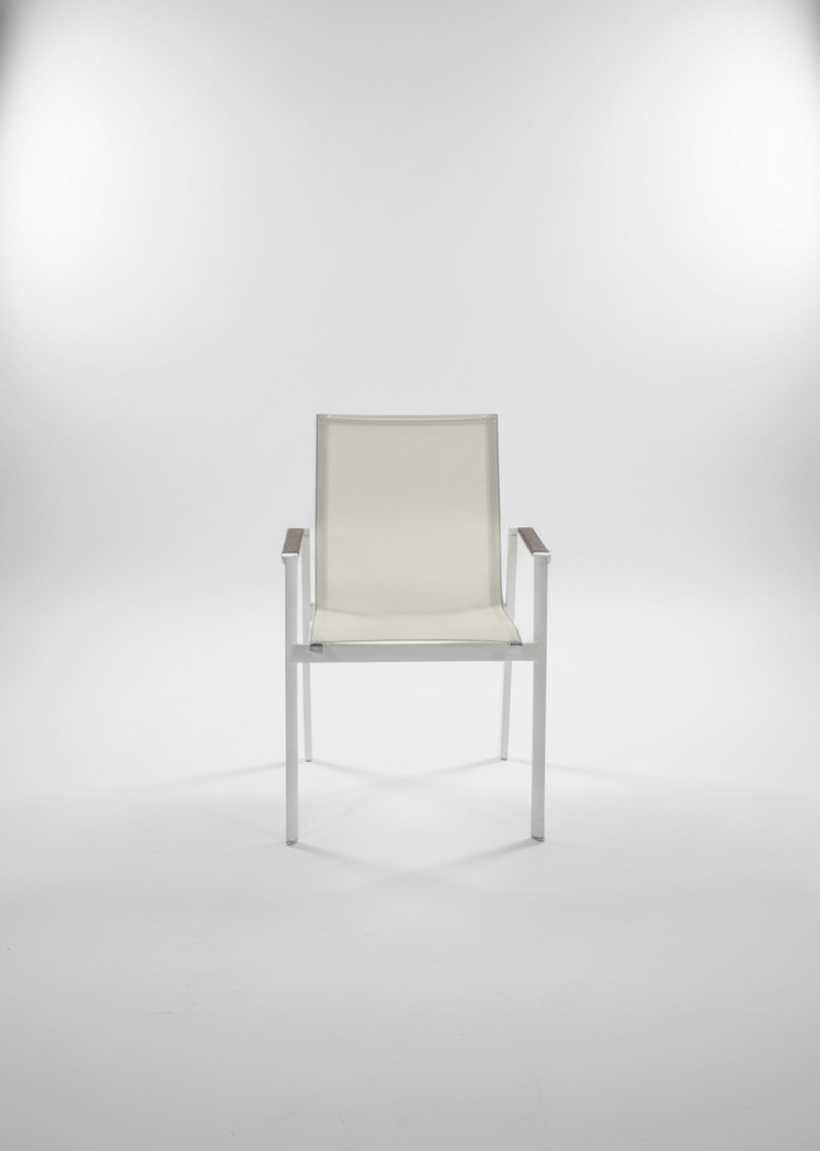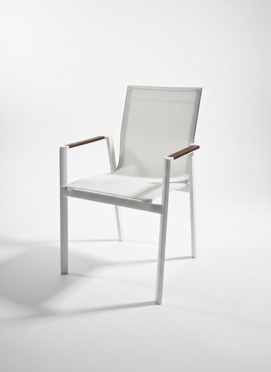 Cadeira empilhável com estrutura em alumínio branco e assento/encosto em tecido sintético respirável, resistente às intempéries. Apoios de braços com detalhe em madeira sintética, conferindo um toque elegante e confortável.