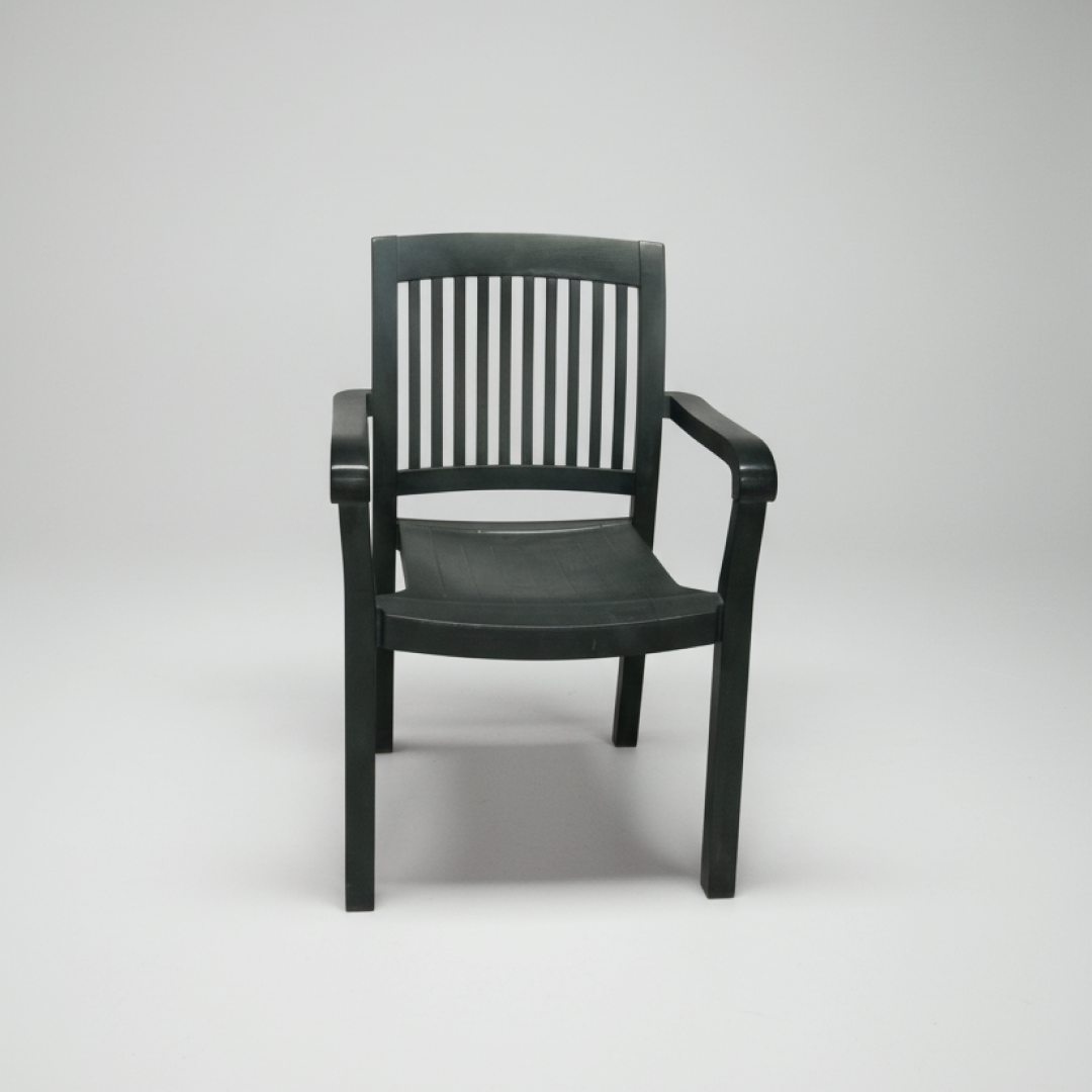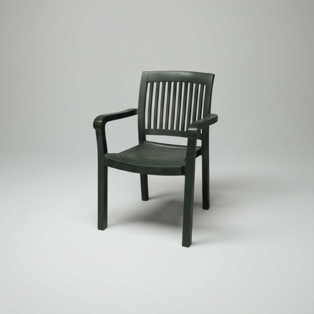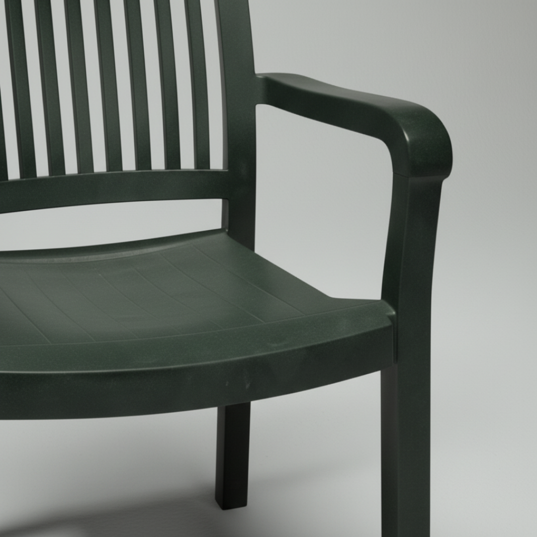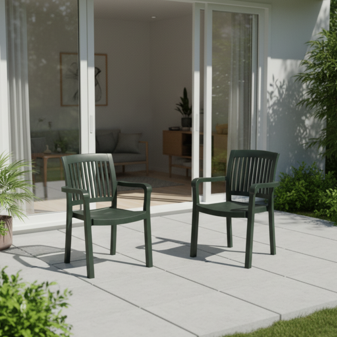 Esta cadeira de exterior apresenta um design clássico e funcional, fabricada em polipropileno. O encosto de ripas verticais e o assento ergonómico proporcionam conforto, enquanto os braços integrados oferecem suporte adicional. É uma peça leve e empilhável, ideal para jardins, terraços ou áreas de lazer.