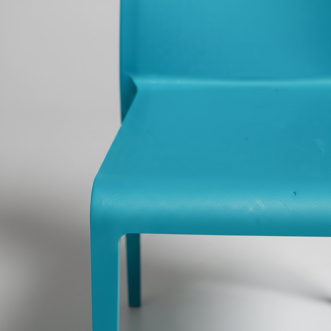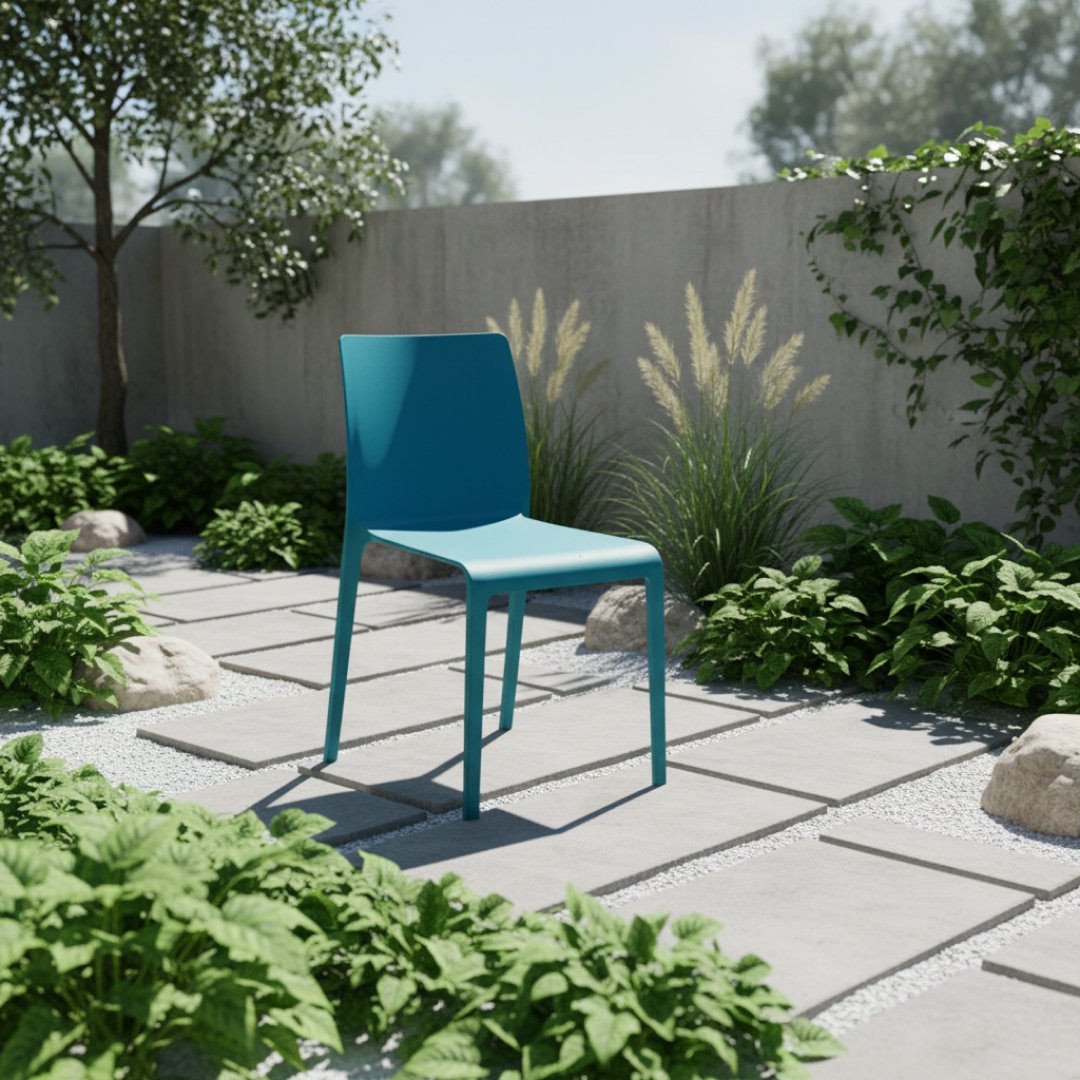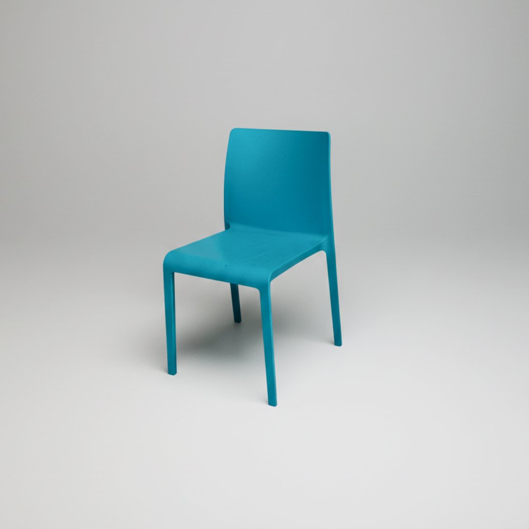 Esta cadeira destaca-se pelo seu design monobloco minimalista e funcional. Fabricada em polipropileno, apresenta linhas direitas e superfícies lisas que facilitam a limpeza e manutenção. O encosto e o assento formam uma peça única ergonómica, suportada por pernas integradas de perfil discreto.