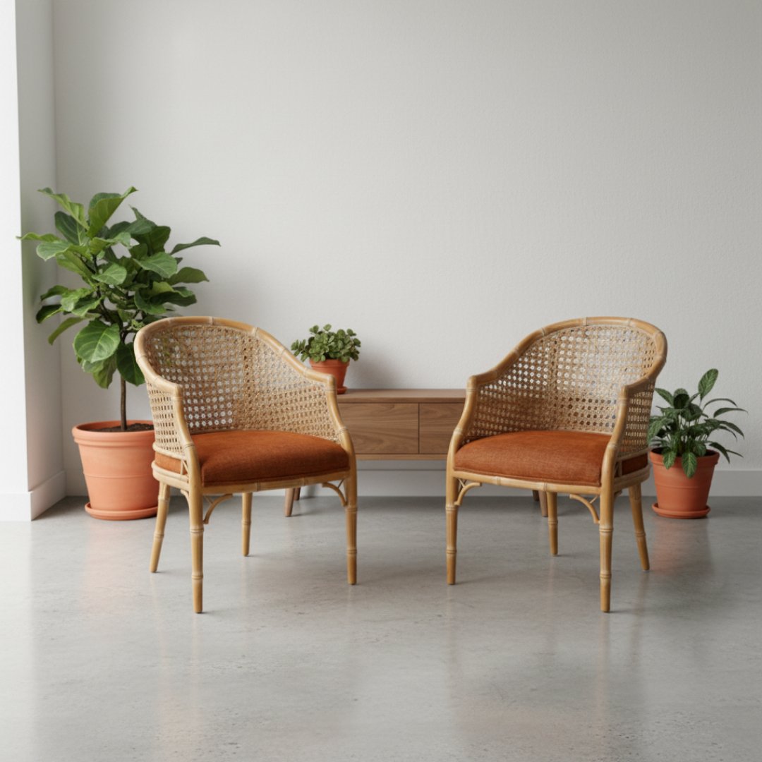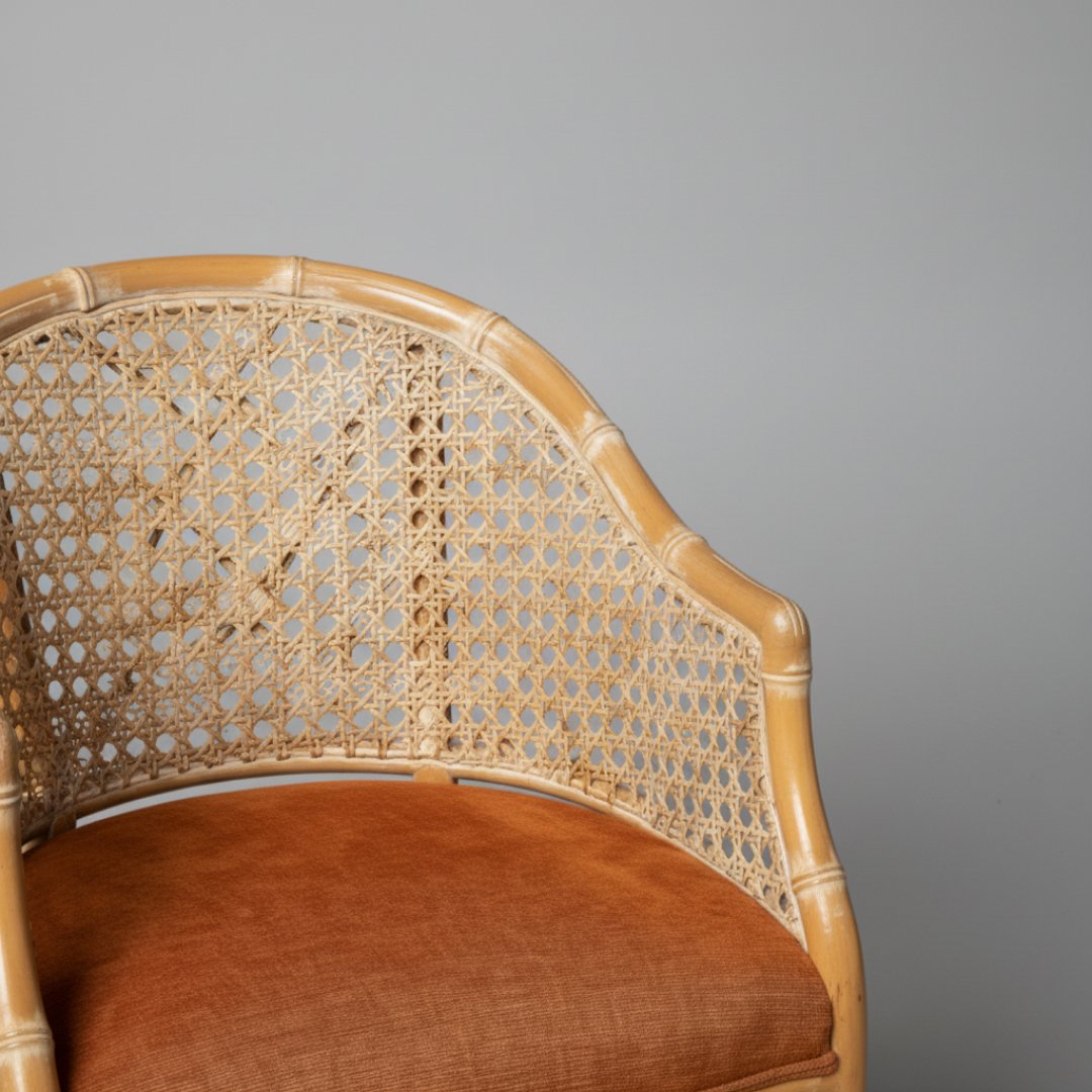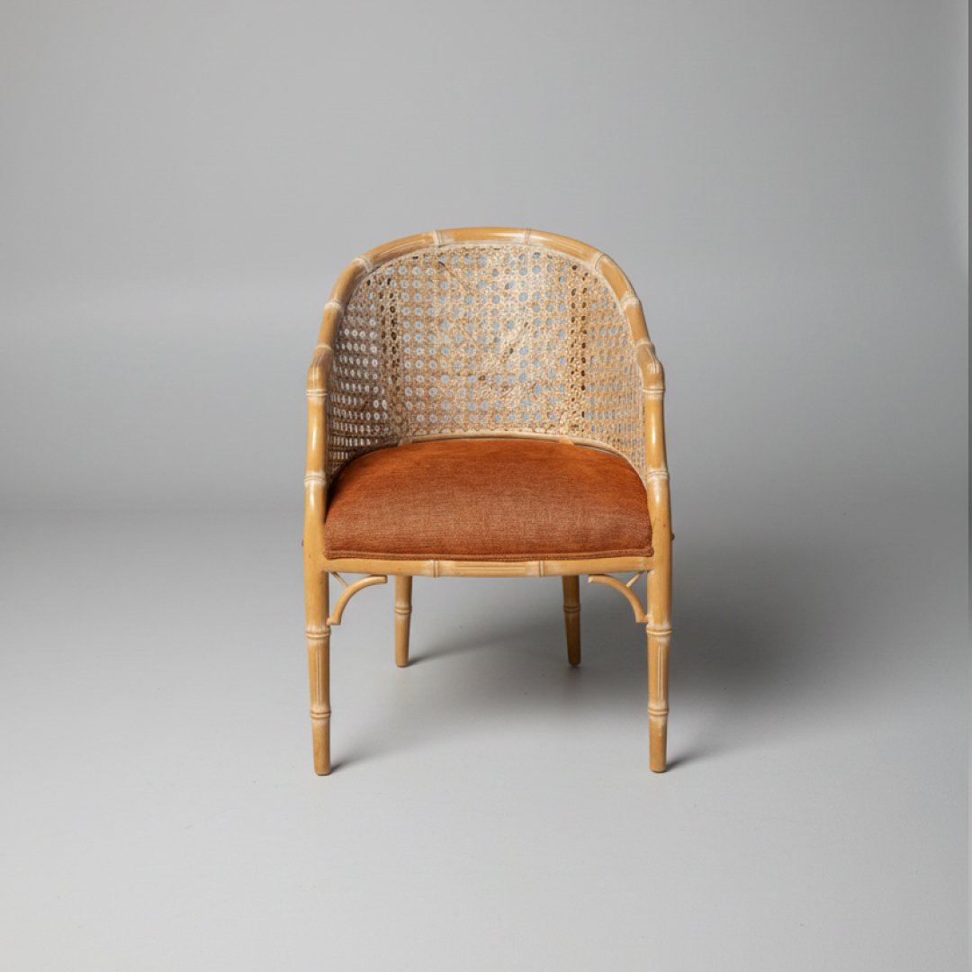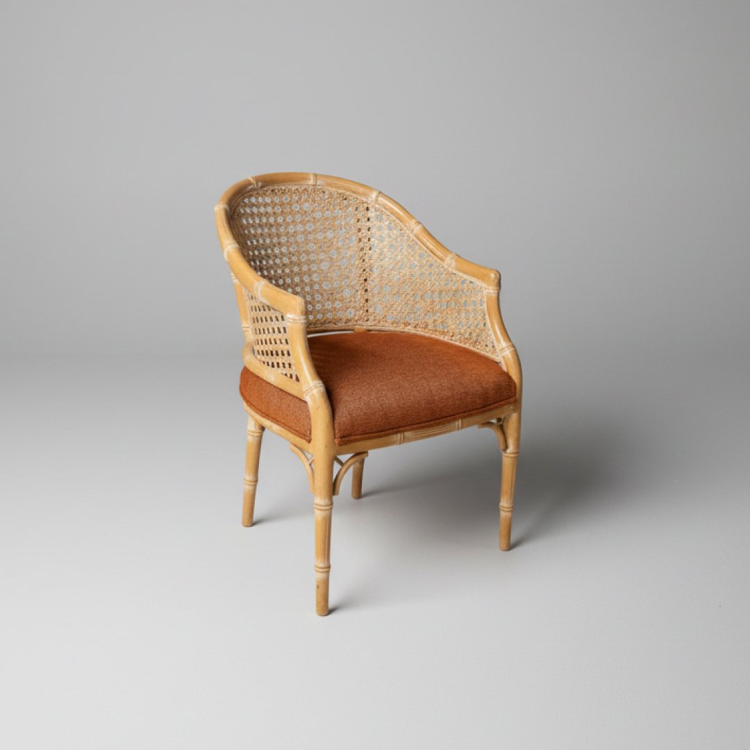 Esta peça apresenta um design envolvente de inspiração tropical e boho-chic. A estrutura é fabricada em bambu natural com um encosto alto e semicircular em palhinha entrelaçada, que proporciona uma estética leve e ventilada. O assento é estofado num tecido de cor laranja queimado (tijolo), criando uma combinação quente e orgânica com o tom do bambu.
