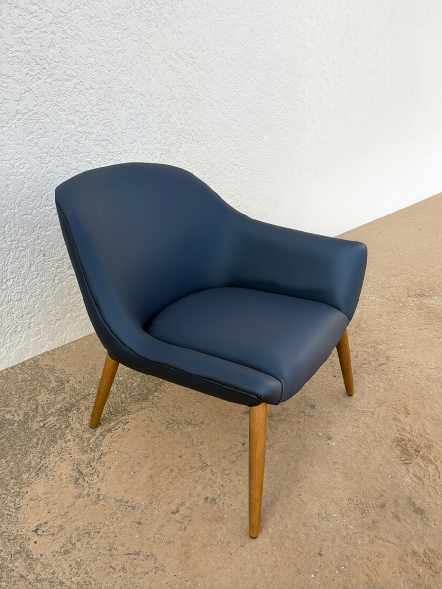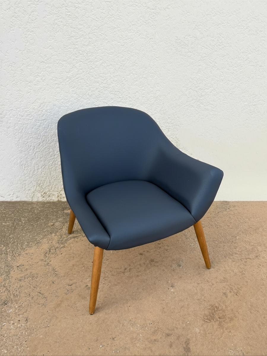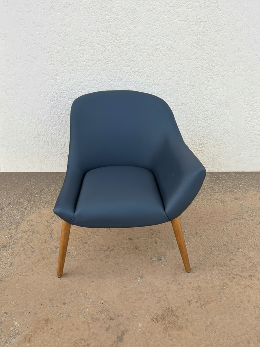 Esta cadeira em eco-pele azul com braço esquerdo combina design ergonómico e funcionalidade, ideal para uso diário em escritórios, lounges ou em casa. O estofamento em azul escuro é resistente, fácil de limpar e confortável, enquanto a estrutura e as pernas em madeira garantem estabilidade e um visual elegante. Uma peça versátil que une conforto e durabilidade.