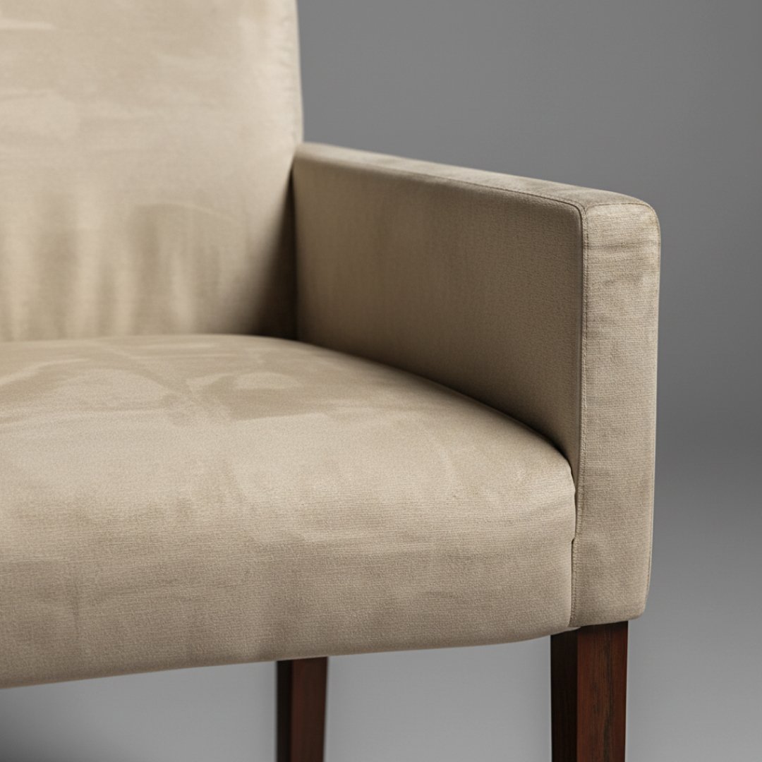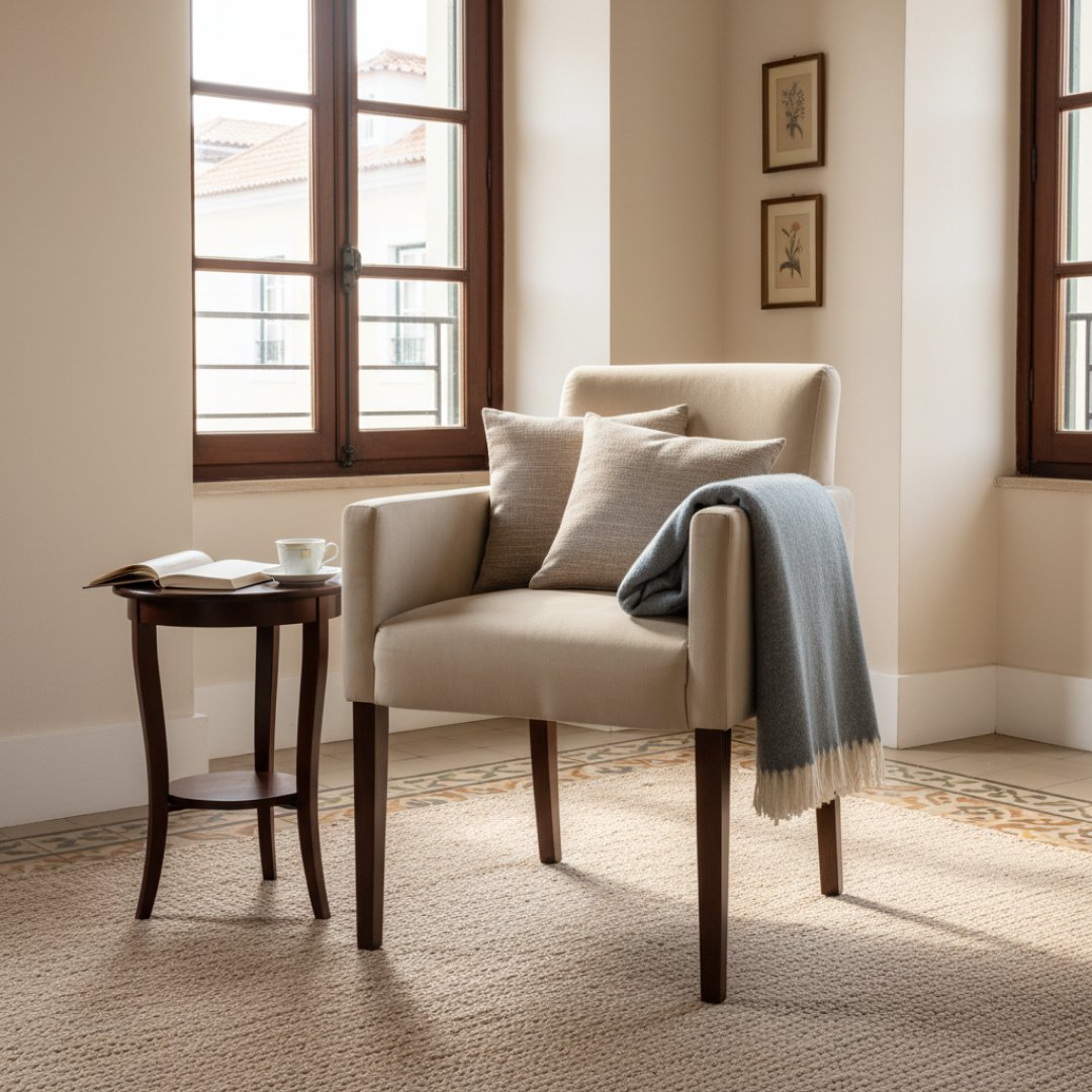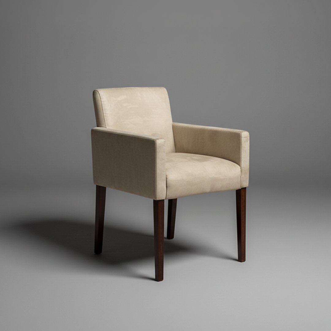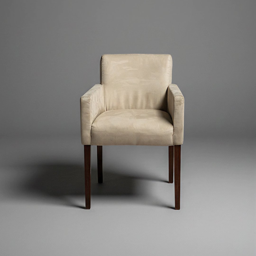 Esta cadeira de braços apresenta um design robusto e acolhedor. Com linhas retas e braços integrados de espessura generosa, oferece um suporte envolvente e confortável. O estofo é realizado num tecido tipo chenille de toque macio em tom bege areia, elevado por pernas finas em madeira escura que conferem leveza visual à estrutura sólida superior.
