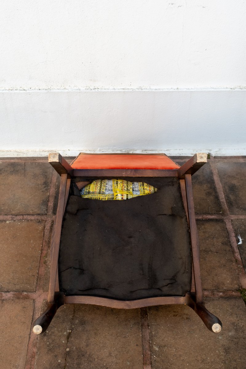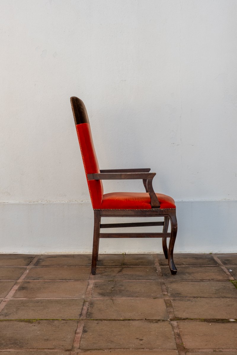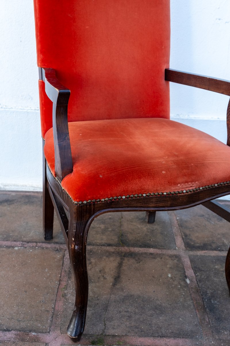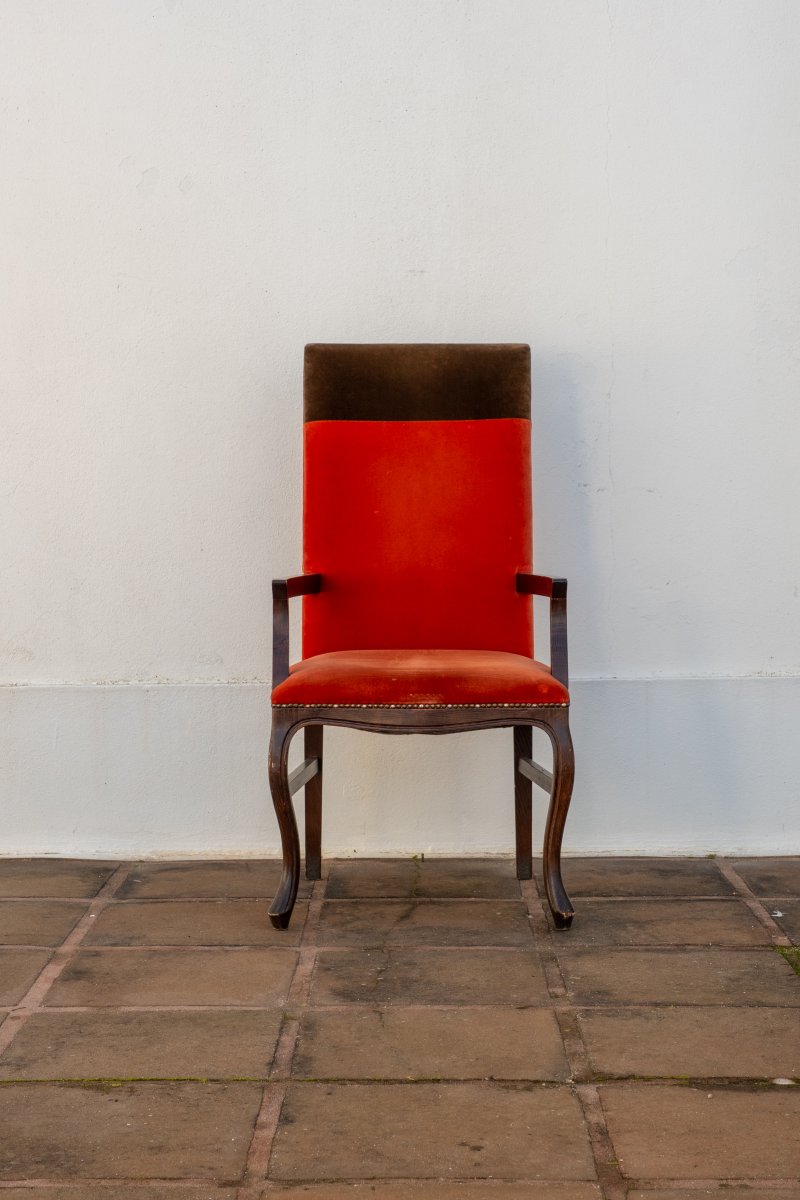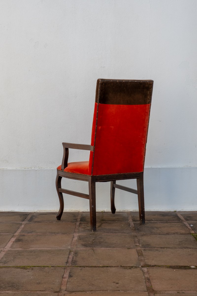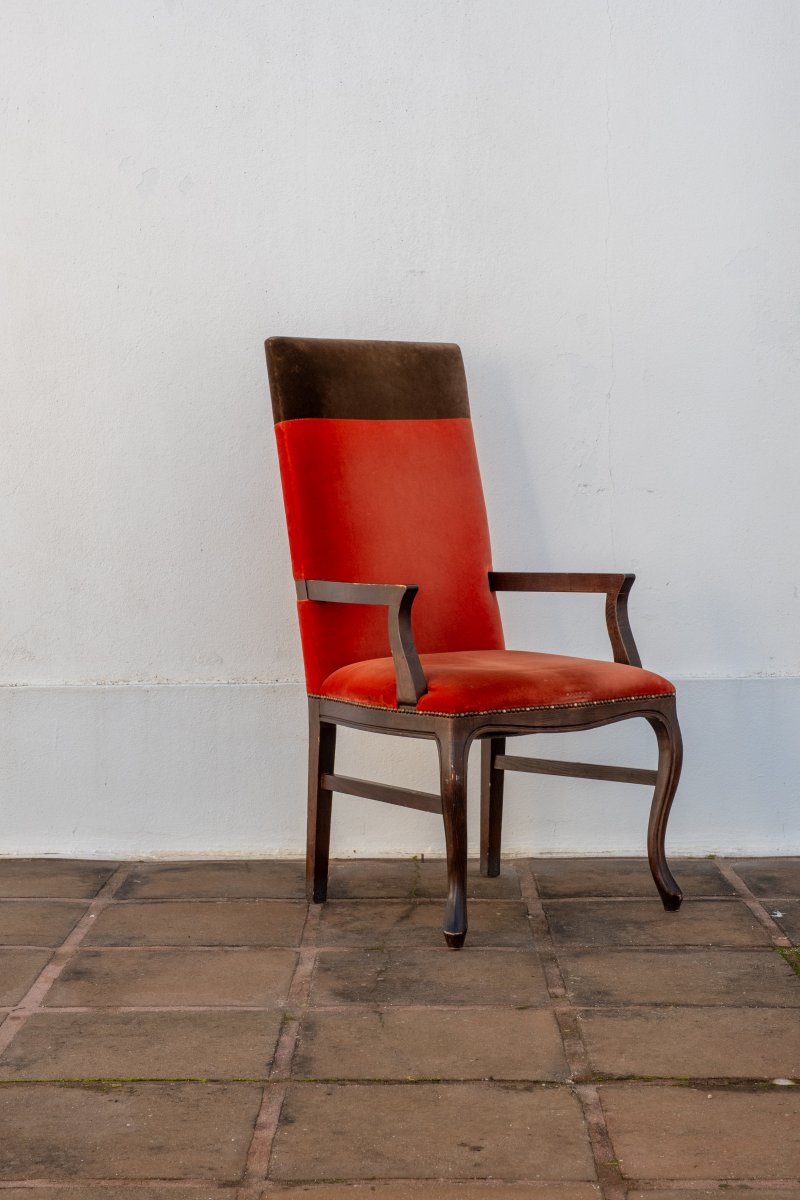 Cadeira estofada com braços, estrutura em madeira e encosto alto. Confortável e estável, adequada para zonas de estar ou quartos. Apresenta sinais normais de uso, mantendo-se em bom estado geral.