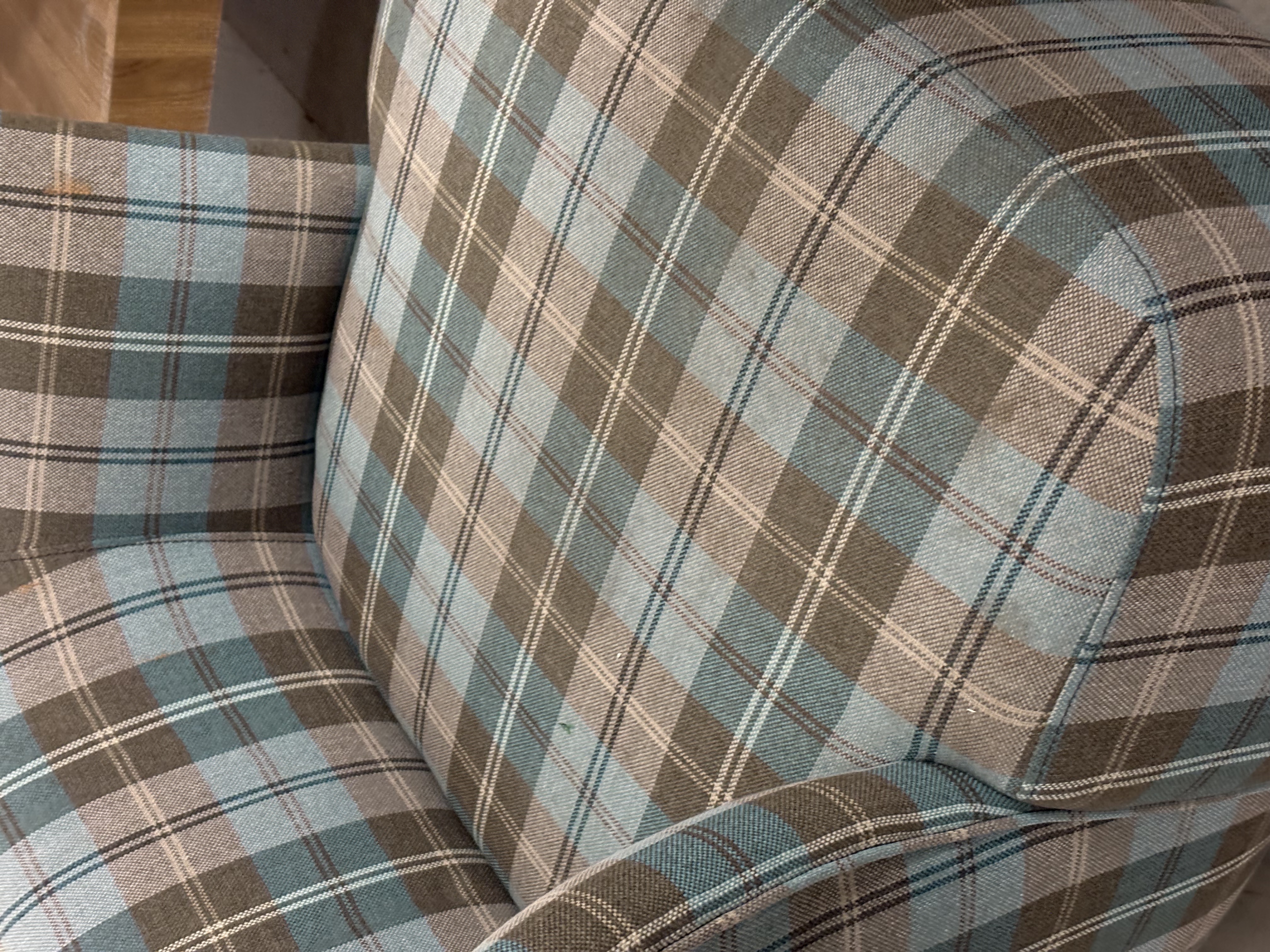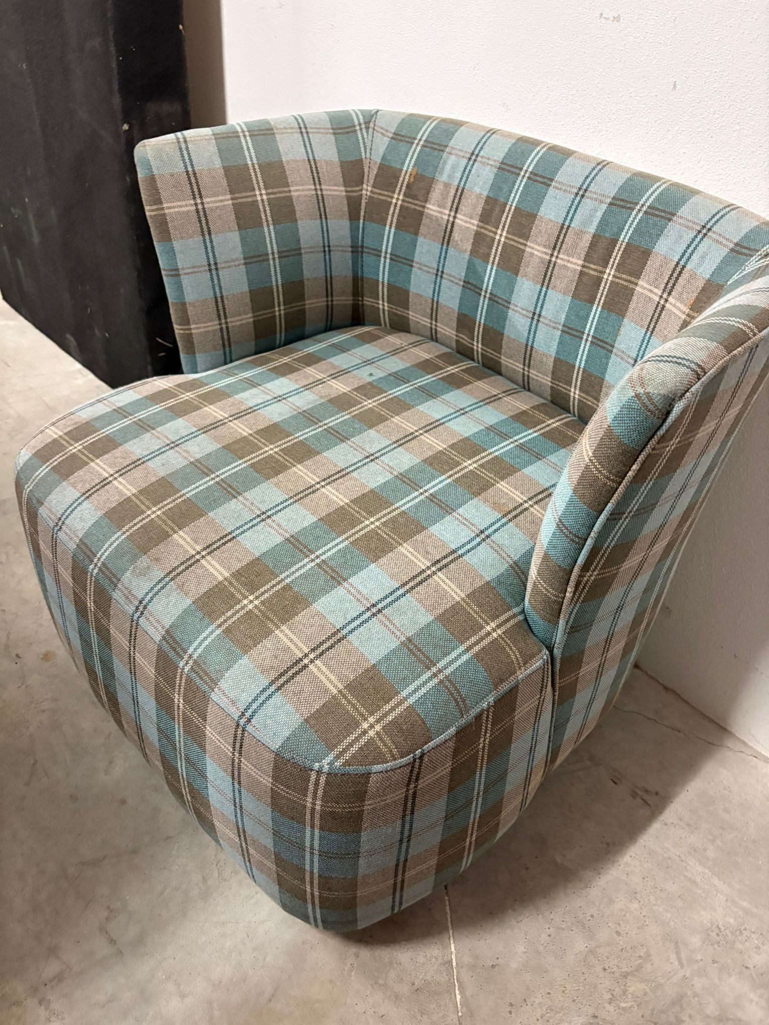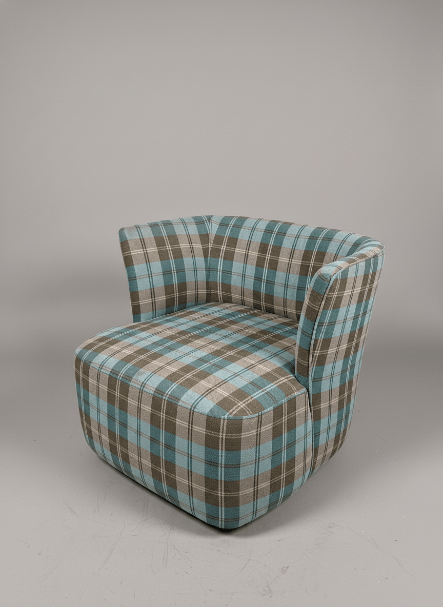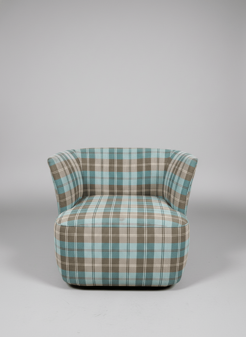 Poltrona de design contemporâneo com encosto envolvente e estofamento integral em tecido xadrez nos tons azul, castanho e bege. Compacta, confortável e visualmente marcante, esta peça combina perfeitamente em ambientes acolhedores e modernos.