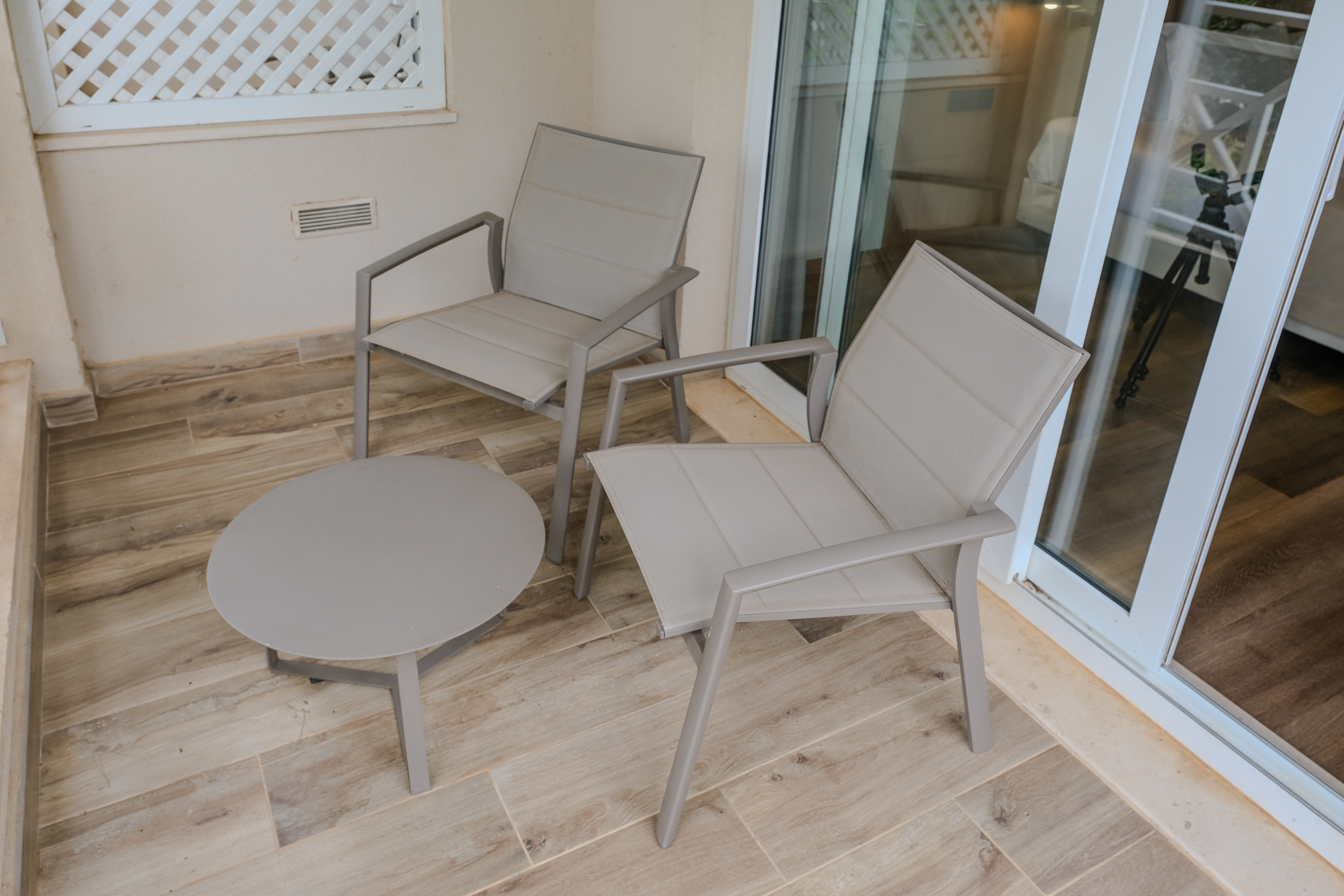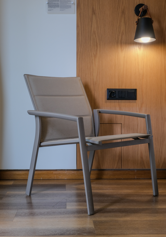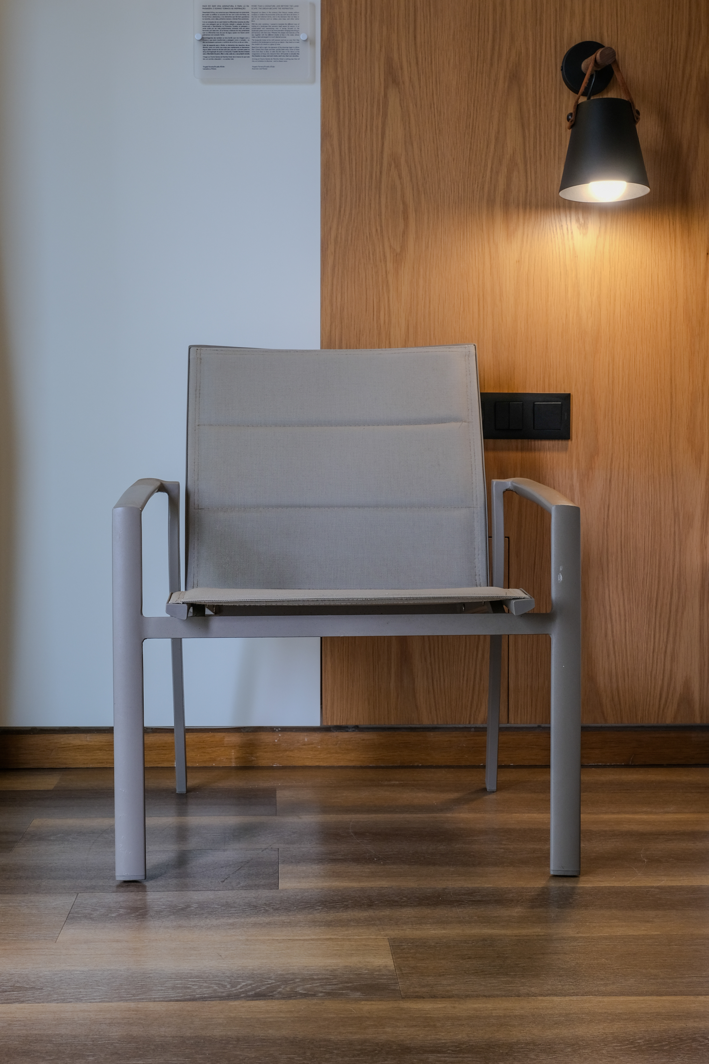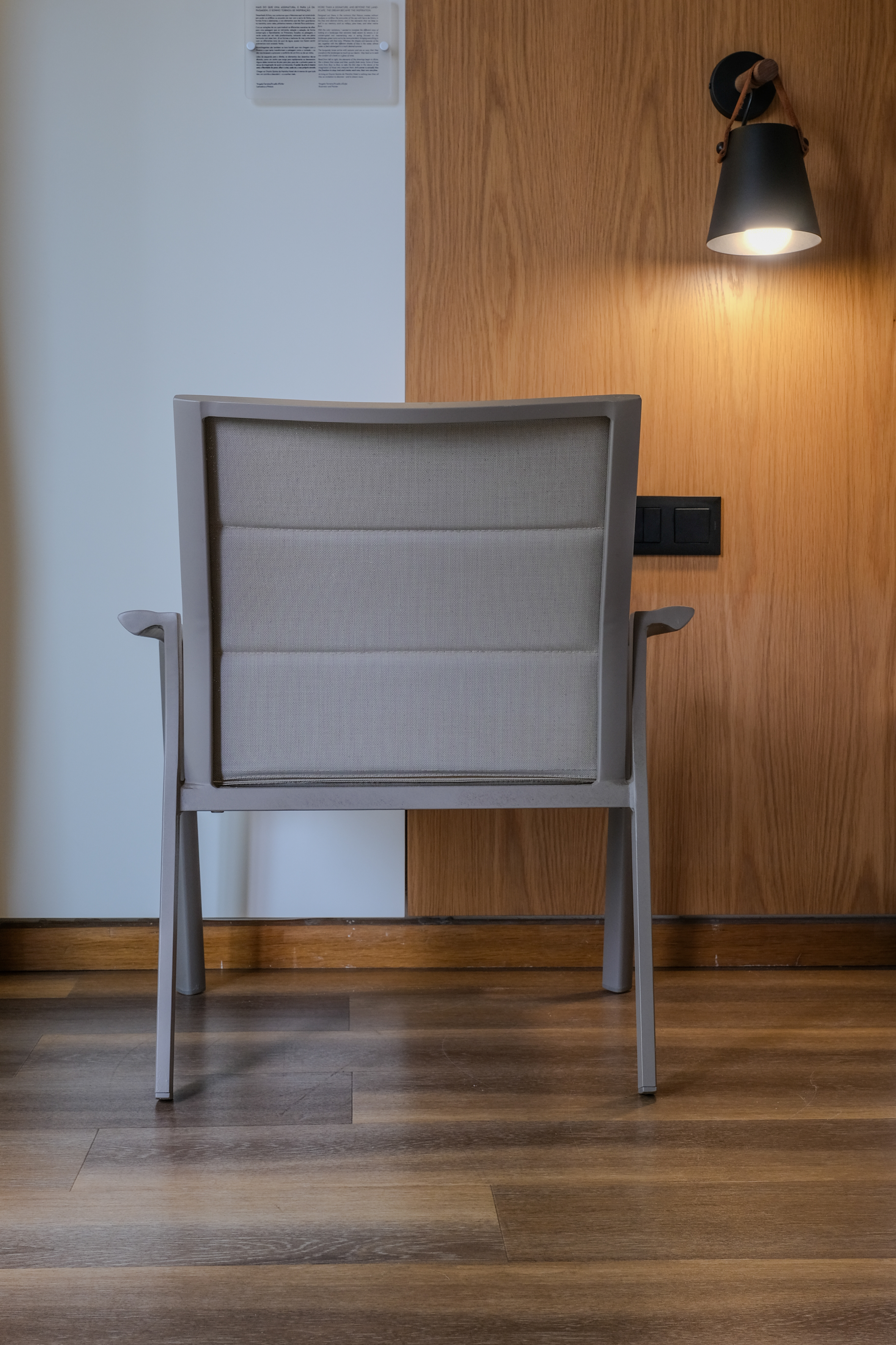 Estrutura robusta com assento/encosto em tecido cinzento/ bege resistente com estrutura metálica.