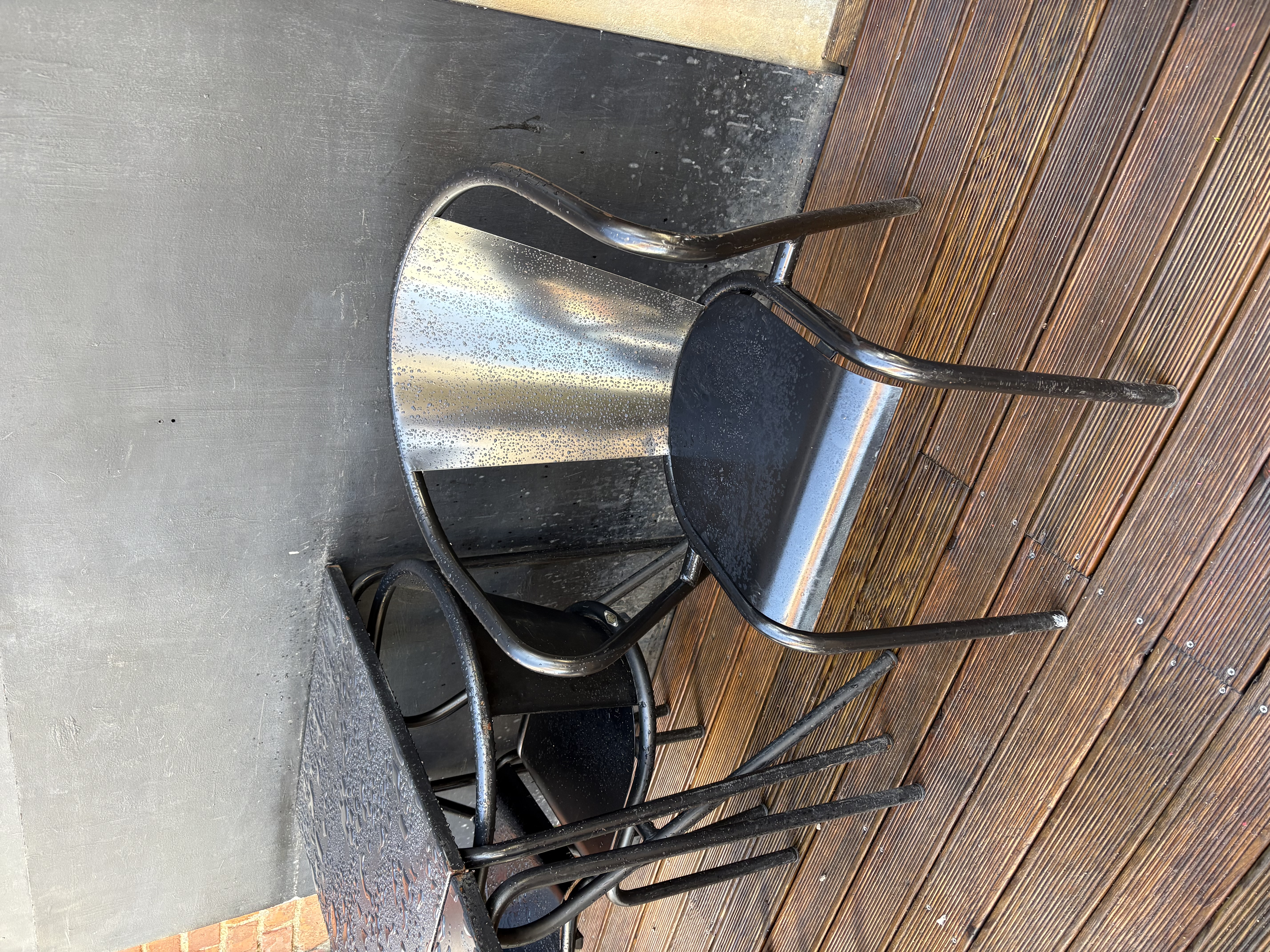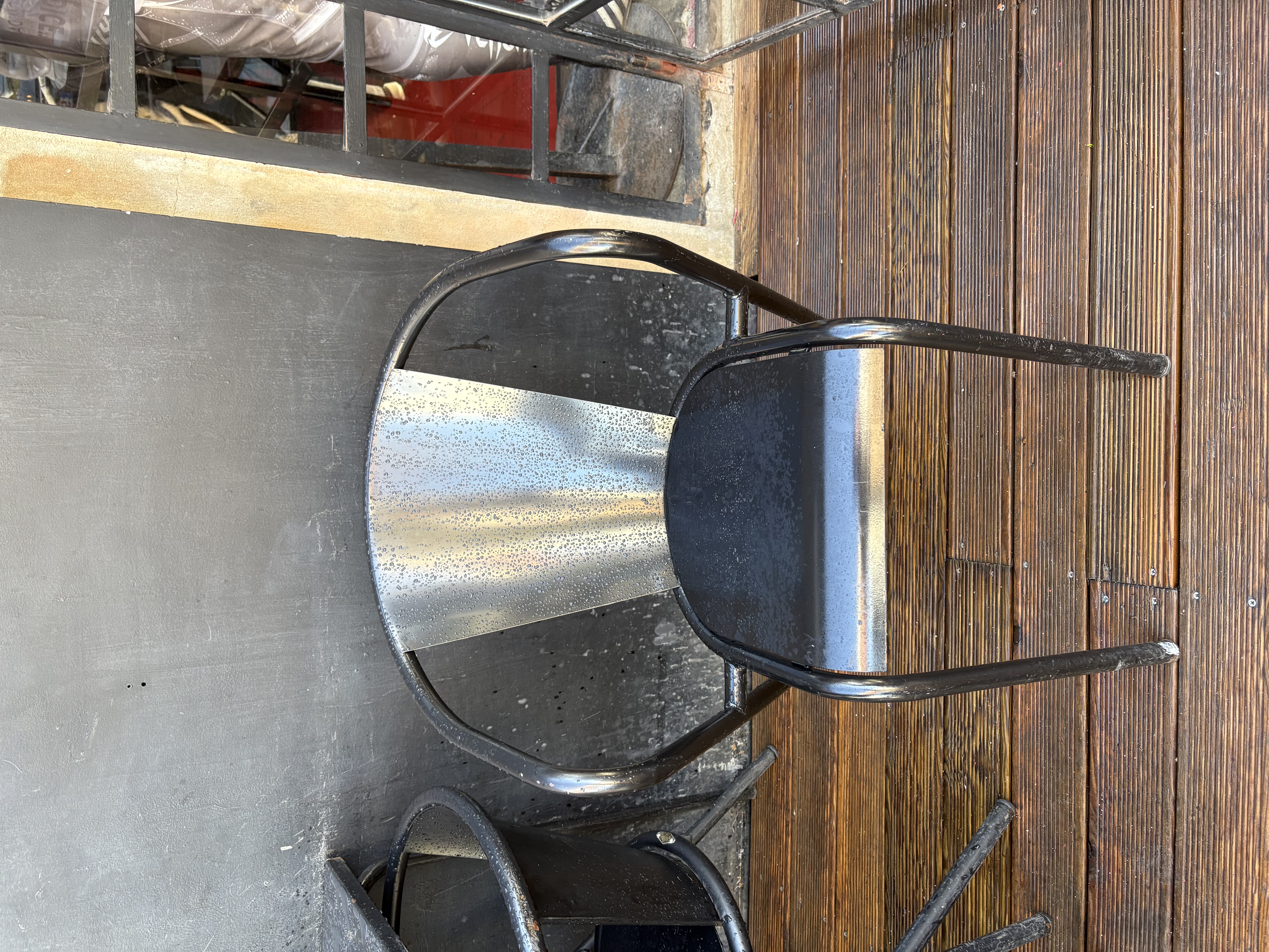Estrutura metálica robusta com braços integrados, assento e encosto em chapa metálica perfurada, ideal para uso intensivo em interior ou exterior coberto.