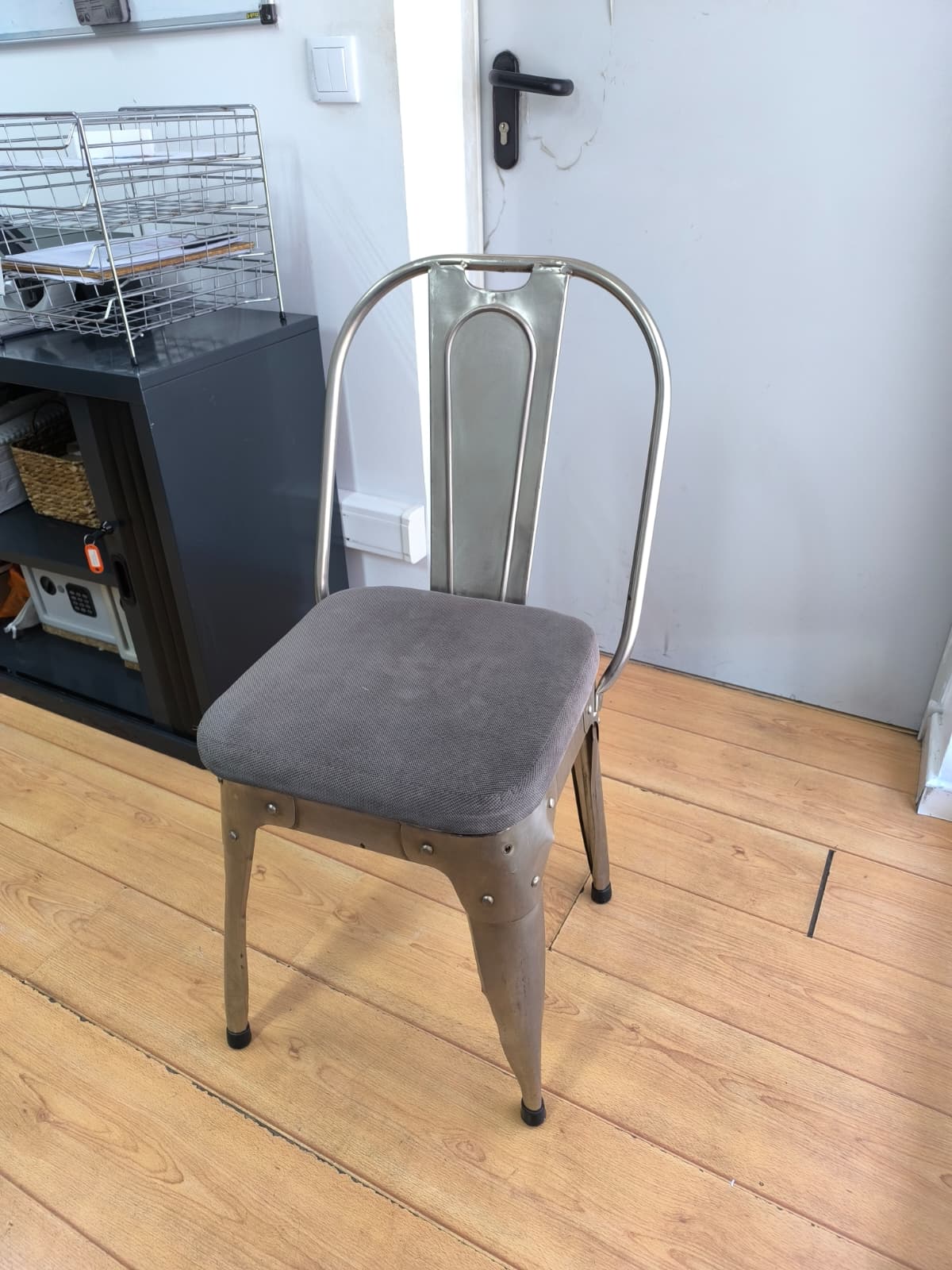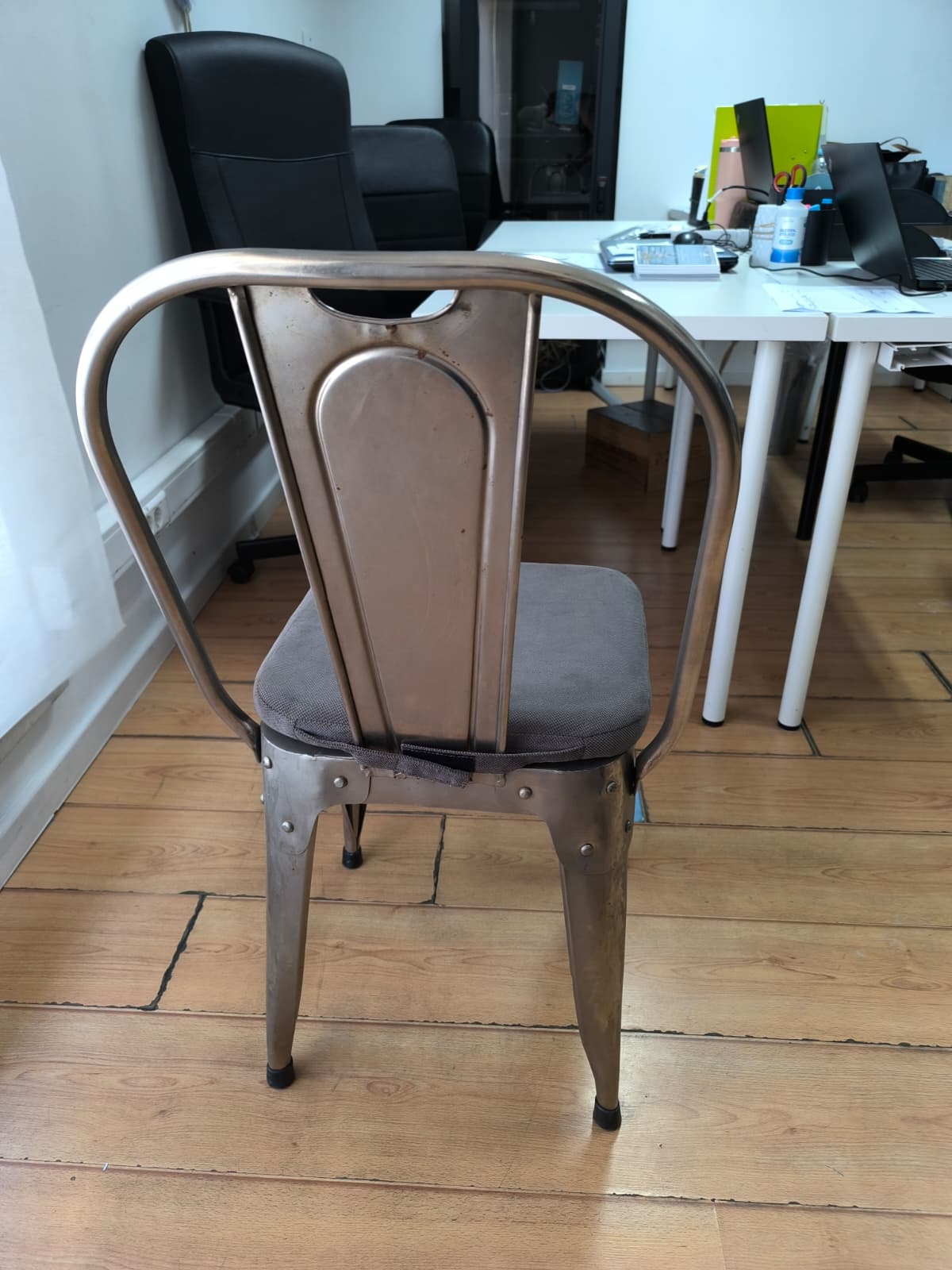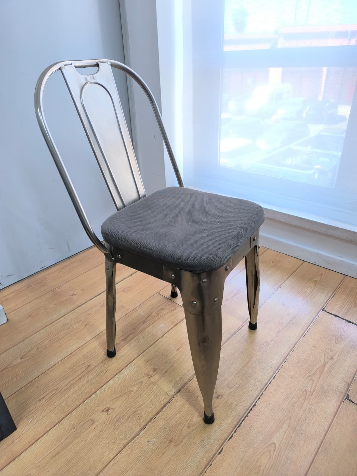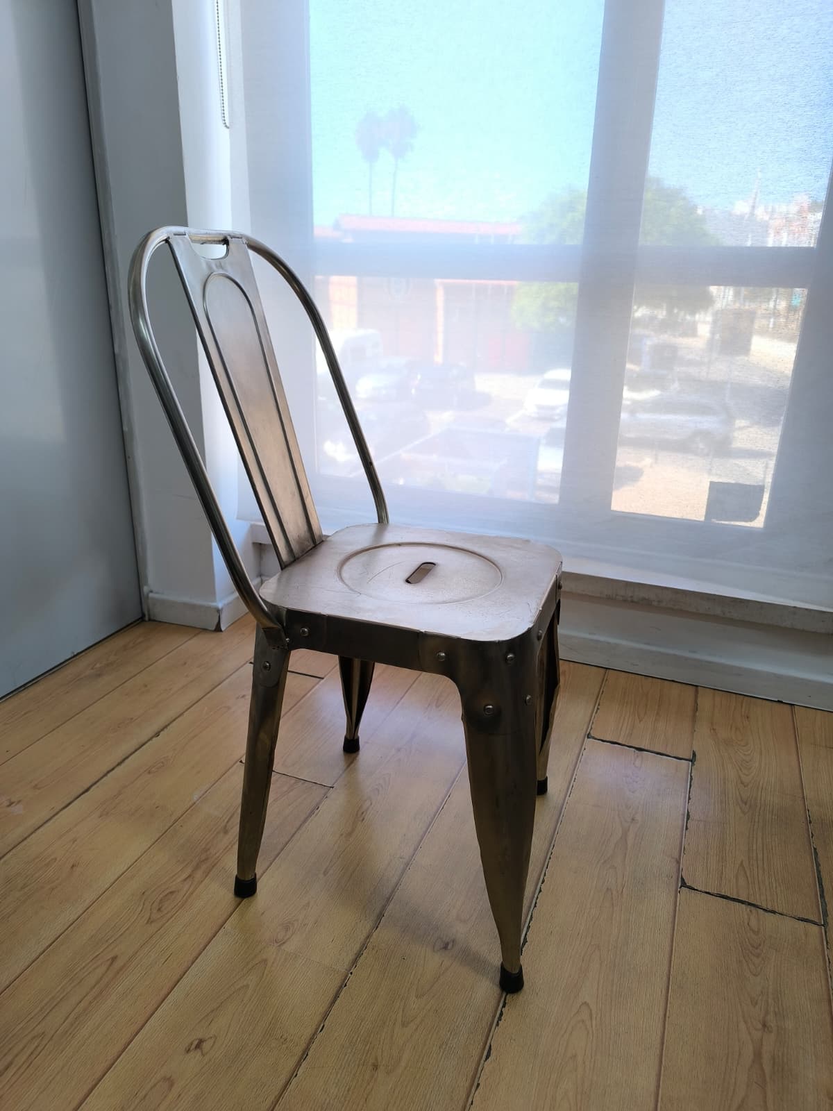 Cadeira em metal cromado, resistente e com linhas industriais, perfeita para ambientes de hotelaria, cafés, restaurantes ou decoração vintage.