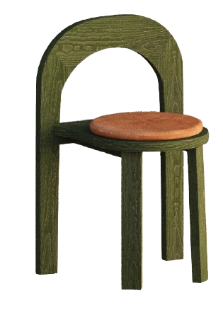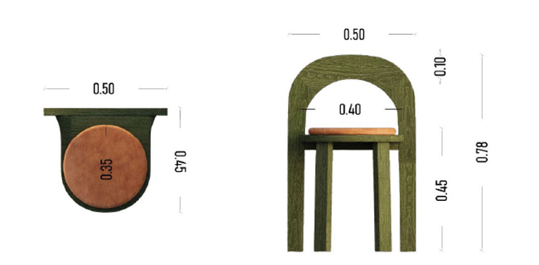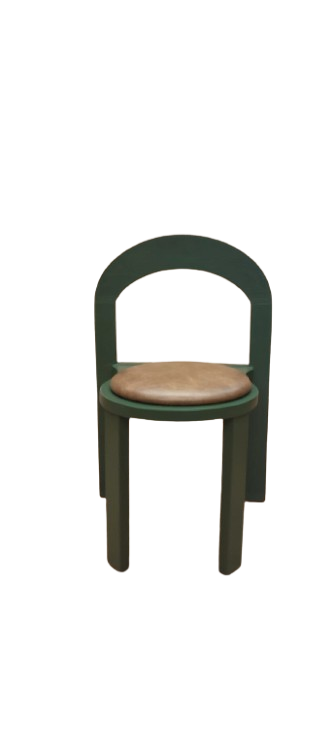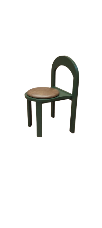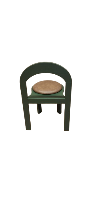 Cadeira em madeira e assento estufado a couro sintético na cor verde e castanha. O artigo possui costas em arco e assento no formato de círculo e está apto para uso hoteleiro.