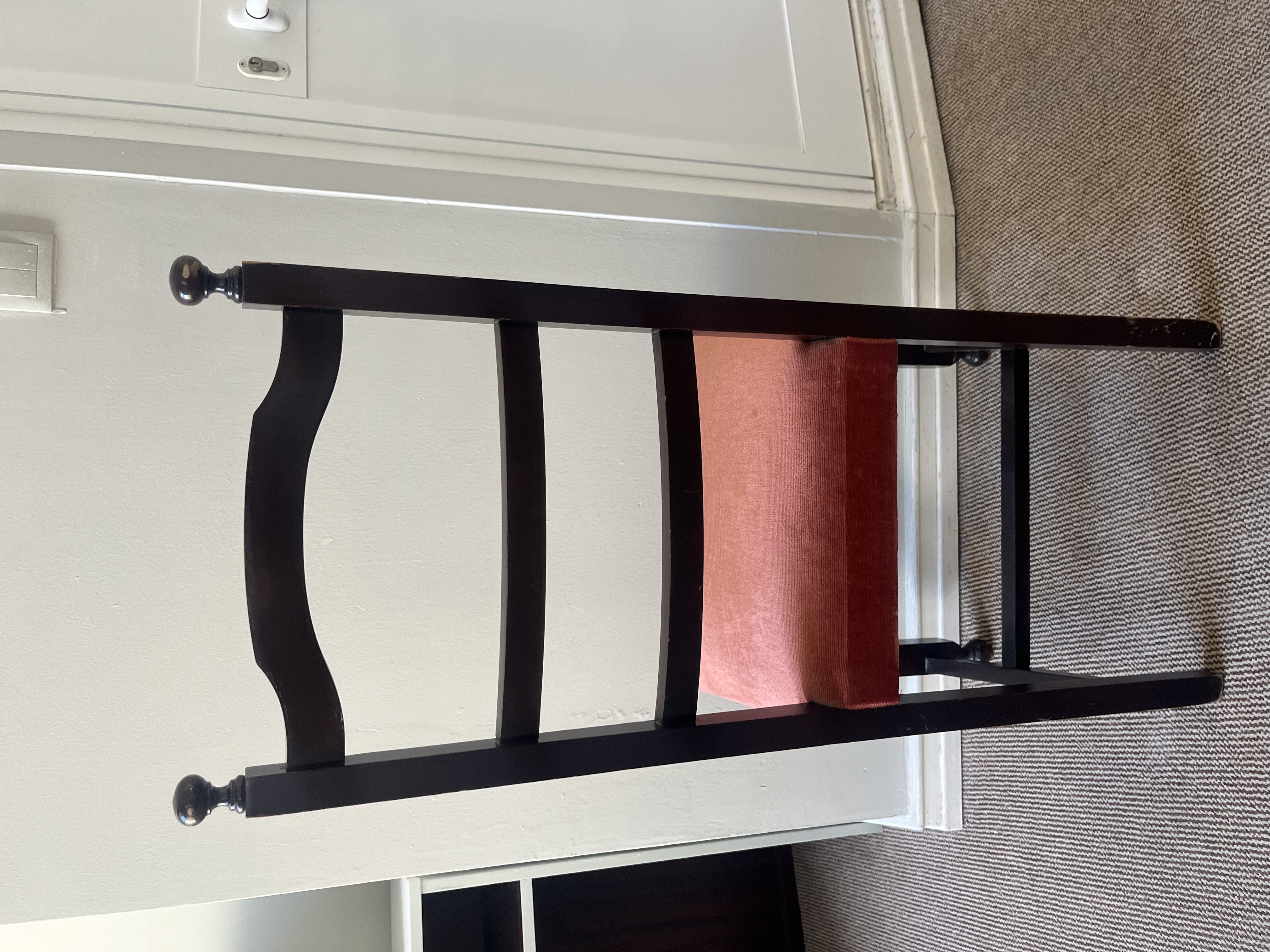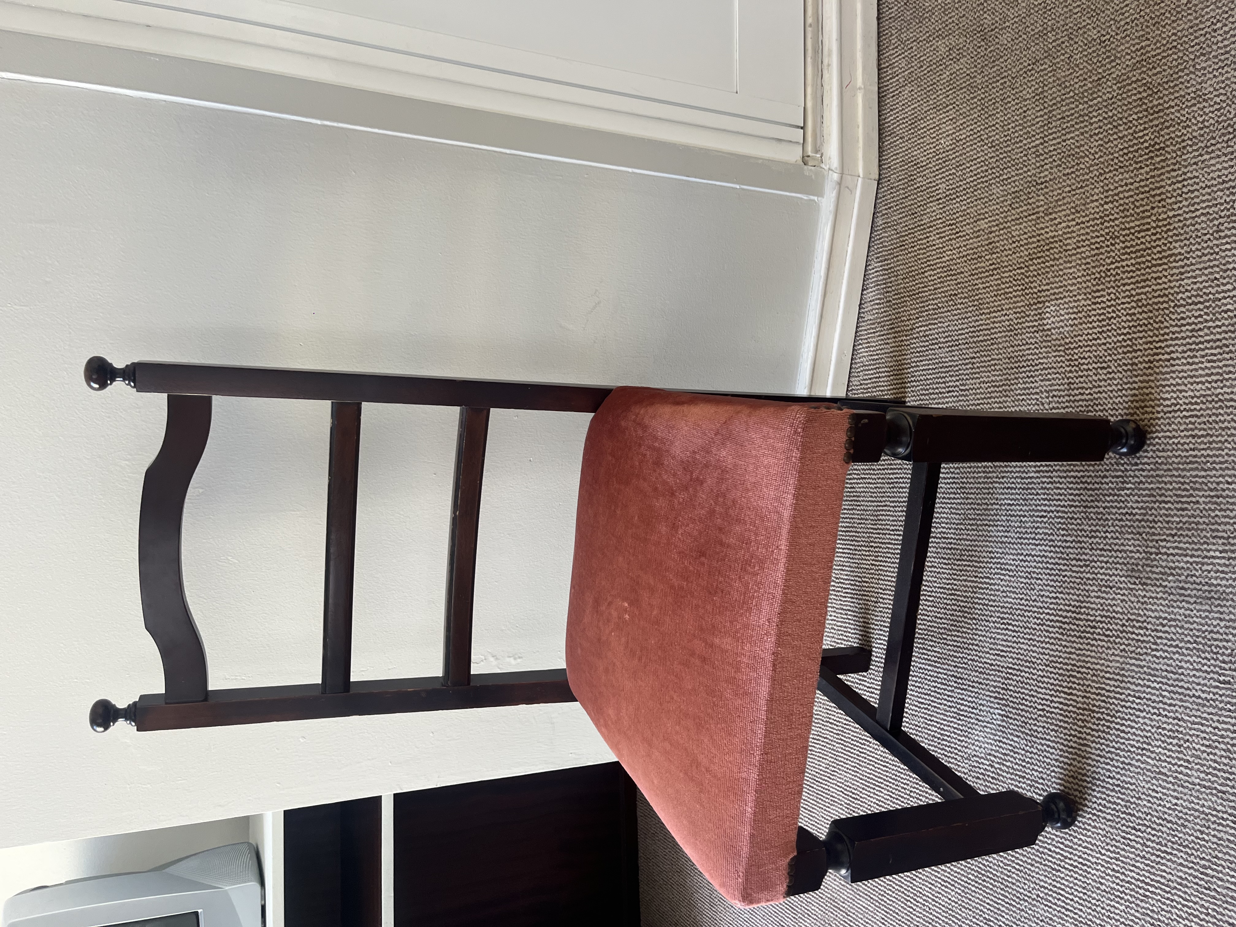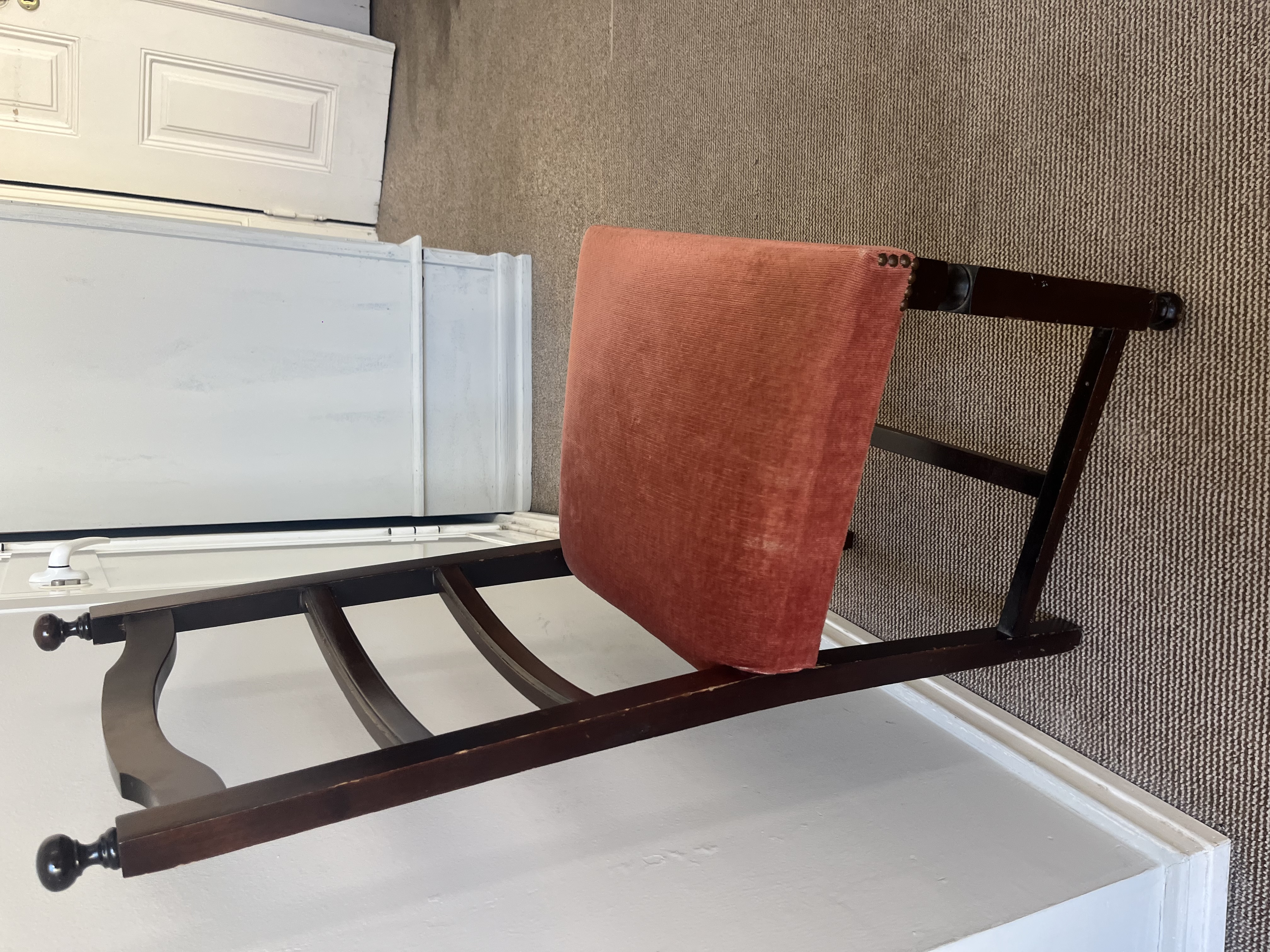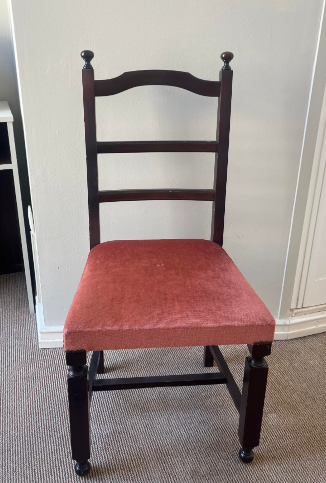 Cadeira clássica em madeira escura, com assento estofado em tecido encarnado