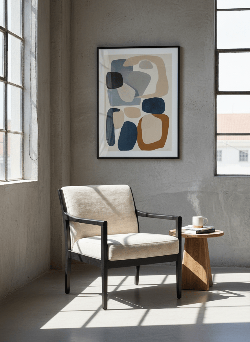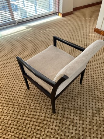 Cadeirão em estrutura de madeira preta e forro em tecido bege.