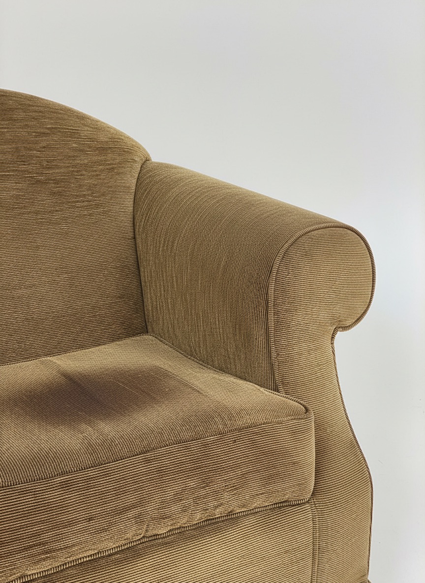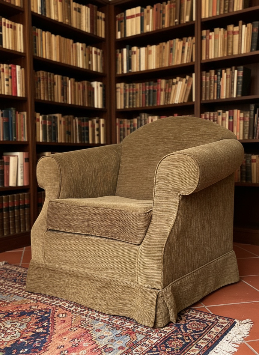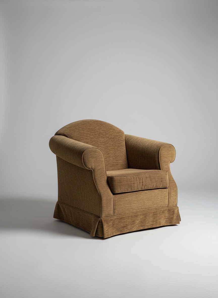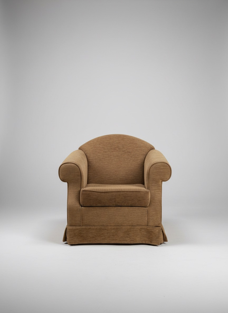 Poltrona estofada em tons castanho, com encosto e braços arredondados.