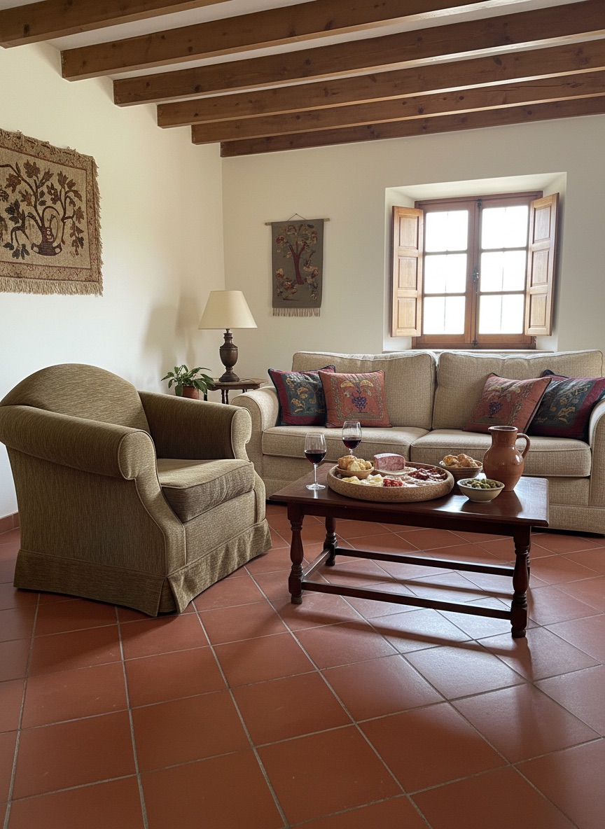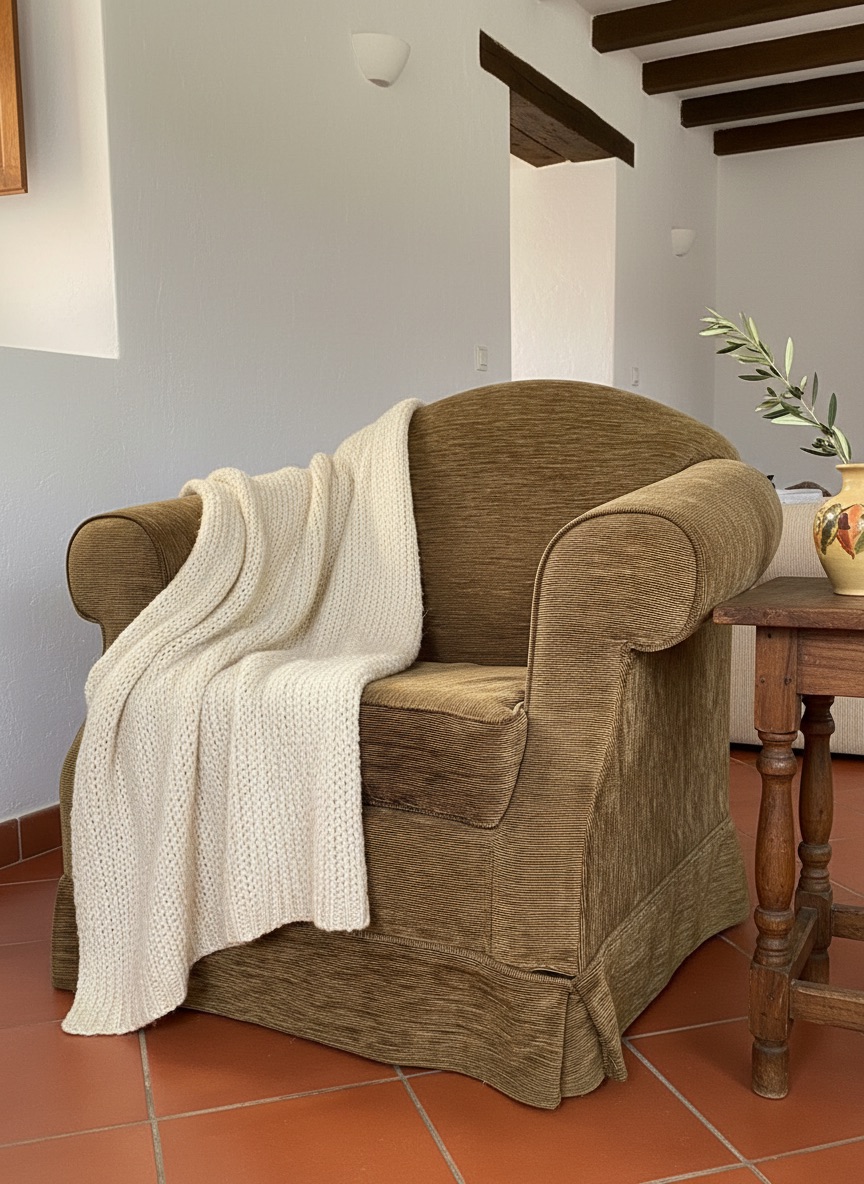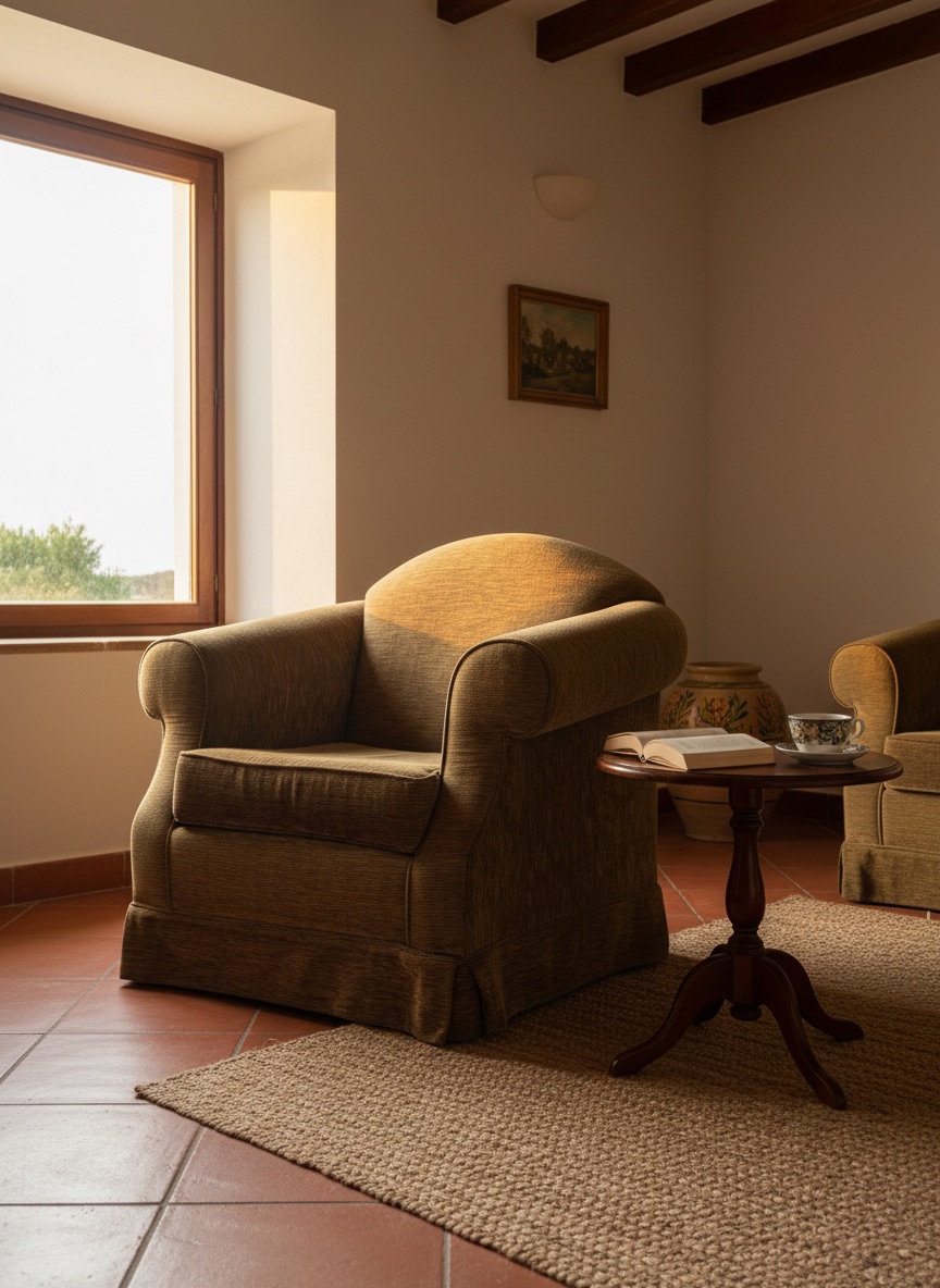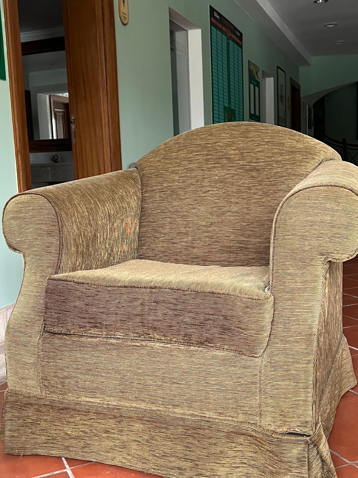 Poltrona estofada em tons castanho, com encosto e braços arredondados.