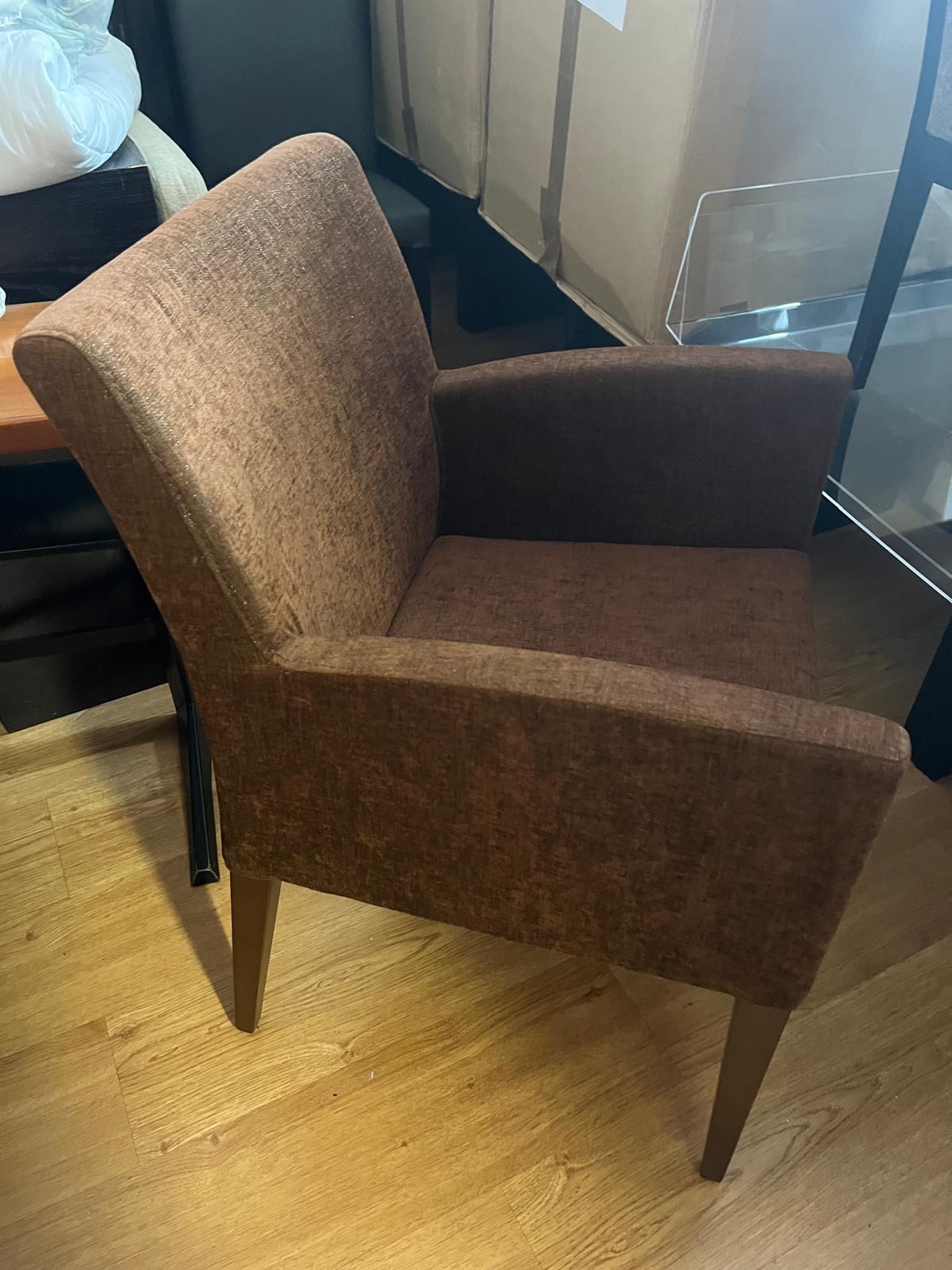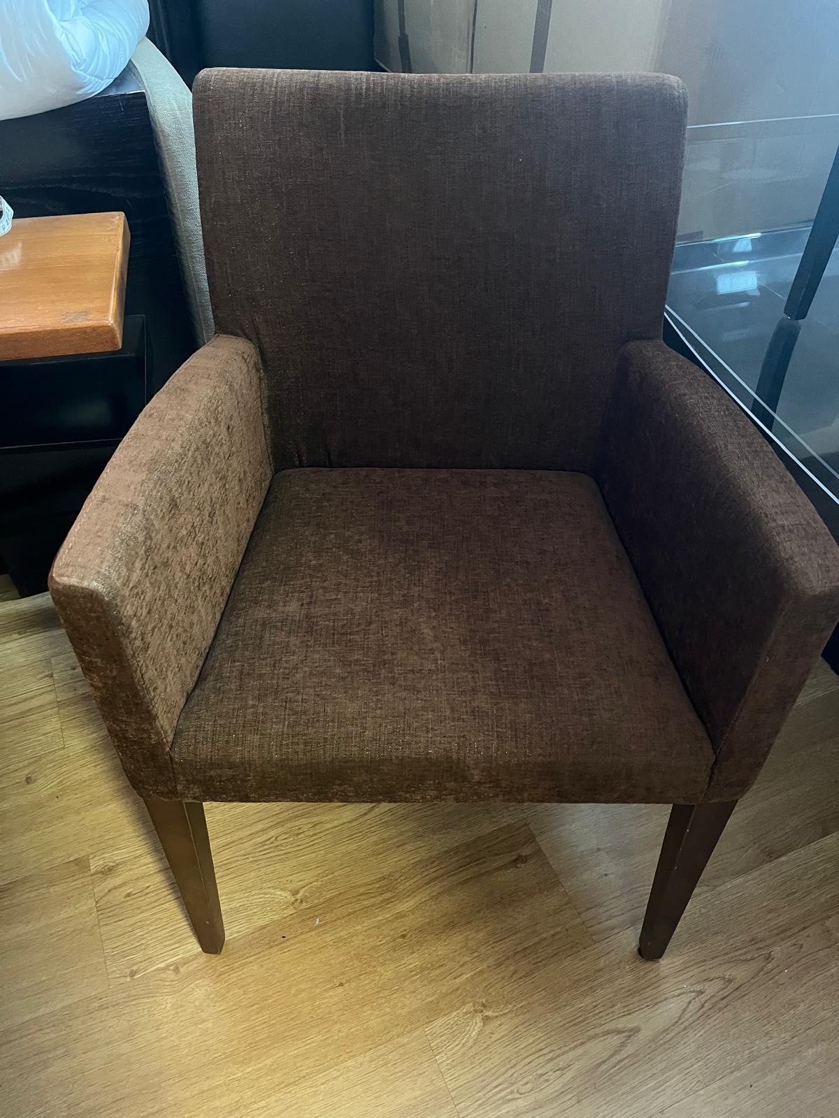 Cadeirão em estrutura de madeira e forro em tecido castanho.