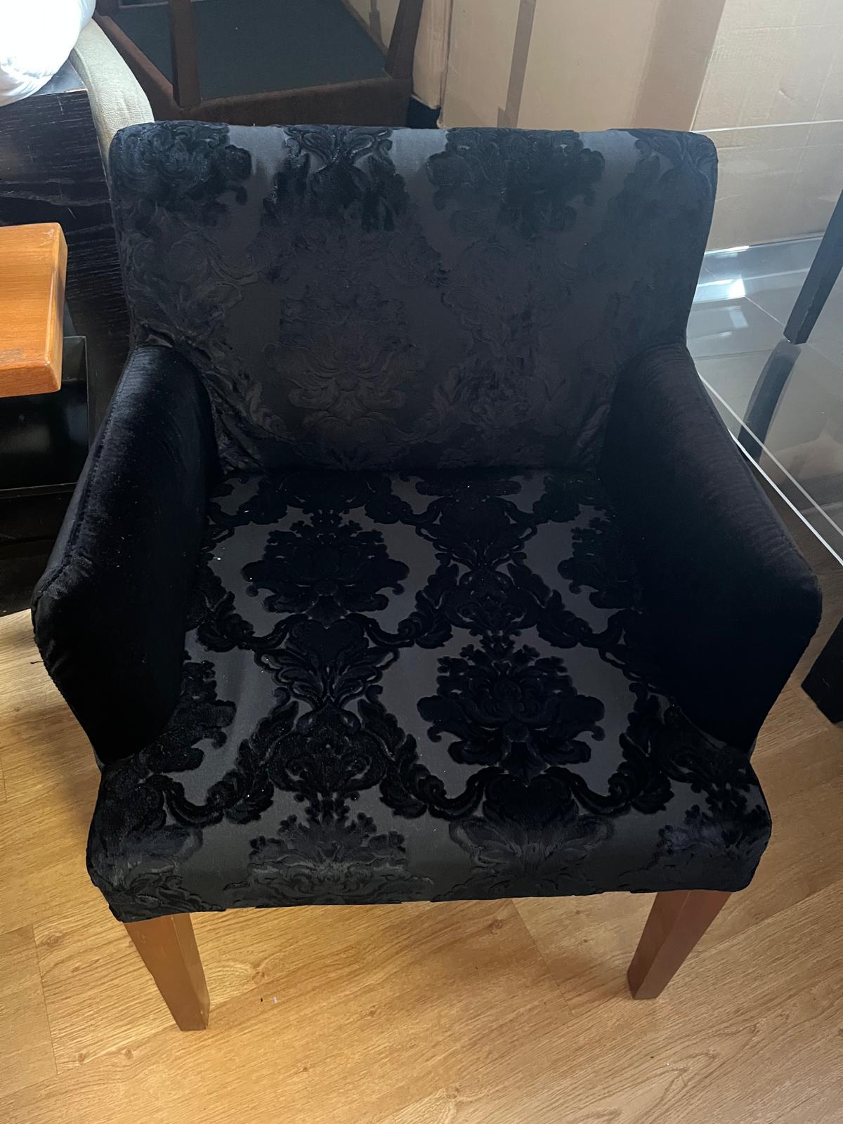 Cadeirão em estrutura de madeira e forro em veludo preto com pernas madeira castanha.