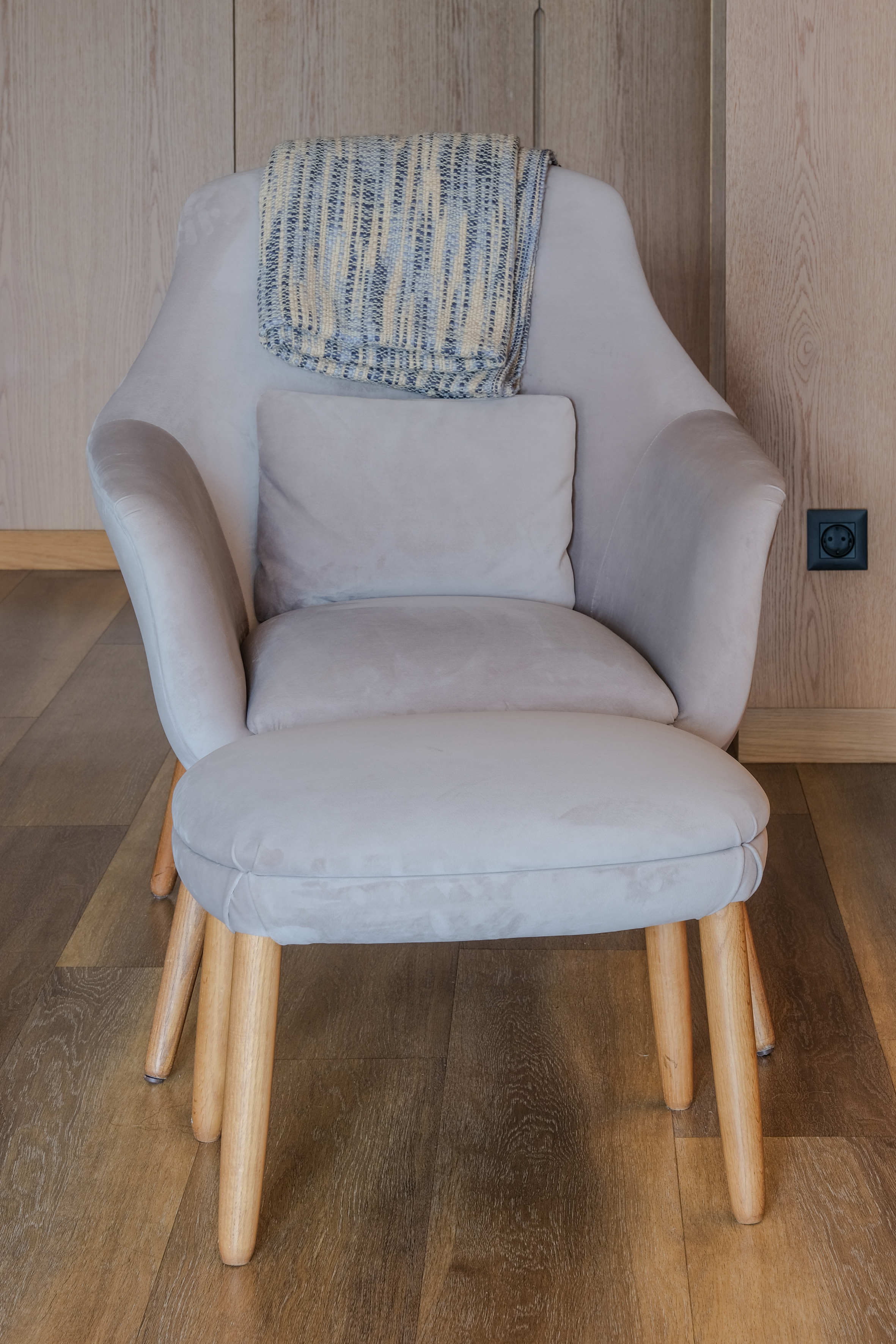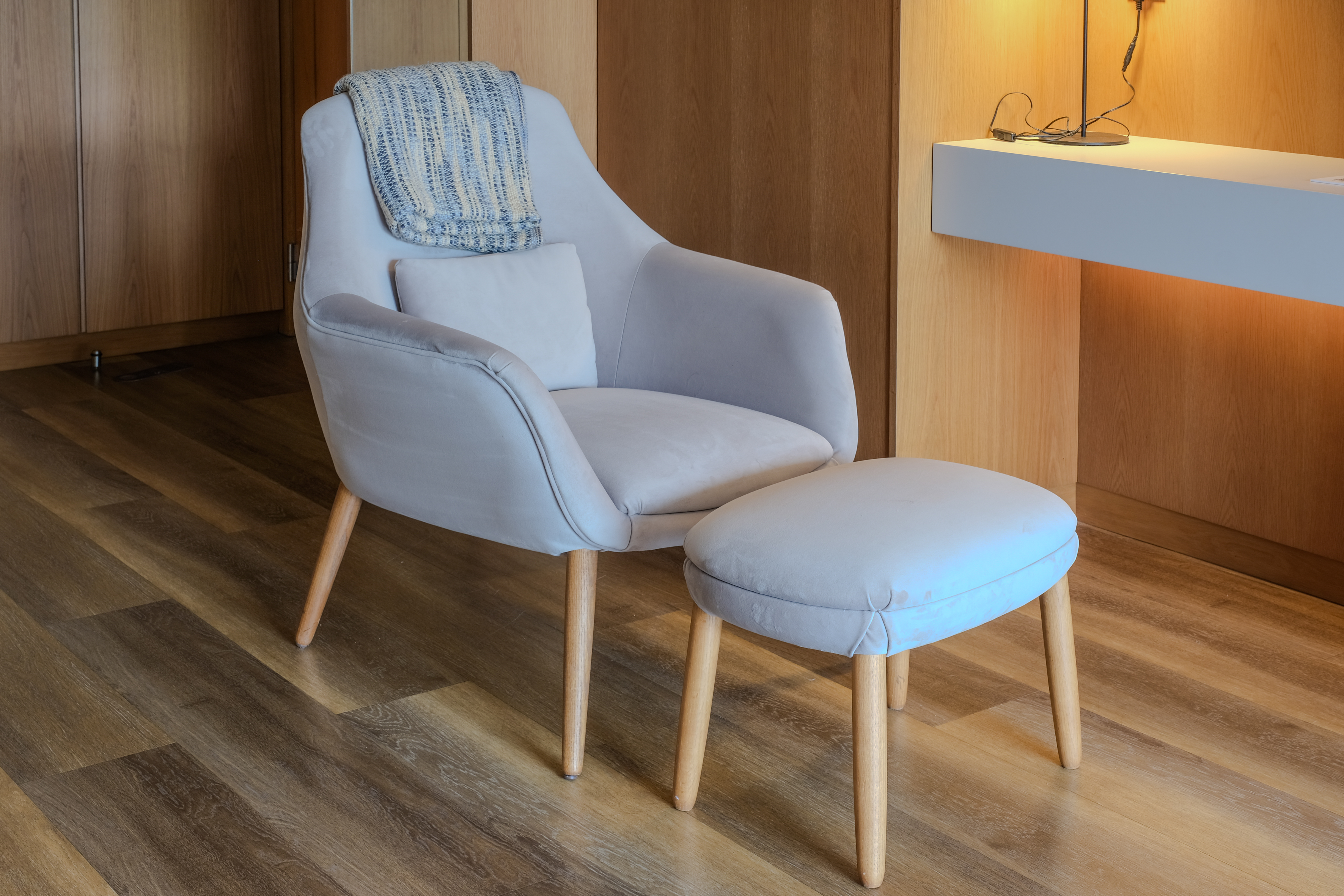 Cadeirão estofado de linhas suaves e envolventes, acompanhado por apoio de pés a condizer, concebido para proporcionar máximo conforto e uma estética acolhedora. O conjunto destaca-se pelo design equilibrado, ideal para criar zonas de descanso elegantes em quartos, suites ou áreas lounge.