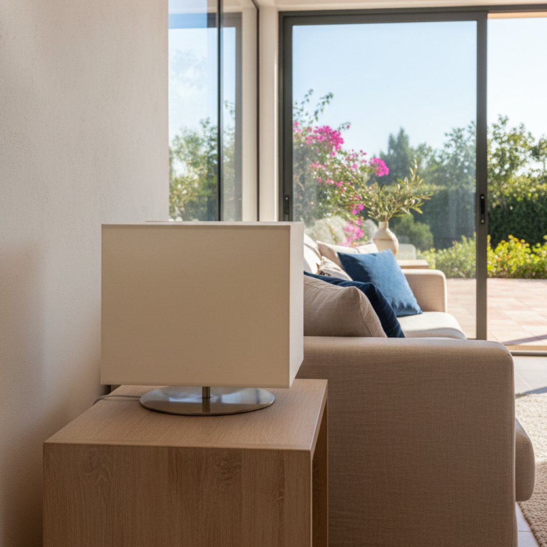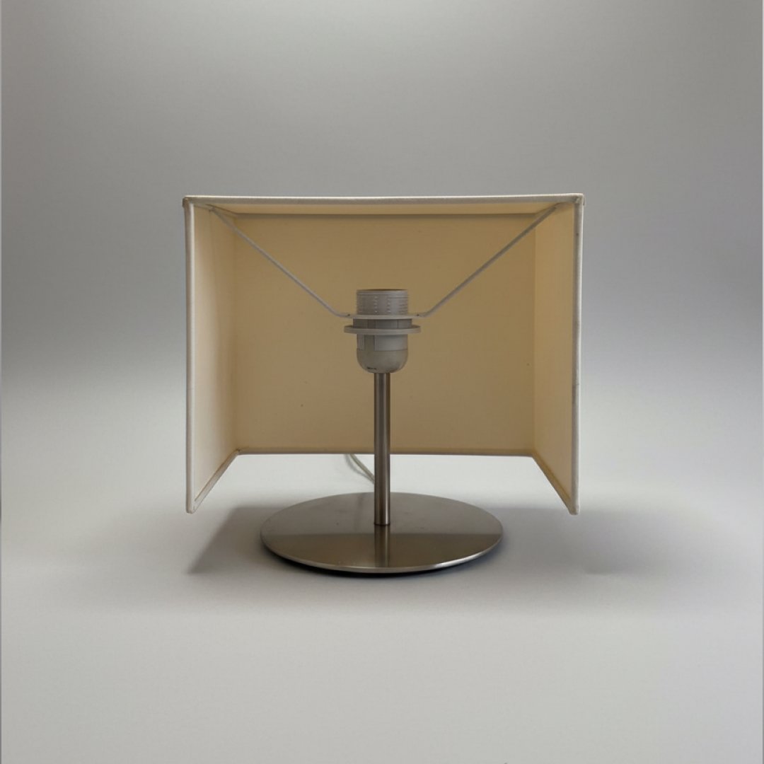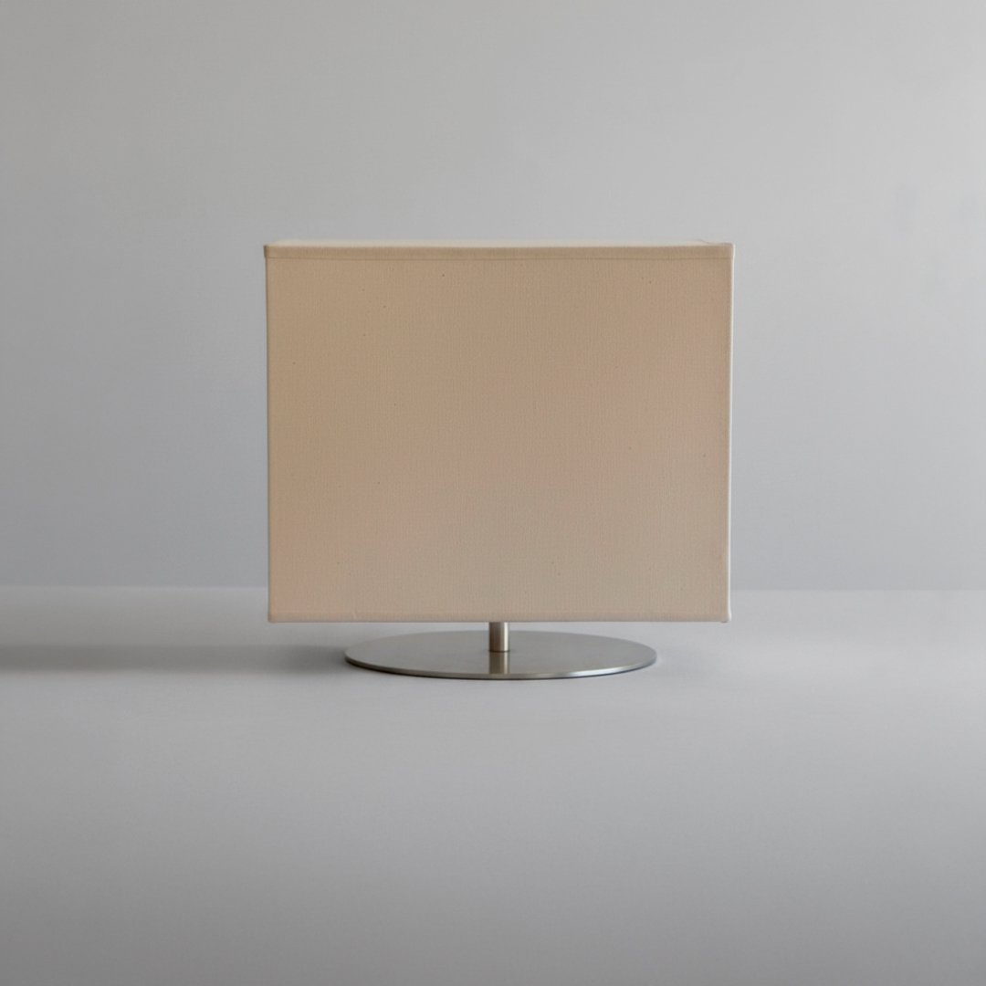 Este artigo é um candeeiro de mesa com uma base circular plana e haste central em metal com acabamento escovado. Possui um abajur retangular em tecido de cor branca/cru, estruturado internamente. O sistema de ligação inclui um casquilho visível sob o abajur e um cabo elétrico com interruptor integrado e ficha padrão.