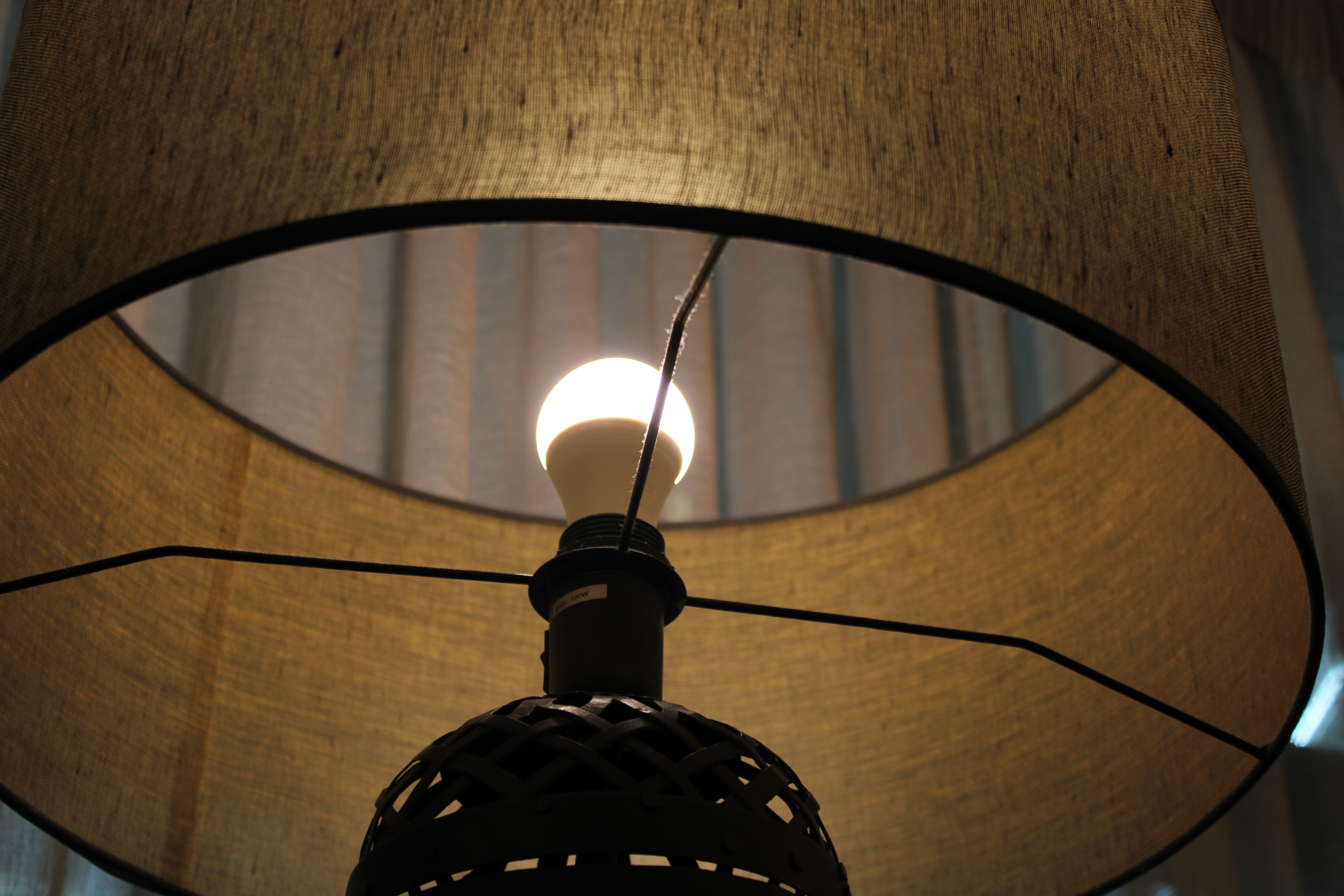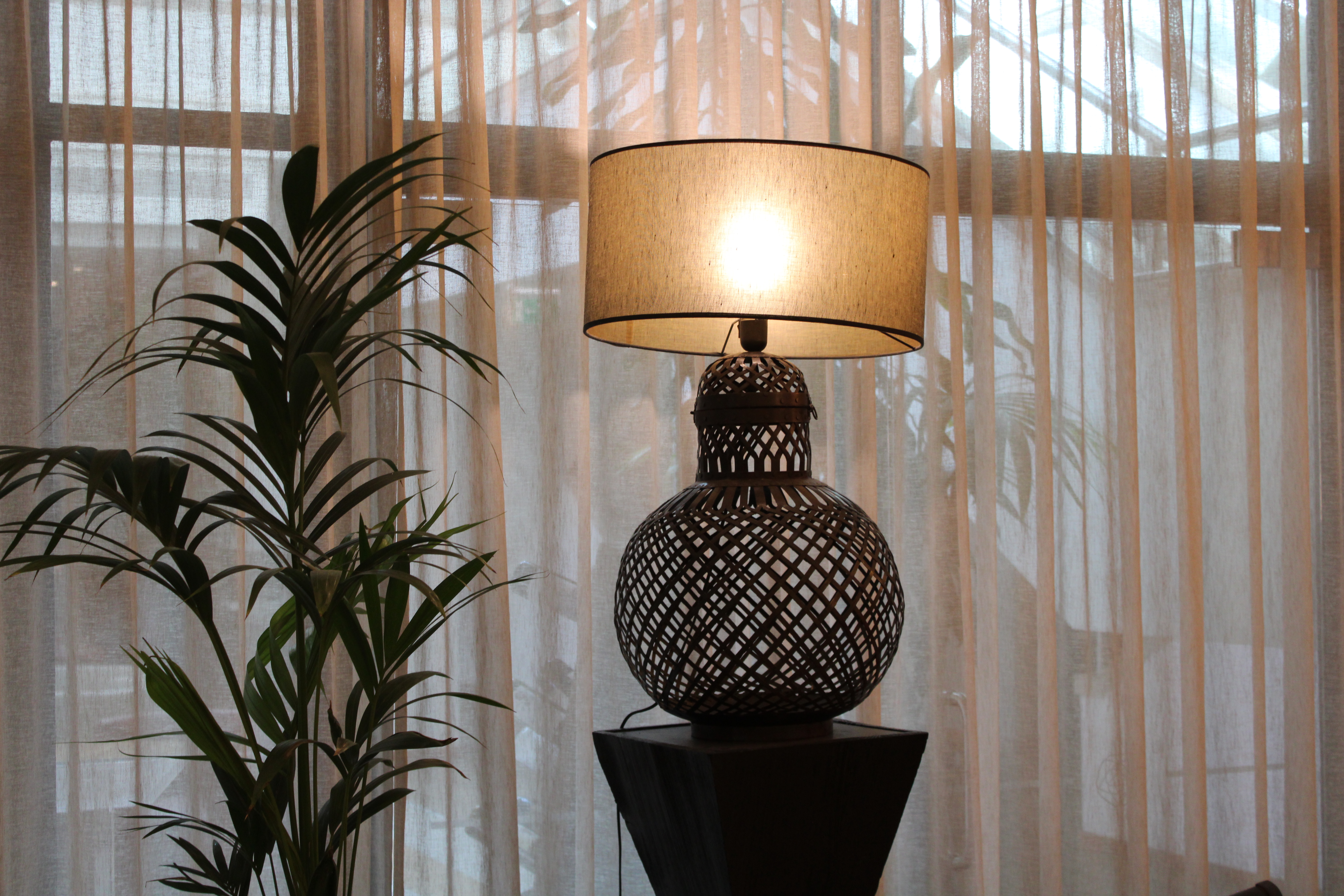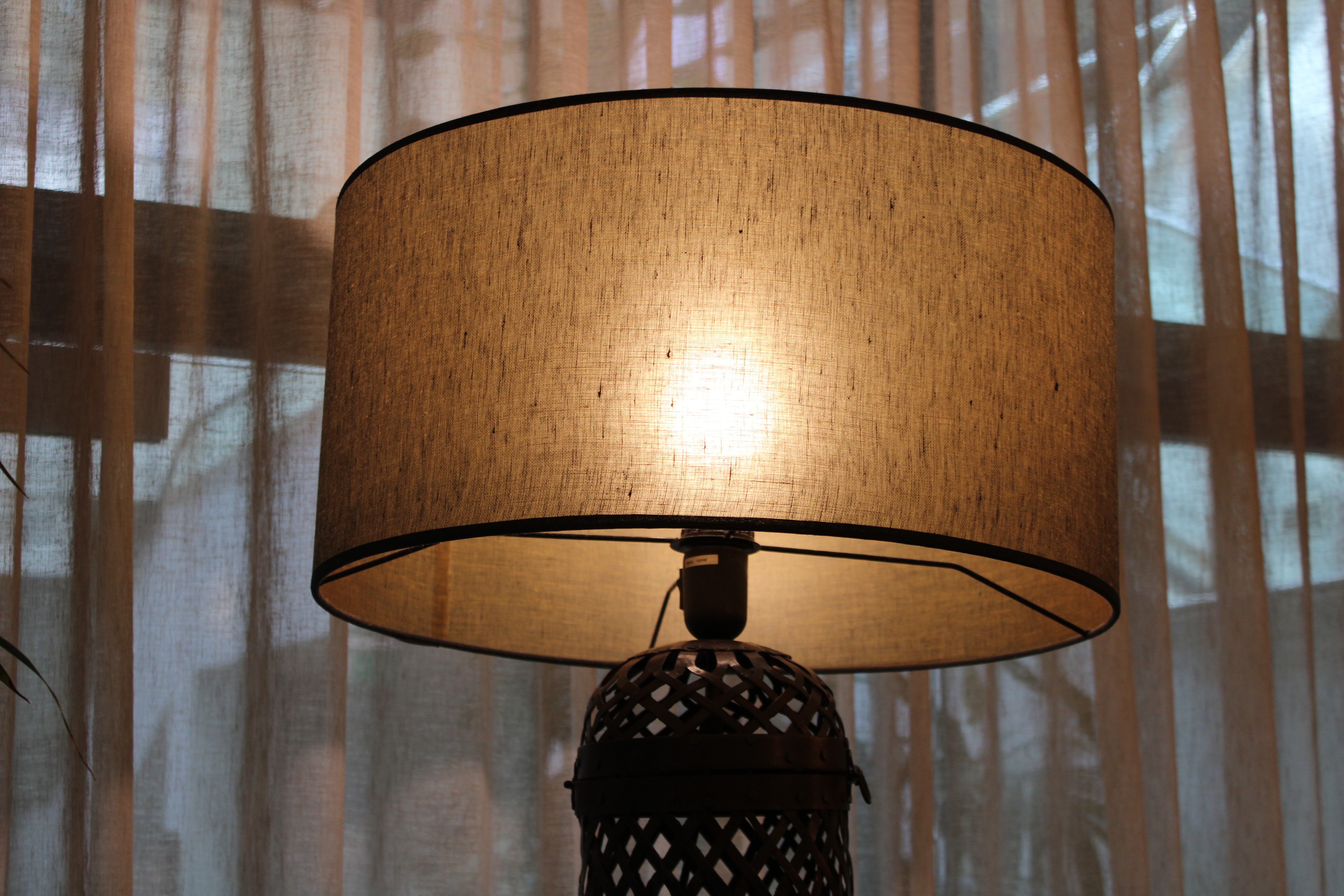 Candeeiro de mesa com estrutura metálica trabalhada, de padrão vazado, e abat-jour em tecido que proporciona uma iluminação suave e acolhedora. Uma peça decorativa com forte presença visual, ideal para criar ambientes quentes e sofisticados.