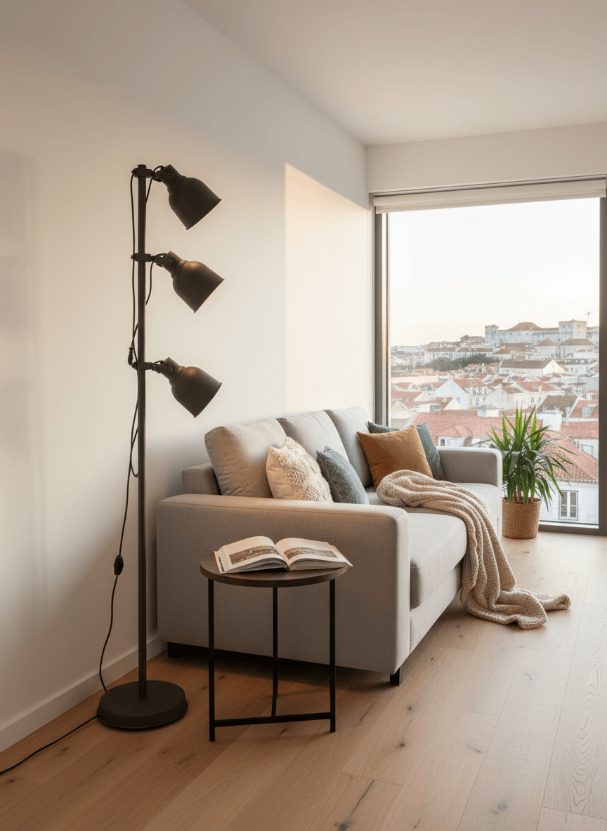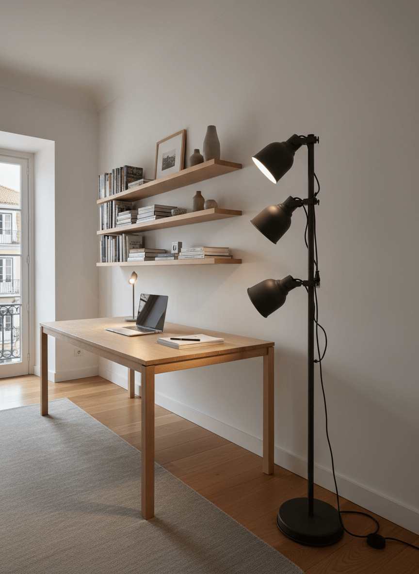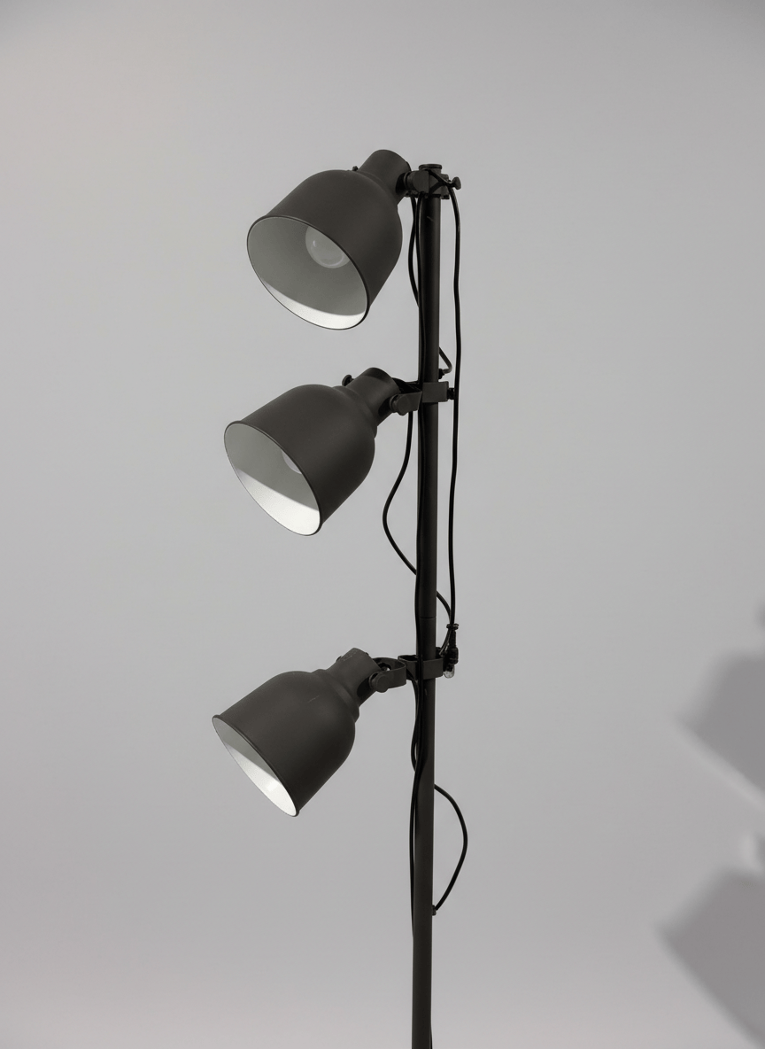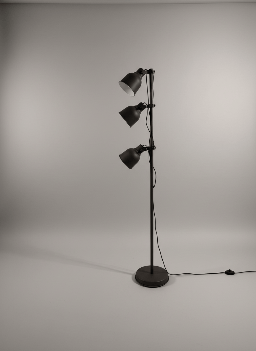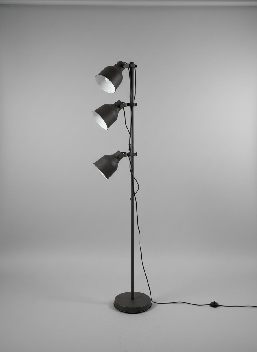 Candeeiro de pé de estilo moderno e funcional, com estrutura metálica preta e três focos orientáveis, ideais para direcionar a luz conforme a necessidade. Perfeito para criar iluminação ambiente ou de leitura em salas de estar, quartos ou escritórios. Design simples e contemporâneo, fácil de integrar em diferentes estilos de decoração.
