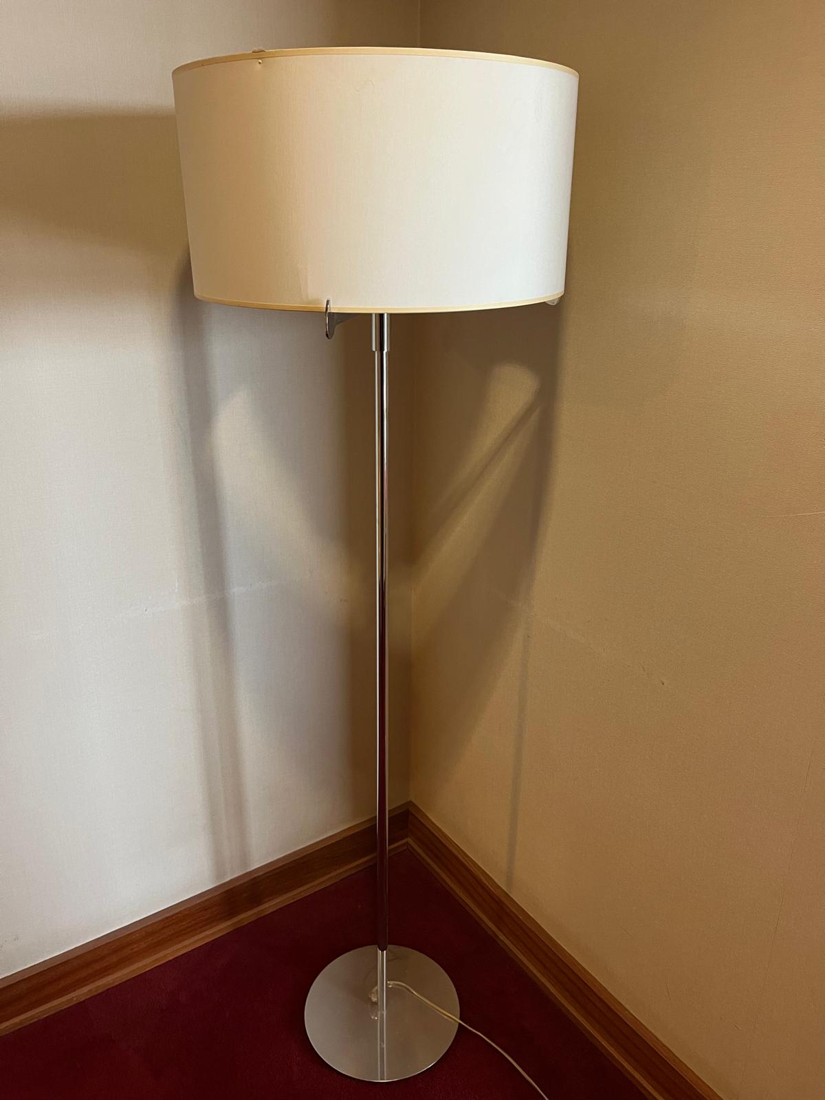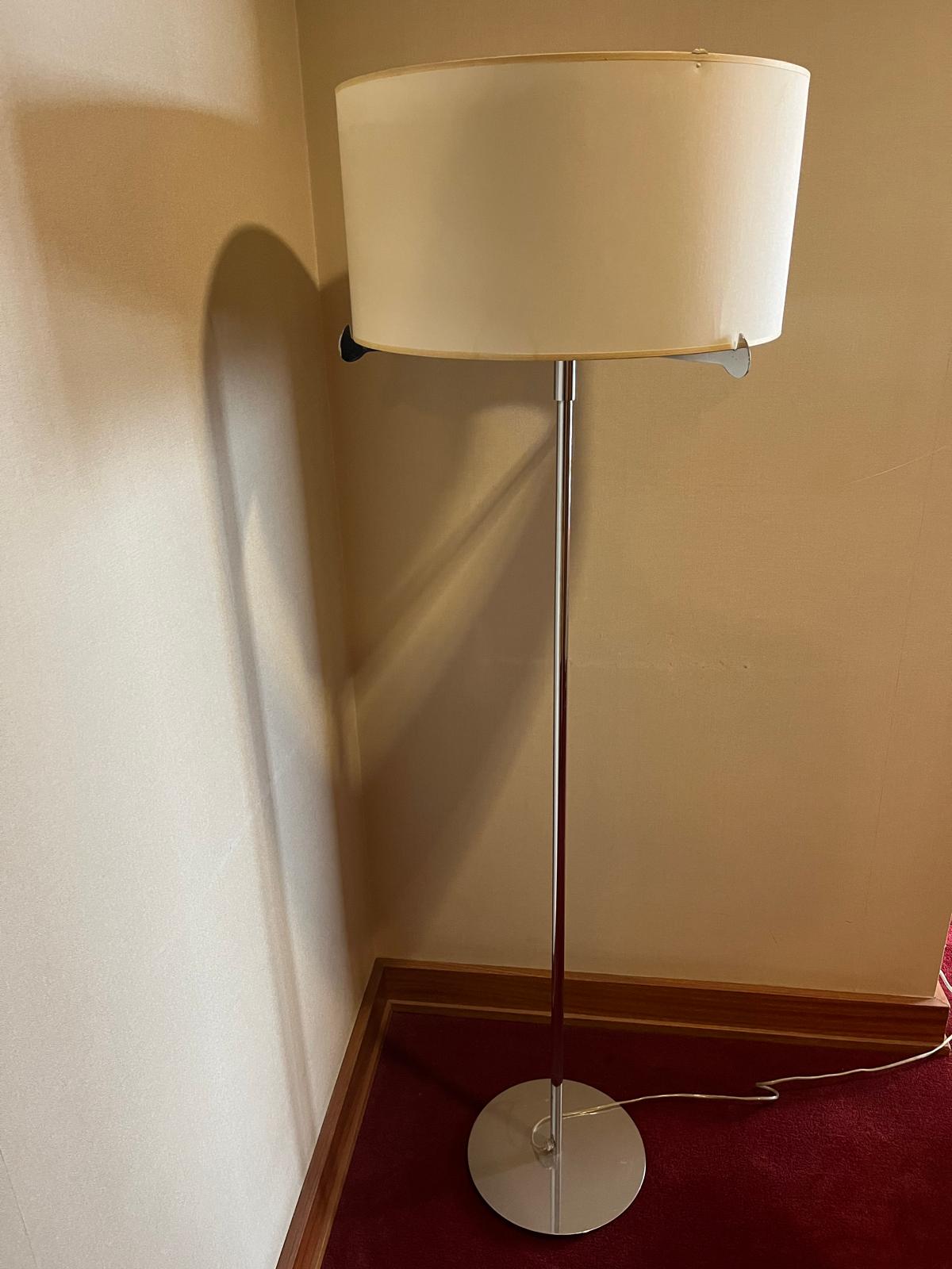 A estrutura é composta por uma base redonda em aço inoxidável (inox) com acabamento polido, conferindo-lhe um design moderno e estável. O abajur cilíndrico é de cor creme ou off-white, feito em tecido. Apresenta ligeiras marcas ou amolgadelas na superfície do abajur, visíveis na parte superior direita da imagem.