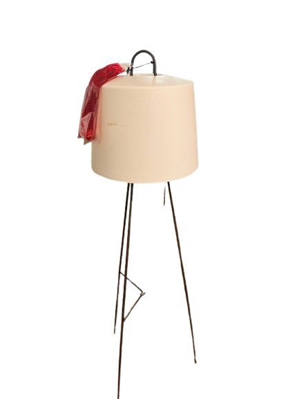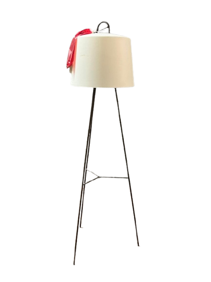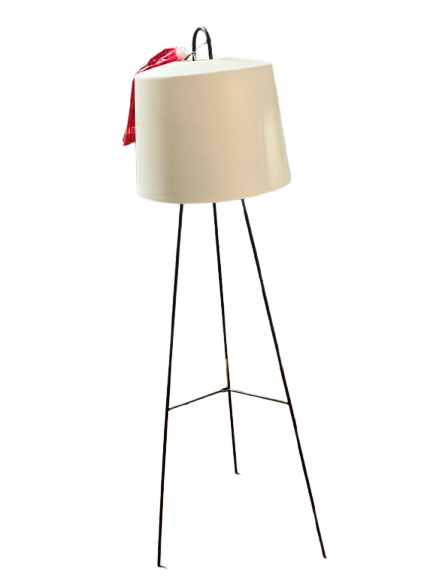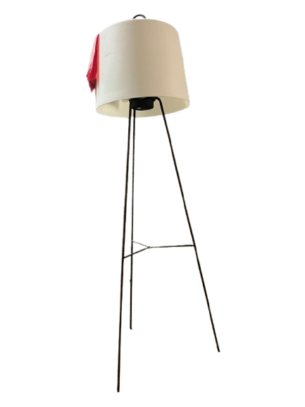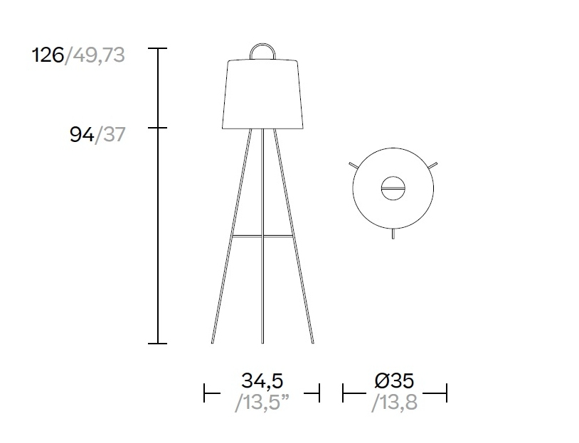 Candeeiro de pé com uma estrutura metálica minimalista e um abat-jour em tom branco. O artigo pode ser utilizado tanto no interior como no exterior (IP65).